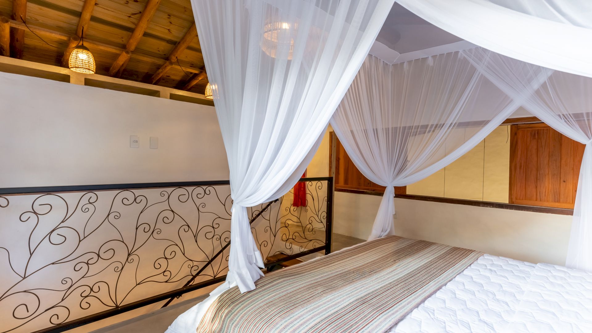 Todas as 4 suítes e o quarto no andar superior são equipadas com cama de King-Size que podem se transformar em duas camas de solteiro, ar condicionado e mosquiteiro. O quarto no andar superior utiliza no banheiro do piso térreo.