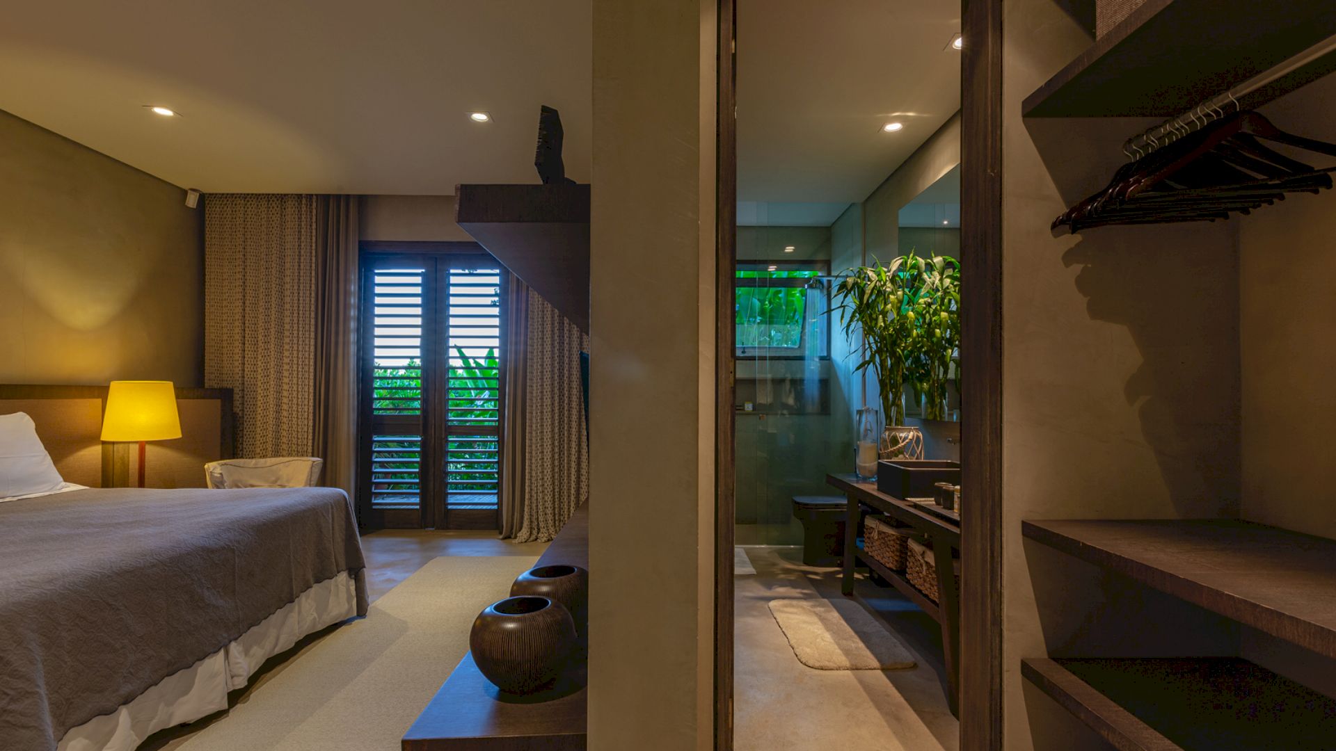 • Suíte master com cama king-size, closet integrado ao banheiro e varanda privativa