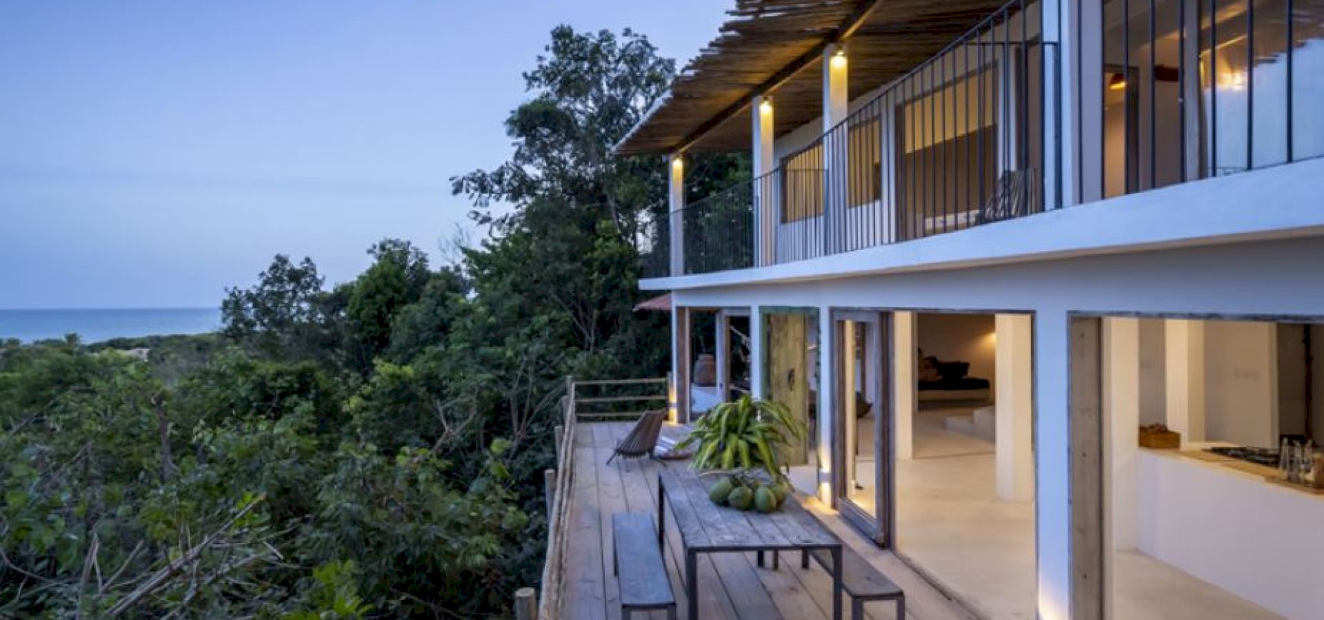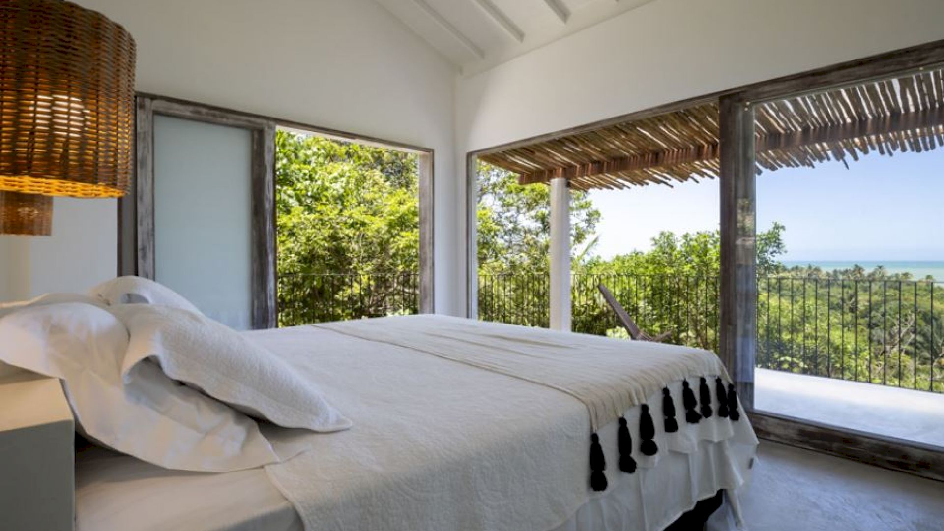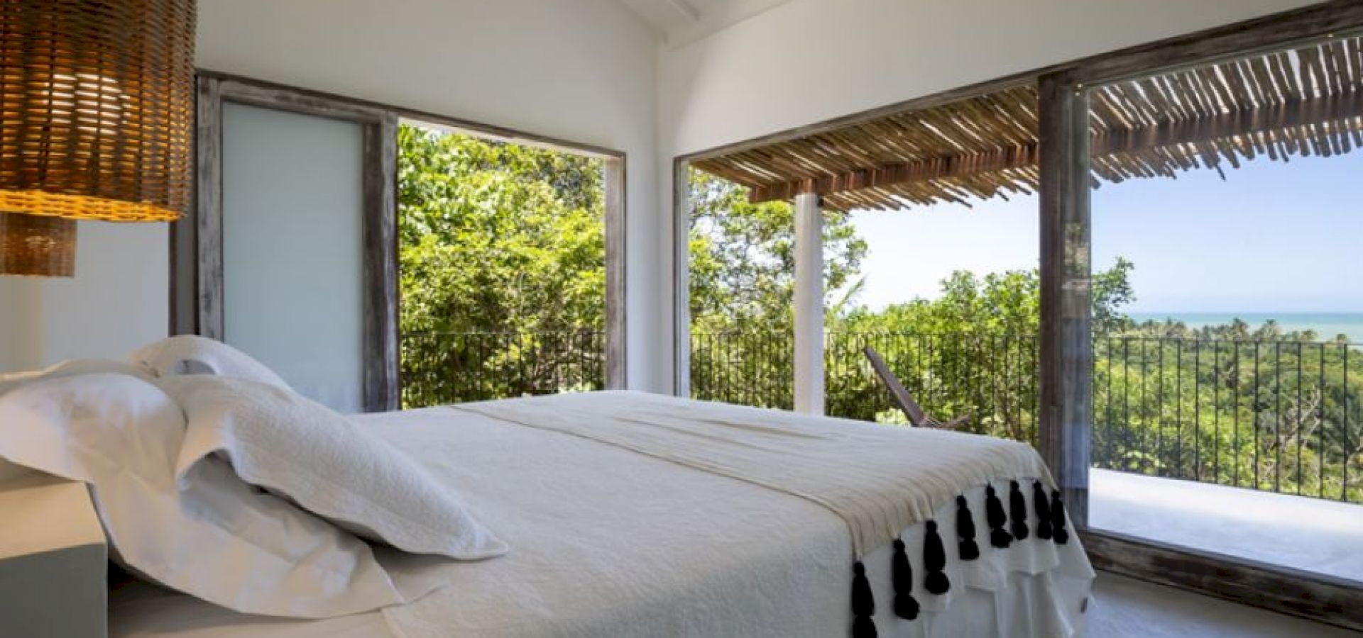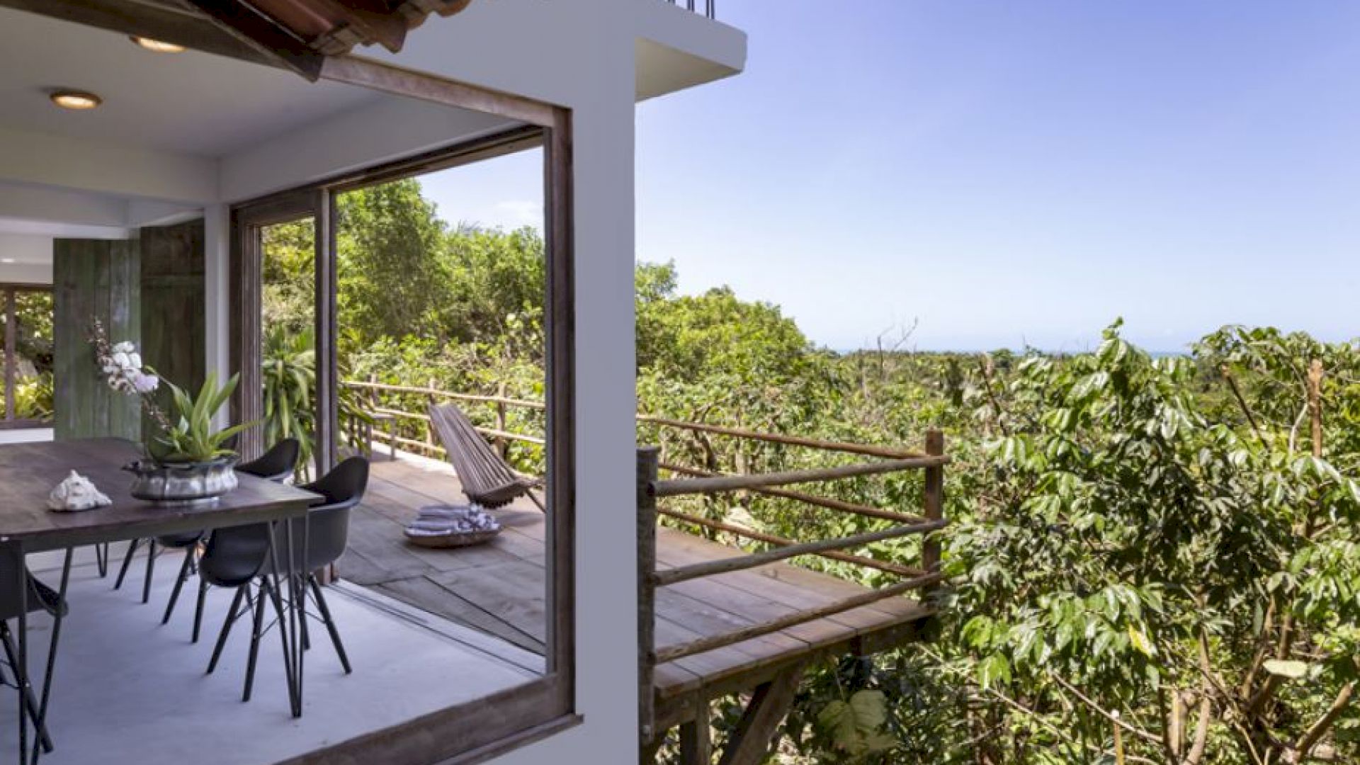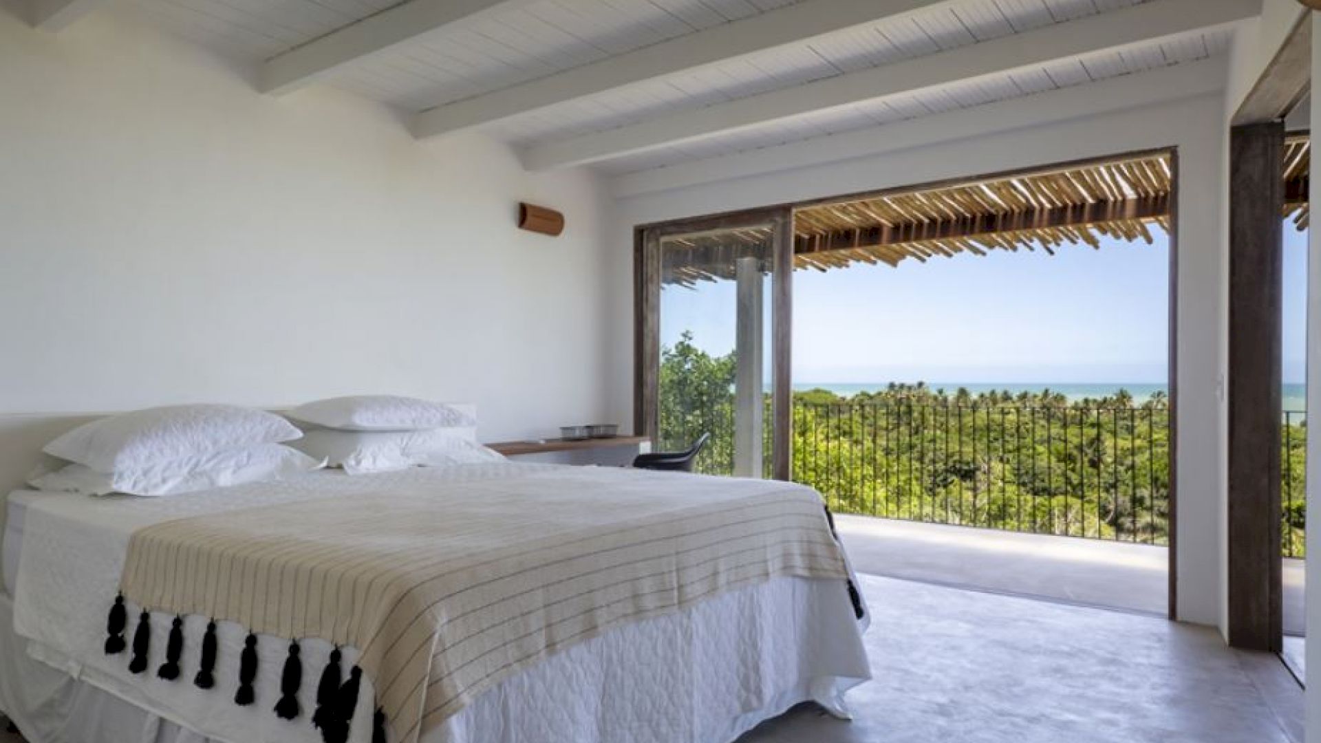 A Villa Praia dos Nativos 01, situada na encantadora Praia dos Nativos em Trancoso, com arquitetura e interior minimalista tropical, possui vista para o mar e mata, de todos os cômodos. Em um terreno de 2500m² com 250m² de área construída, a casa está idealmente preparada para acomodar até quatro hóspedes em um ambiente sofisticado e acolhedor. Embora não esteja à beira-mar, sua proximidade com a praia e a linda vista para o oceano permitem uma experiência de contato direto com a beleza da região. As duas suítes amplas, ambas equipadas com camas king size plus, oferecem uma experiência de descanso única, com a suíte principal destacando-se pelo conforto adicional de uma relaxante hidromassagem.
