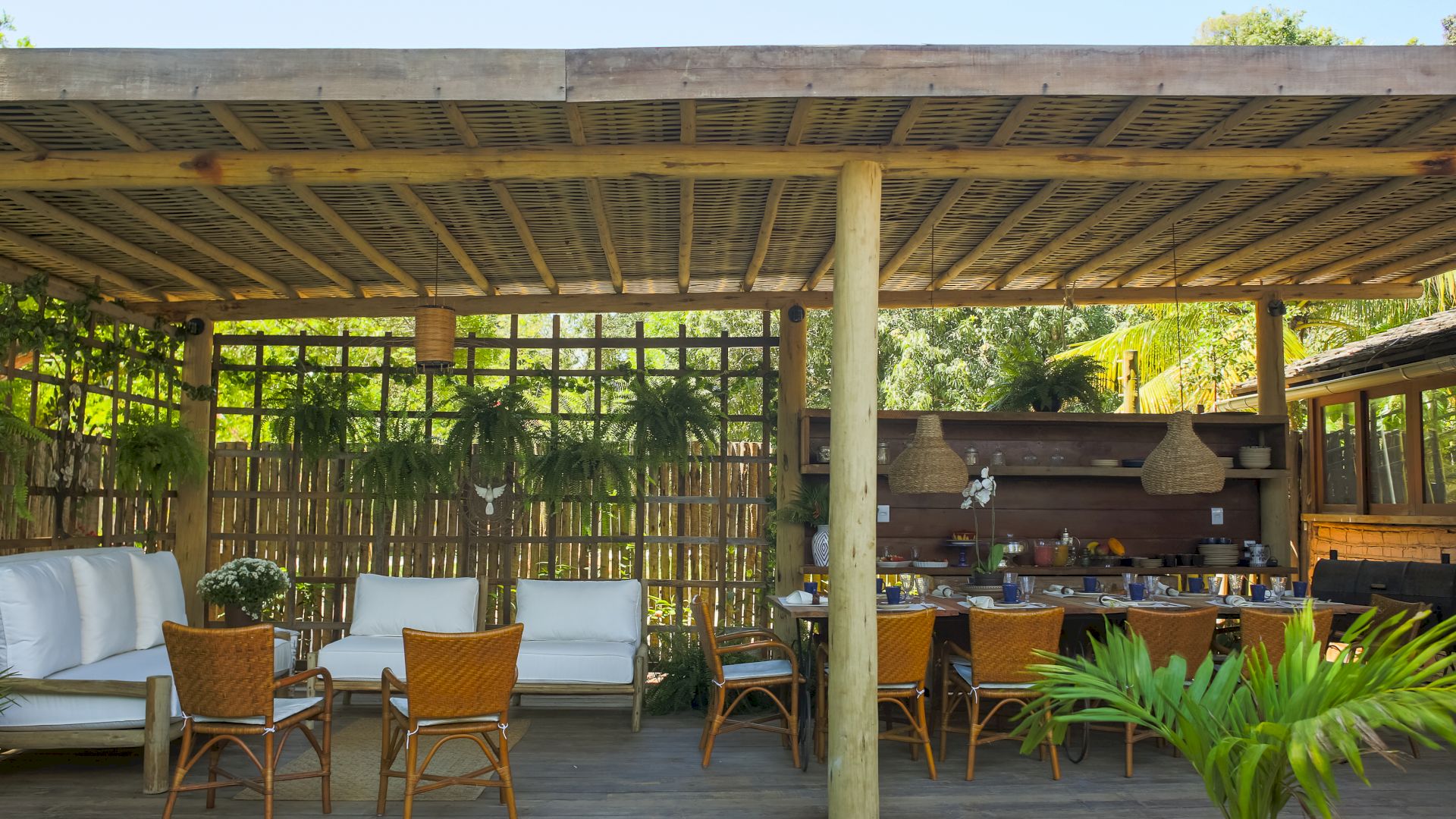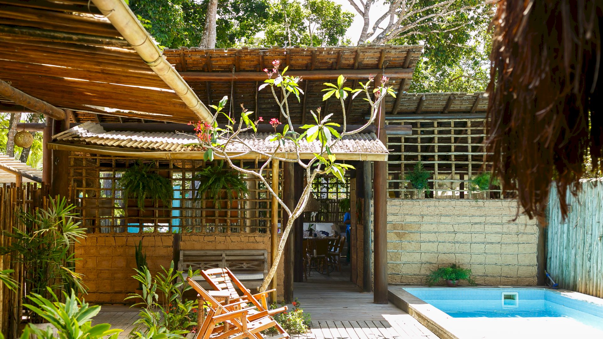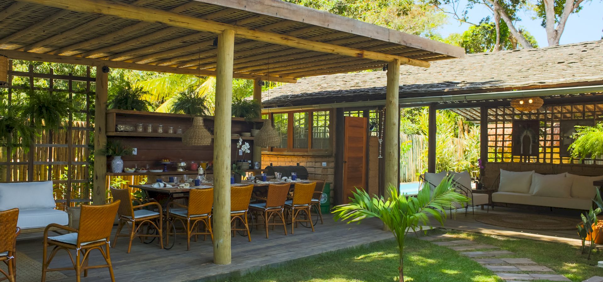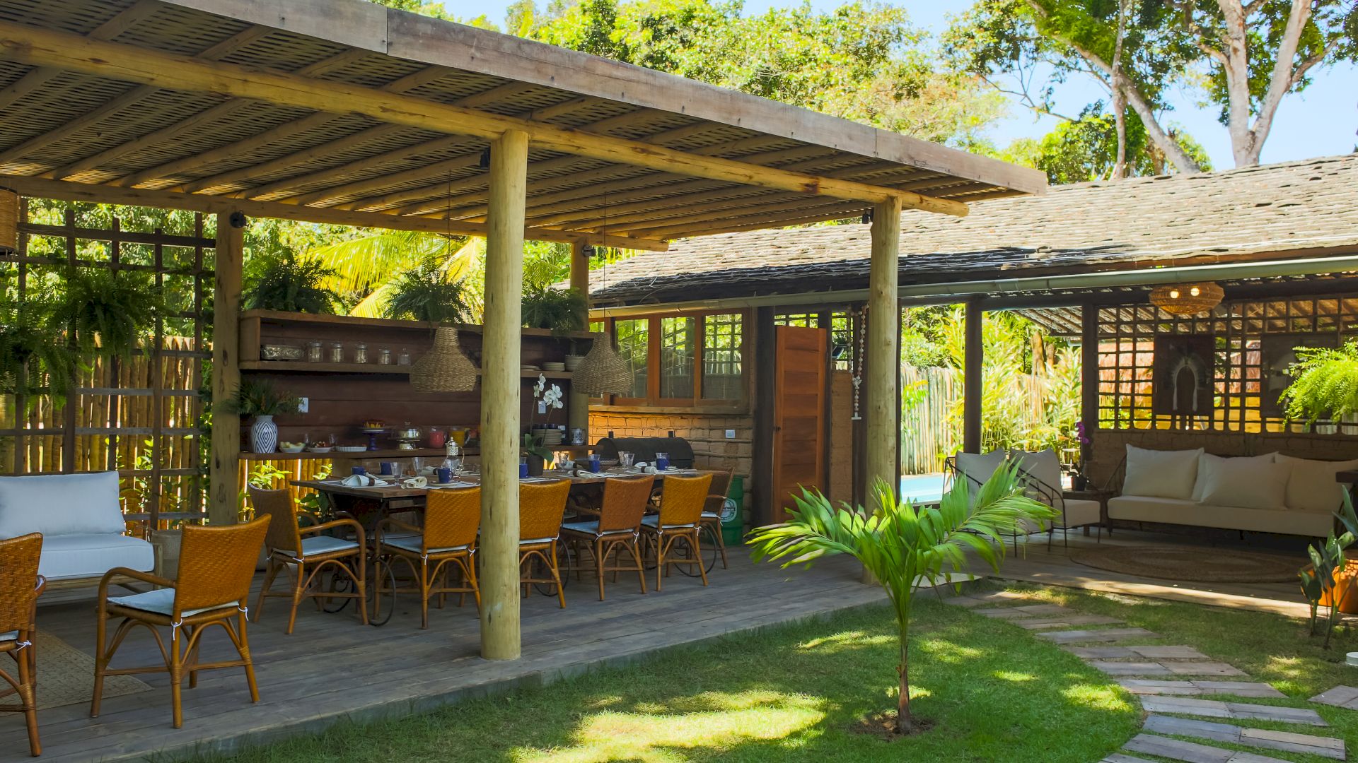Do lado de fora, uma piscina refrescante e um deck relaxante completam o cenário, convidando a desfrutar os dias ensolarados de Trancoso. A Villa Colina 05 combina simplicidade e elegância, criando o ambiente perfeito para memórias inesquecíveis em um cenário único.