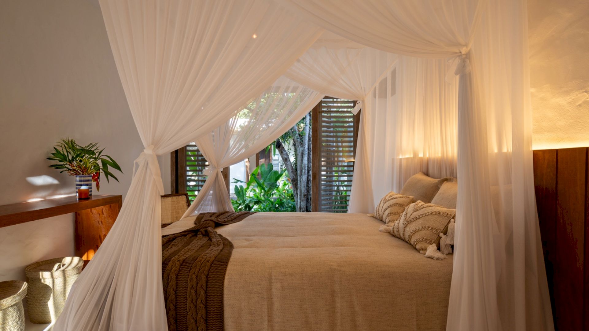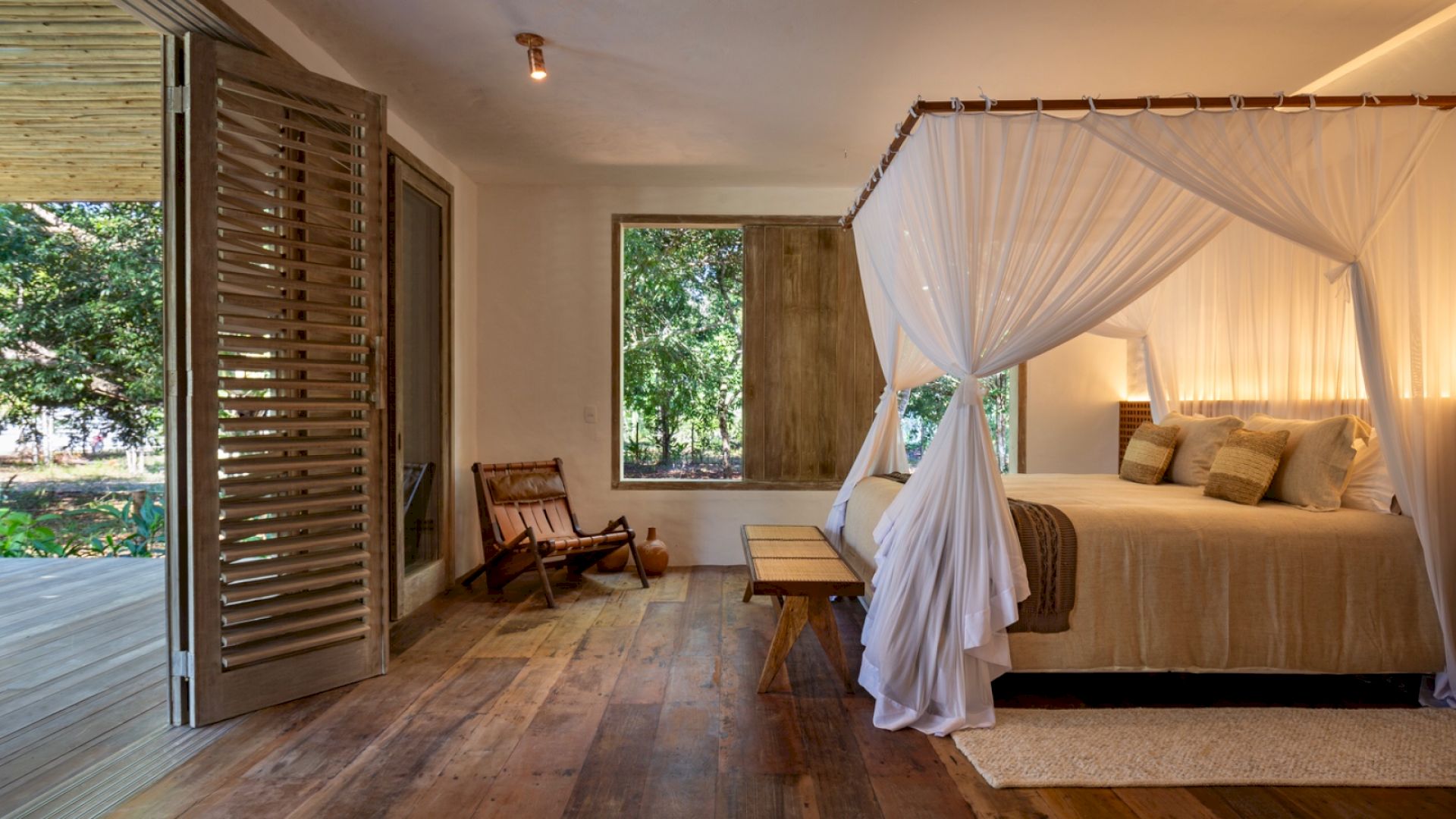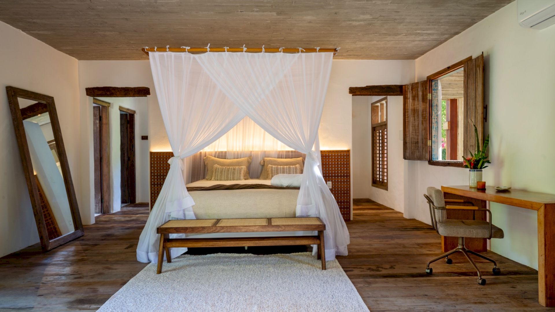 • Suíte master interna: cama king, mosquiteiro, dois aparelhos de ar-condicionado (incluindo um no closet), banheira relaxante e saída direta para a piscina