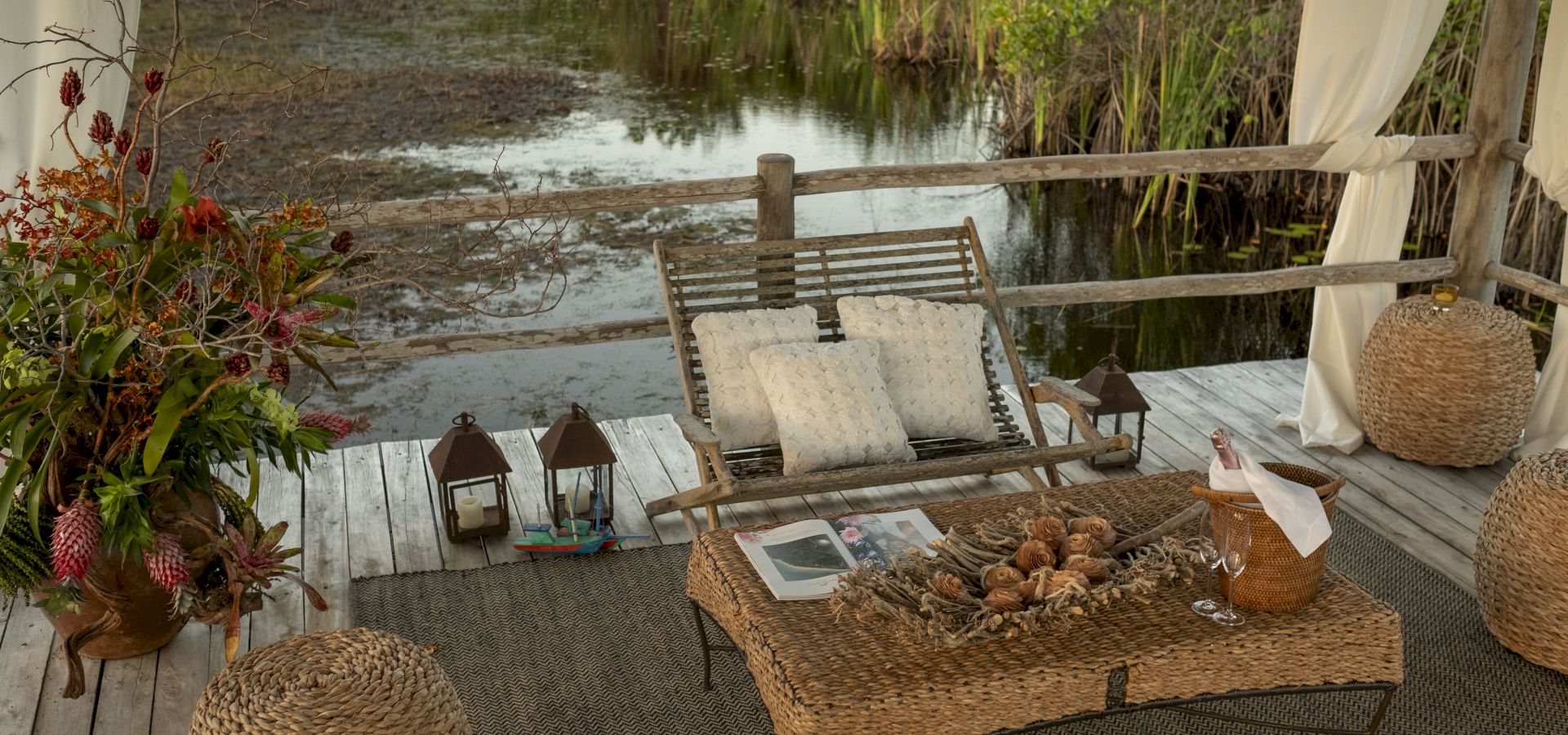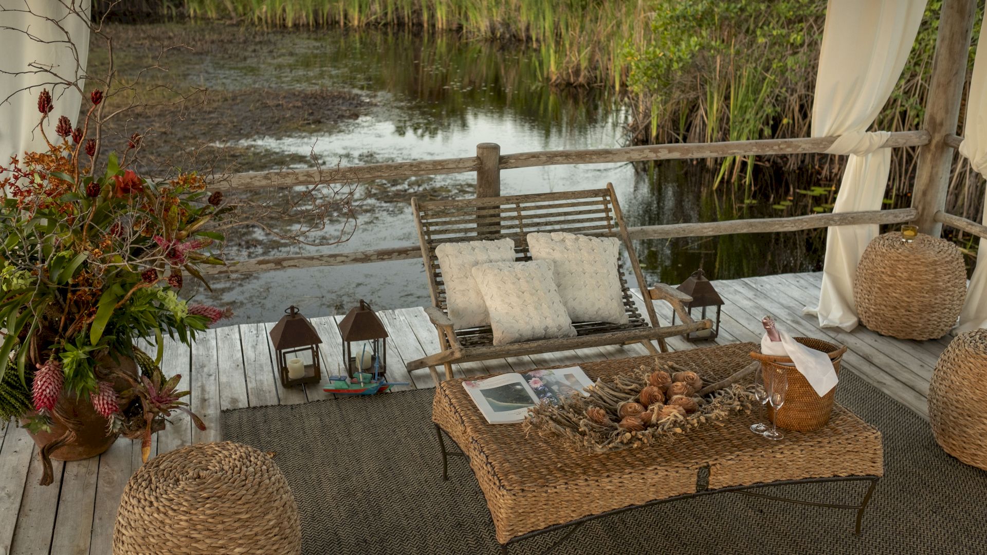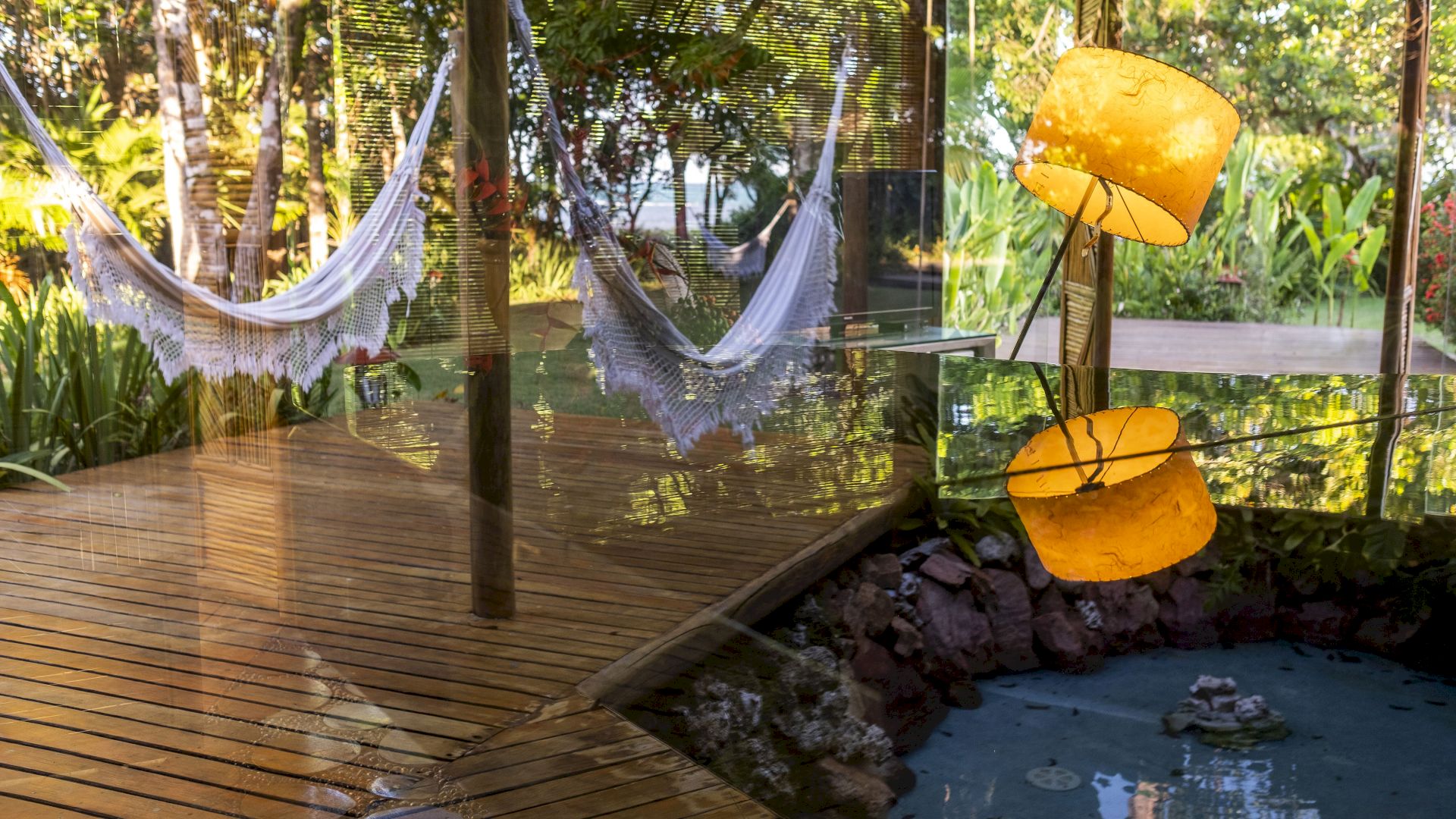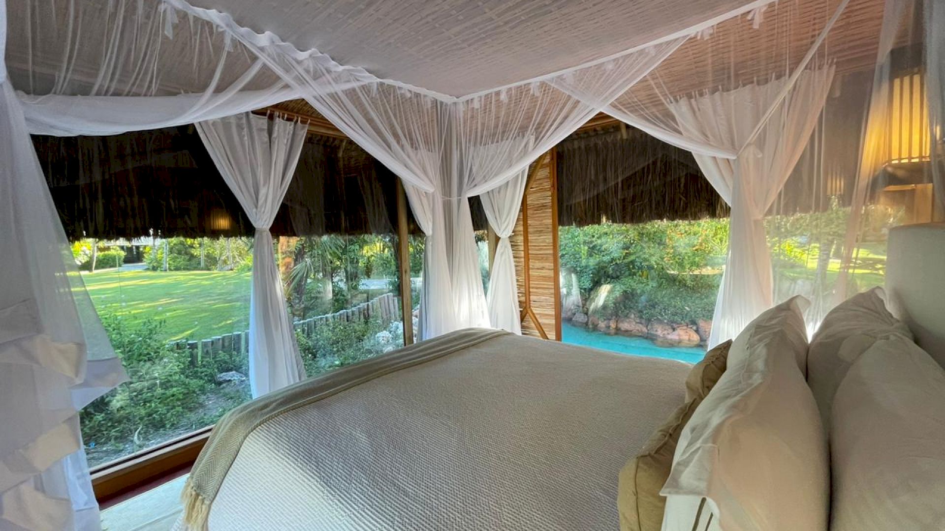 Conta com uma suíte no andar superior, com cama de casal, varanda e frigobar, e duas suítes no térreo: uma com cama de casal, varanda e frigobar, e outra envidraçada com cama de casal e vista para o jardim. Este bungalow possui um living aconchegante com sofás, TV e uma ampla vista para os jardins rodeados por lagos.