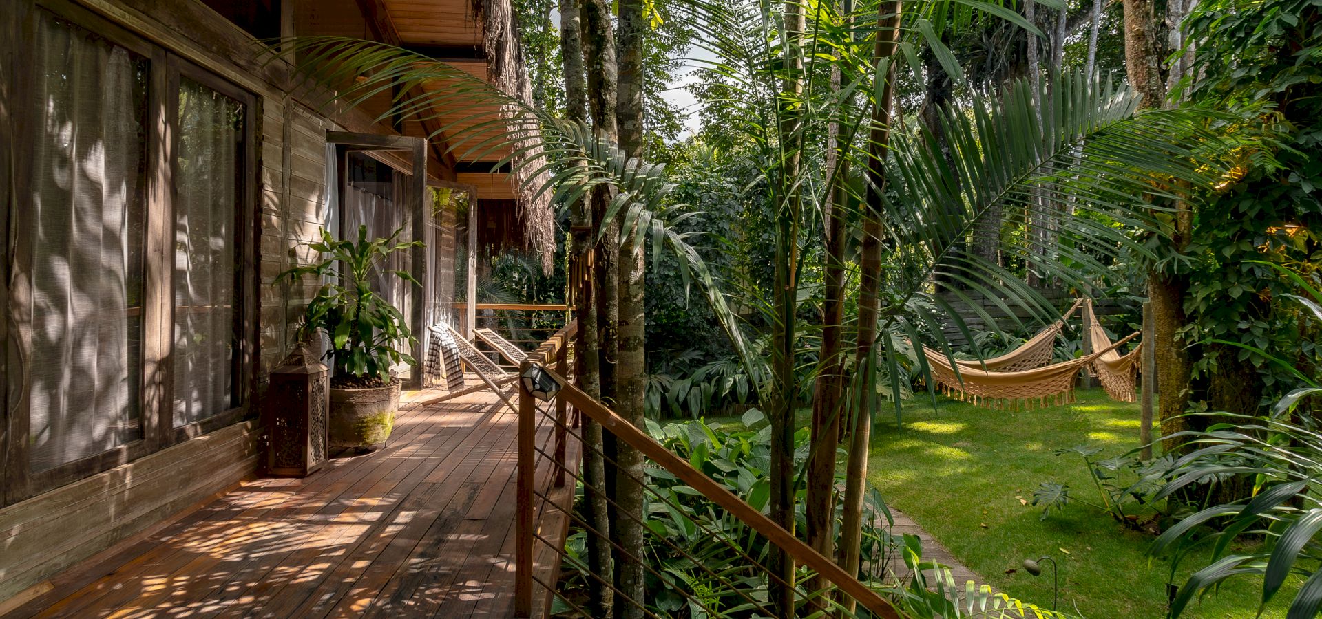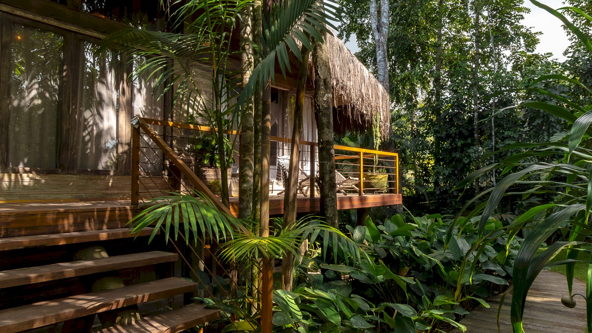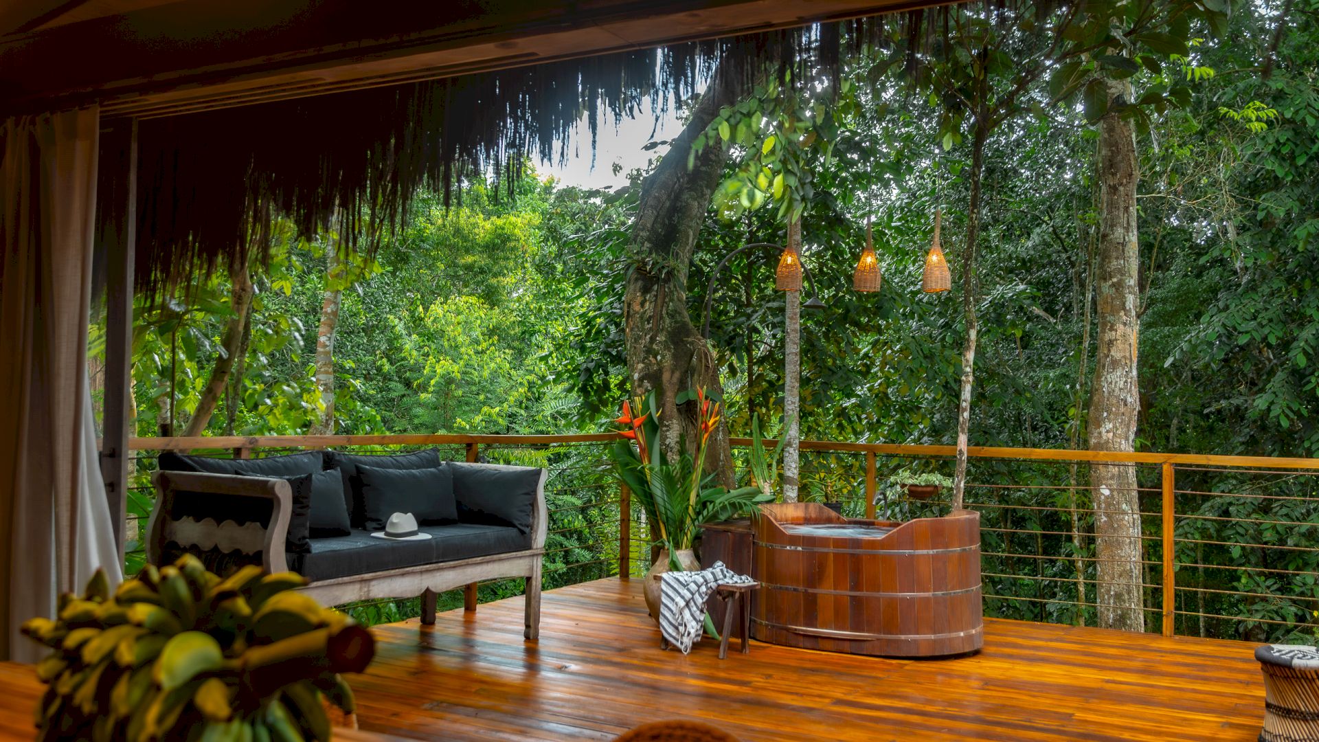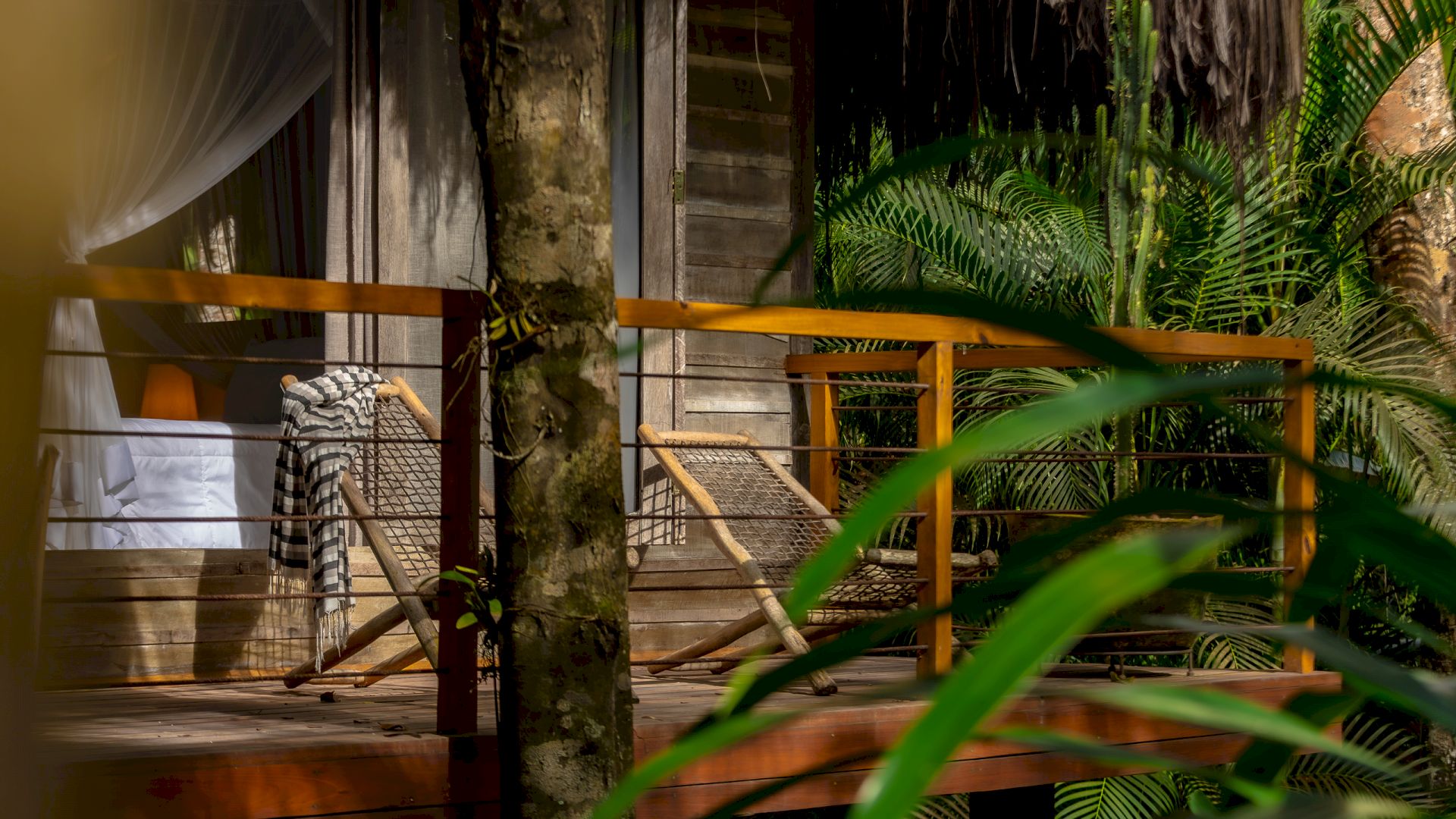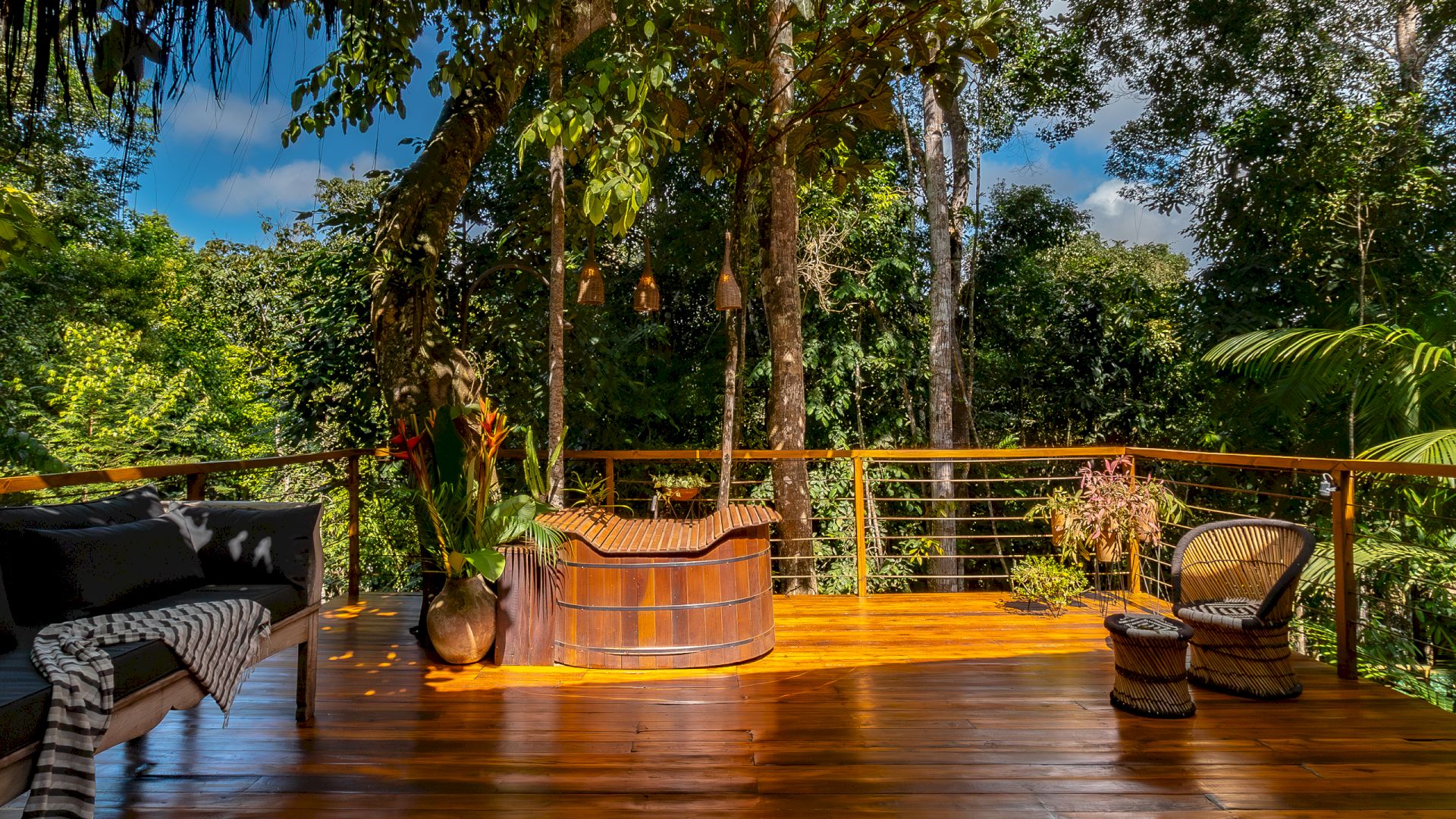 Com sofá de descanso, ofurô de alta qualidade e decoração com vasos artesanais de Trancoso, o espaço se abre para uma vista deslumbrante da mata e dos bangalôs ao redor, um cenário ideal para momentos de contemplação e tranquilidade.