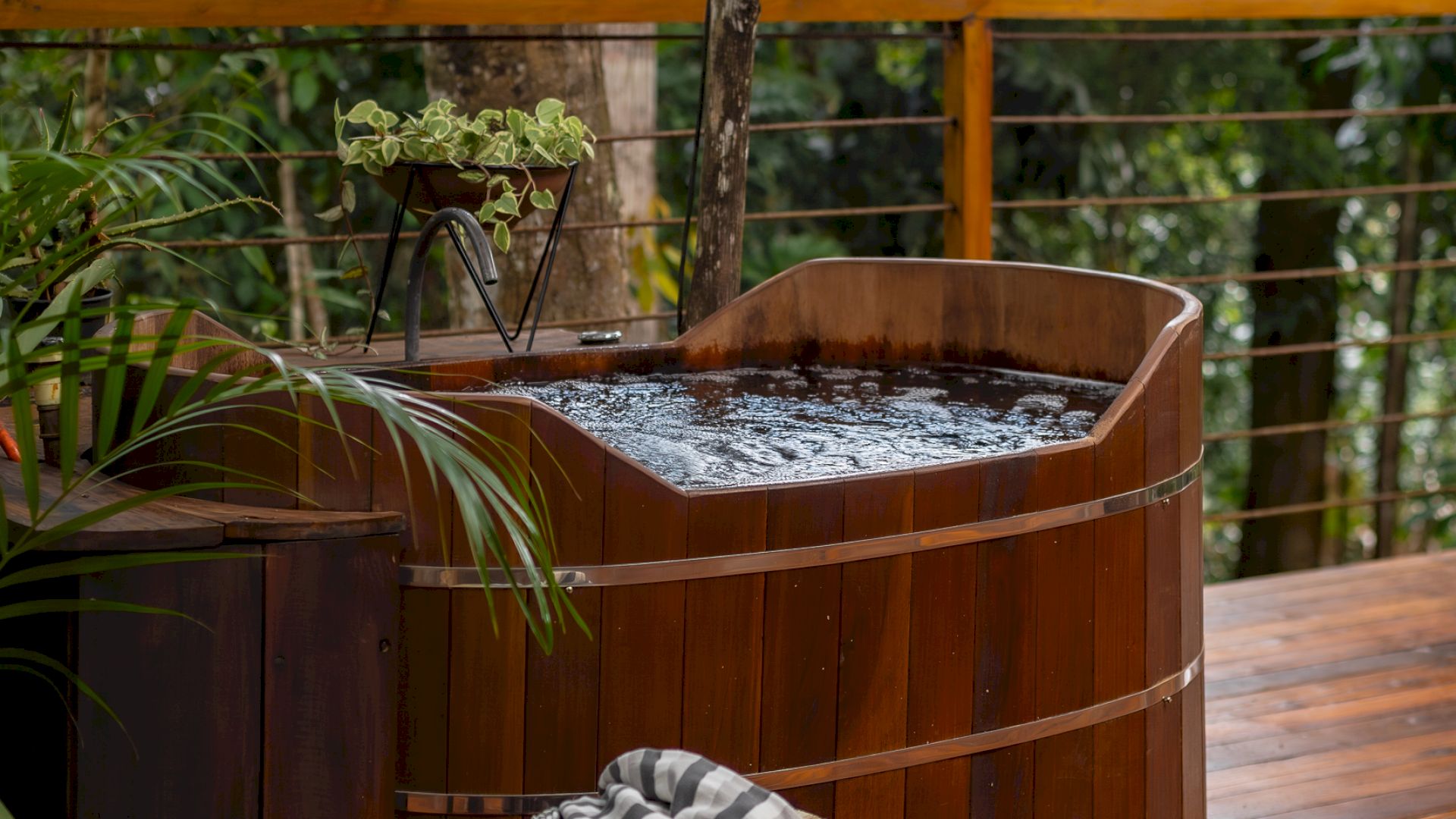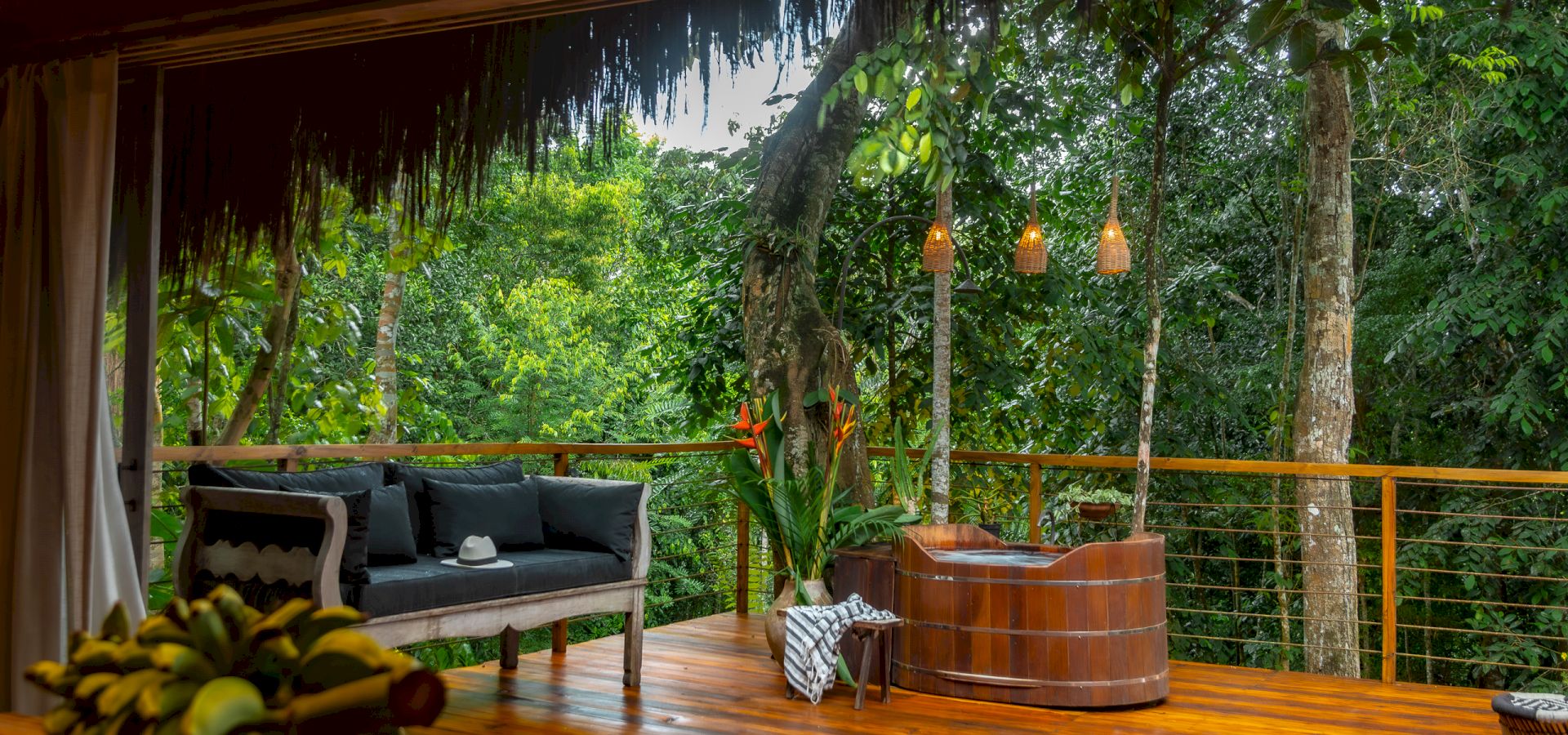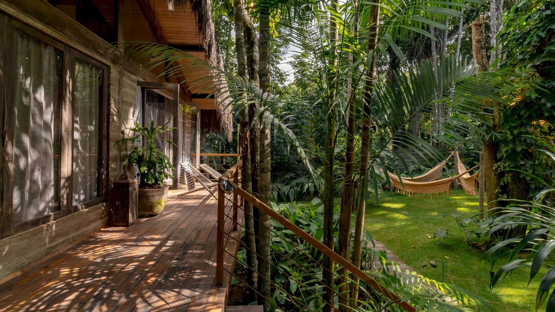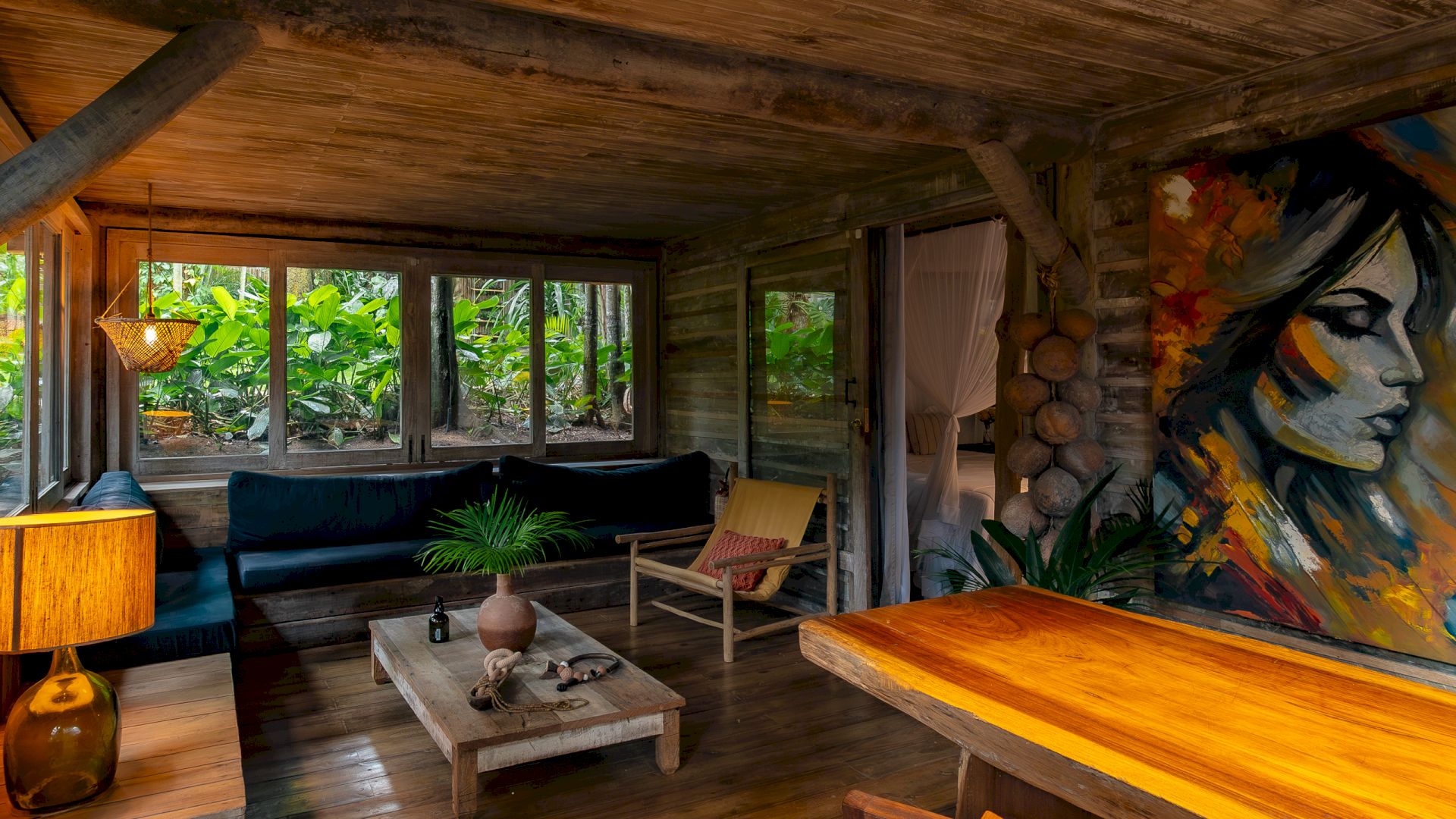 Com sofá de descanso, ofurô de alta qualidade e decoração com vasos artesanais de Trancoso, o espaço se abre para uma vista deslumbrante da mata e dos bangalôs ao redor, um cenário ideal para momentos de contemplação e tranquilidade.