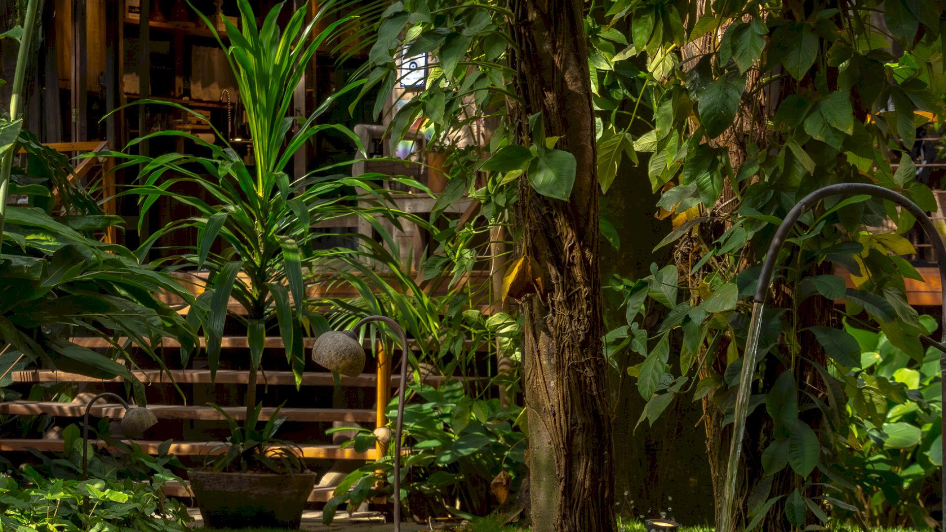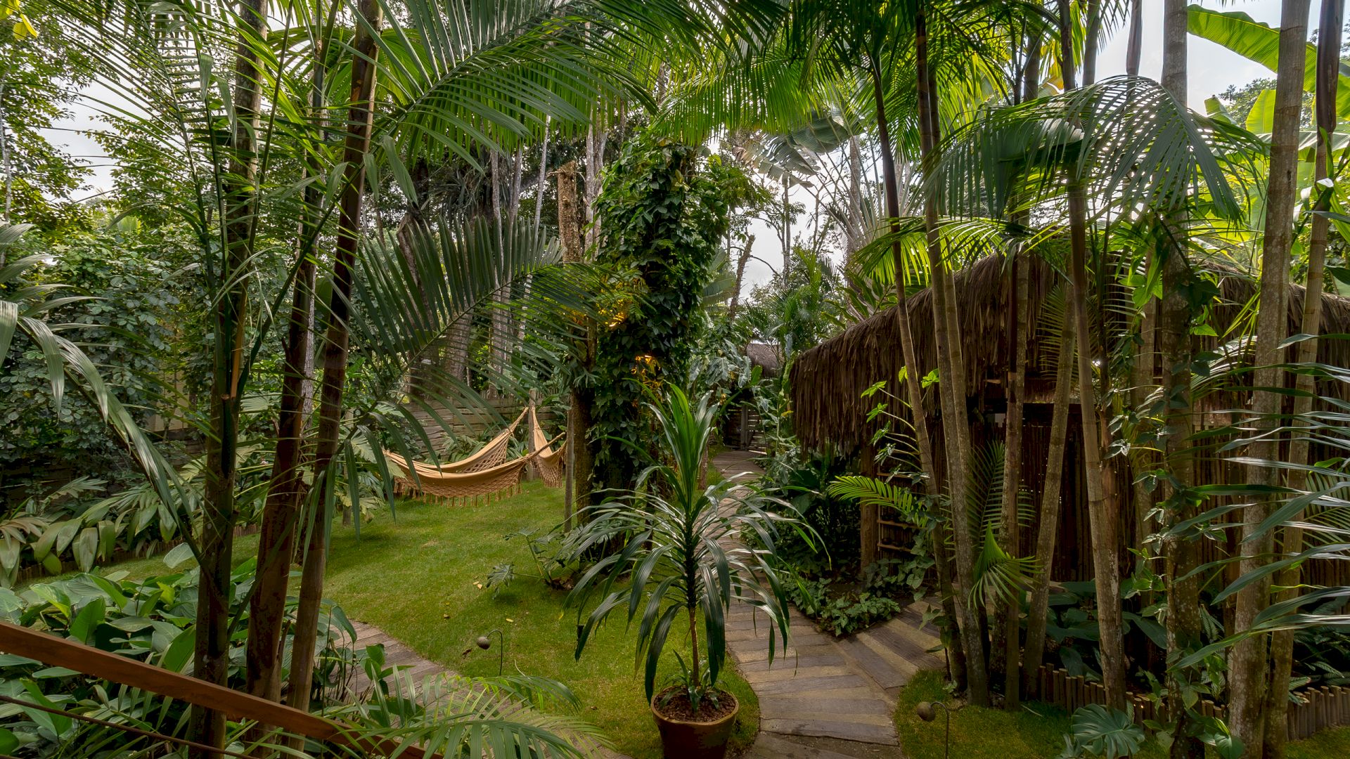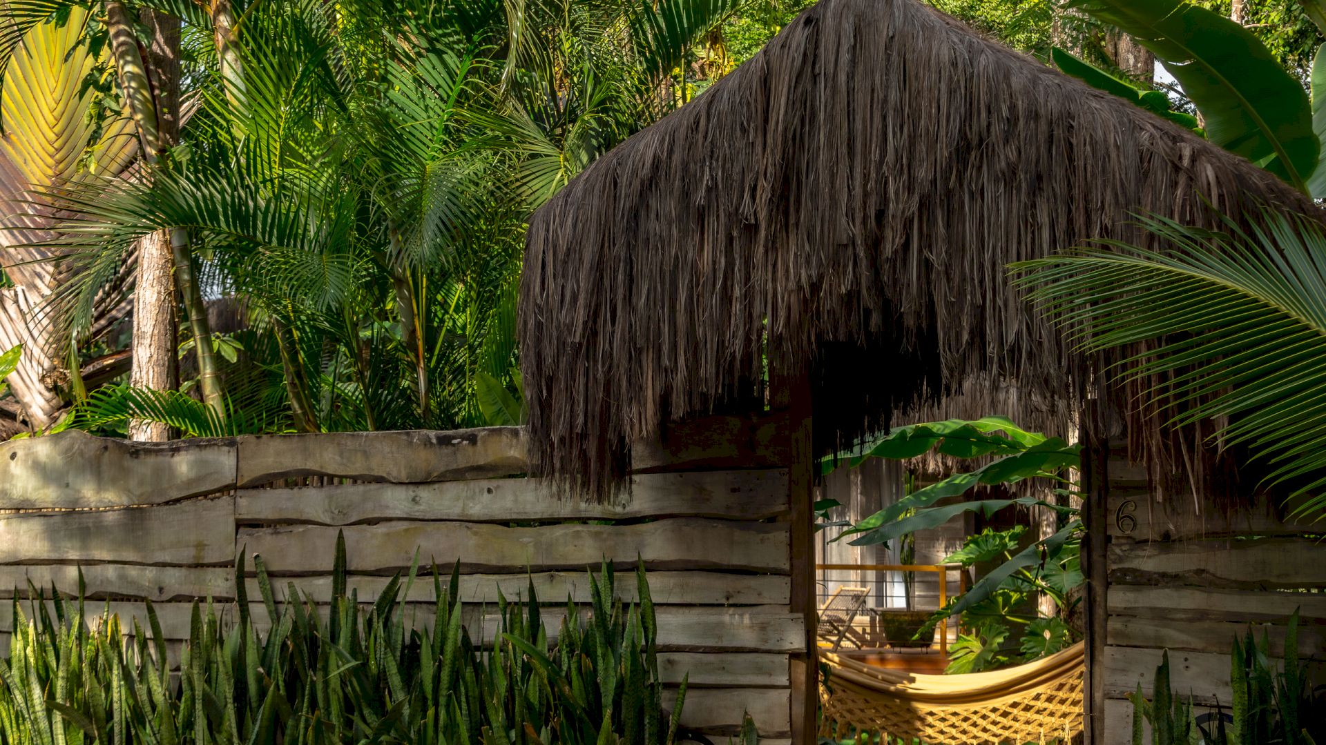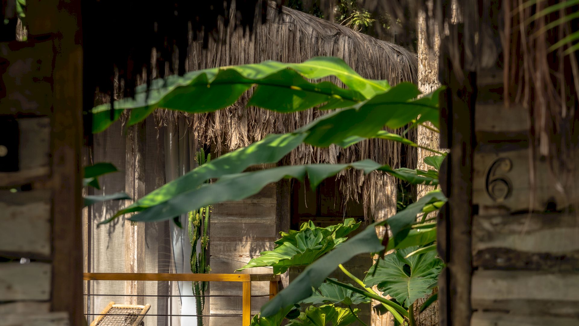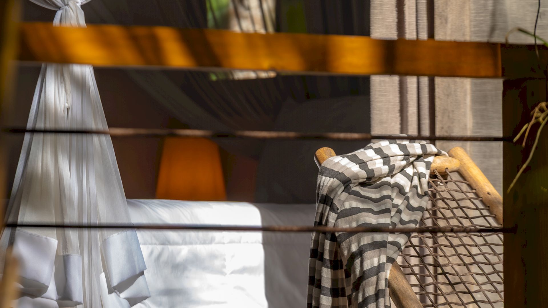 Com sofá de descanso, ofurô de alta qualidade e decoração com vasos artesanais de Trancoso, o espaço se abre para uma vista deslumbrante da mata e dos bangalôs ao redor, um cenário ideal para momentos de contemplação e tranquilidade.