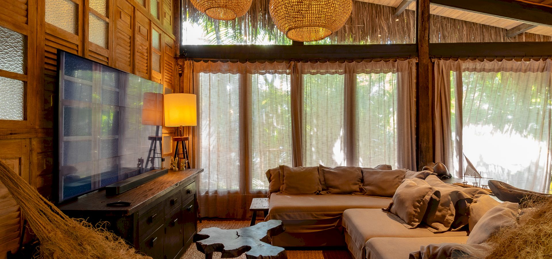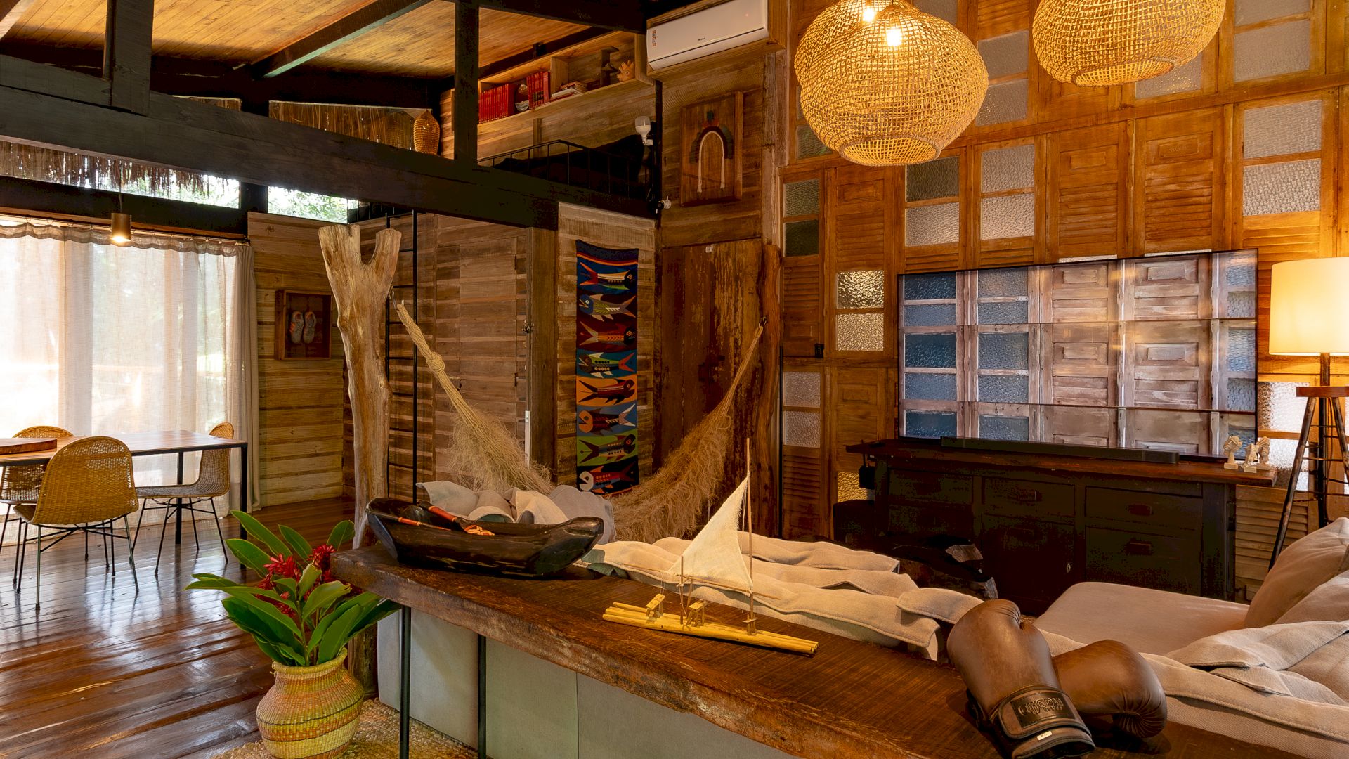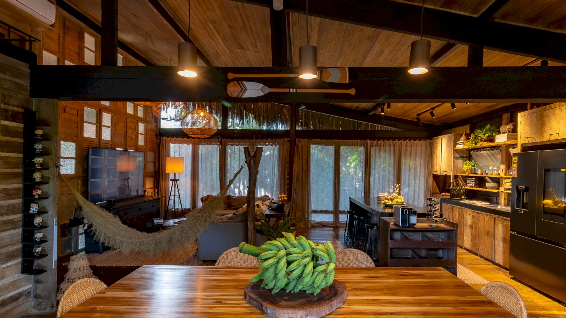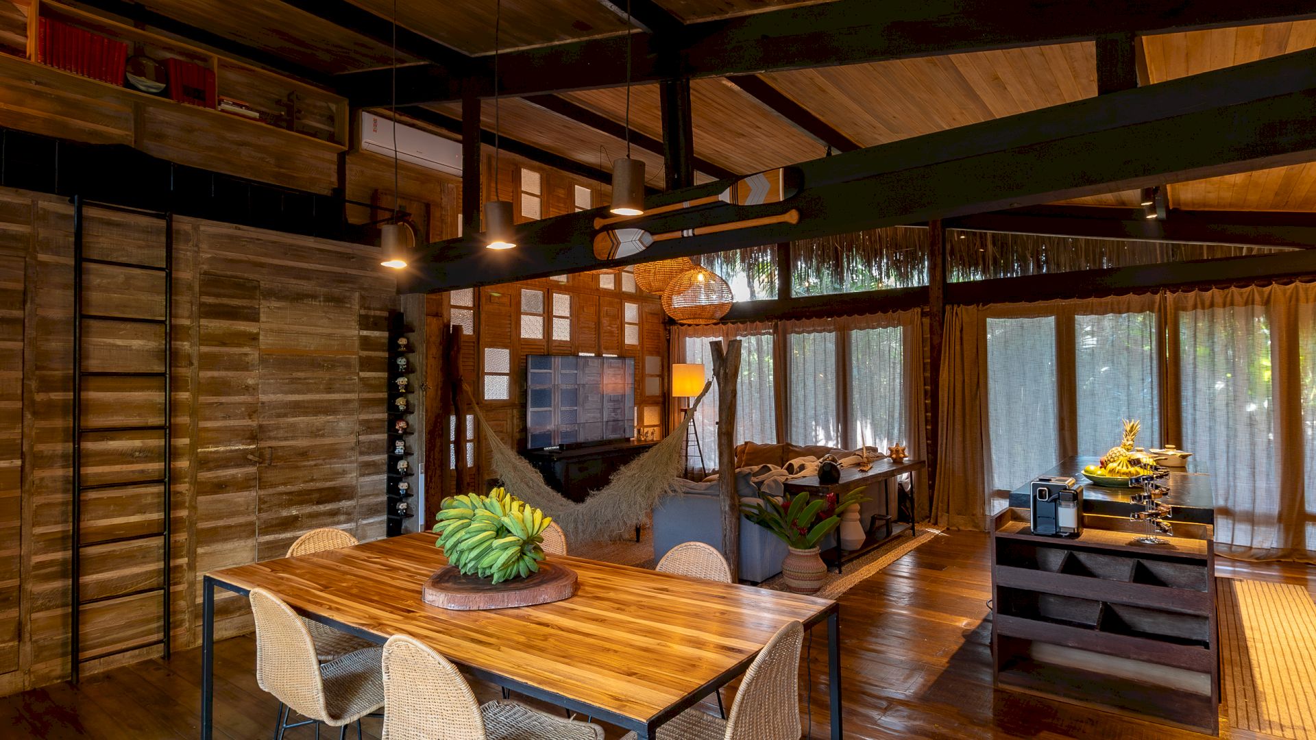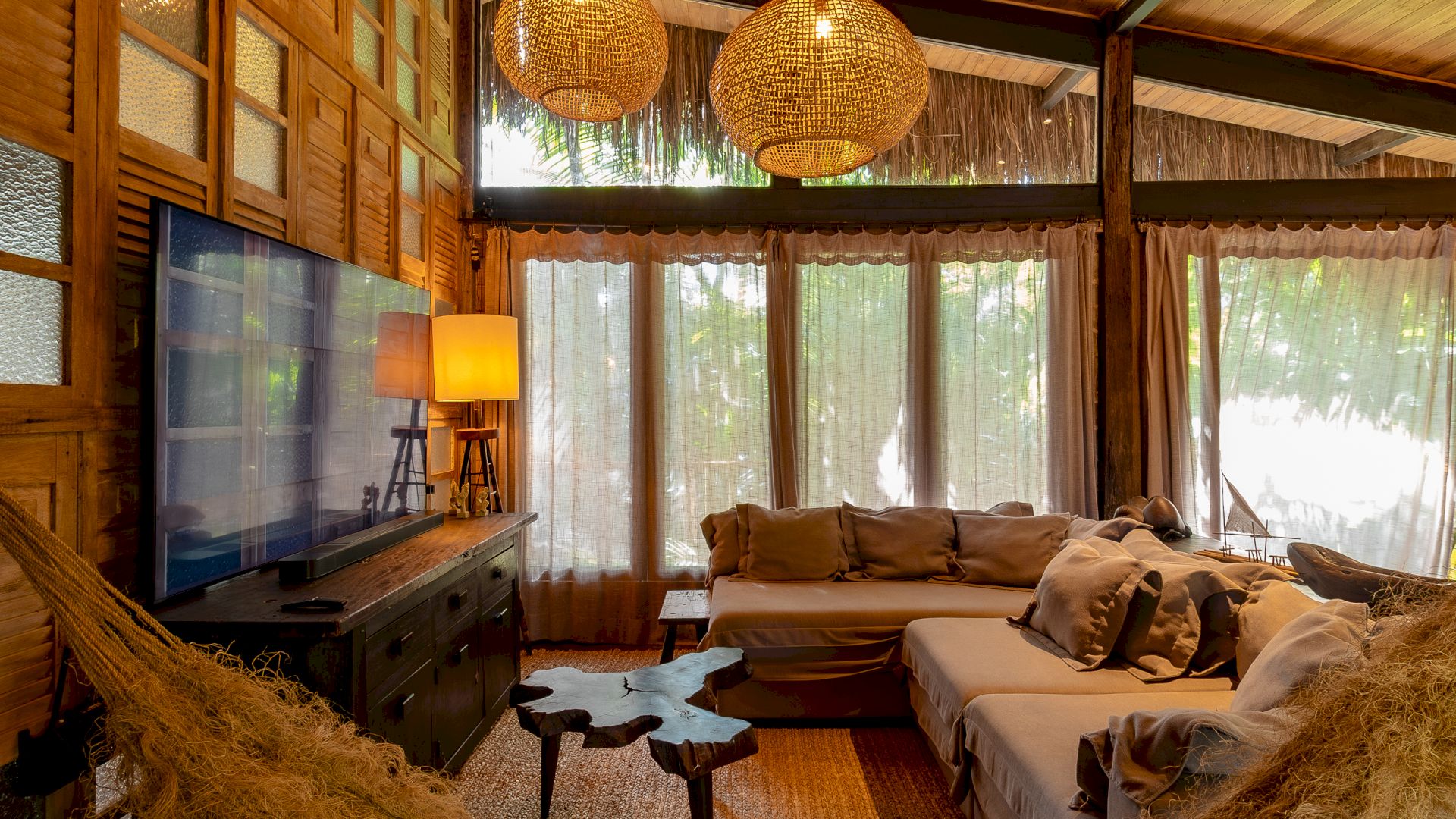 A sala principal, com ar-condicionado, sofá espaçoso e rede artesanal indígena, cria uma atmosfera de aconchego e autenticidade. Para os momentos de entretenimento, uma TV de 82” e sistema de som JBL proporcionam uma experiência audiovisual completa.
