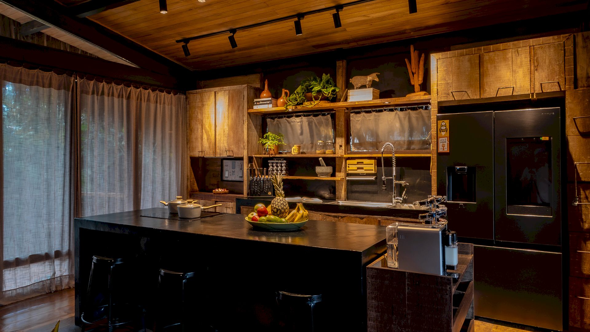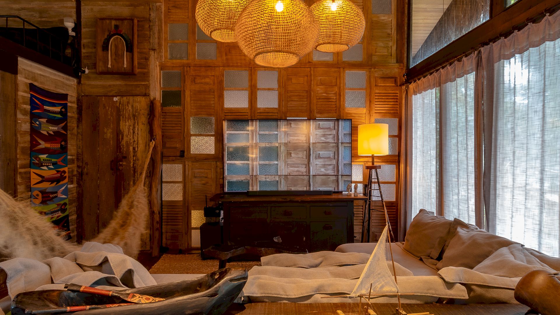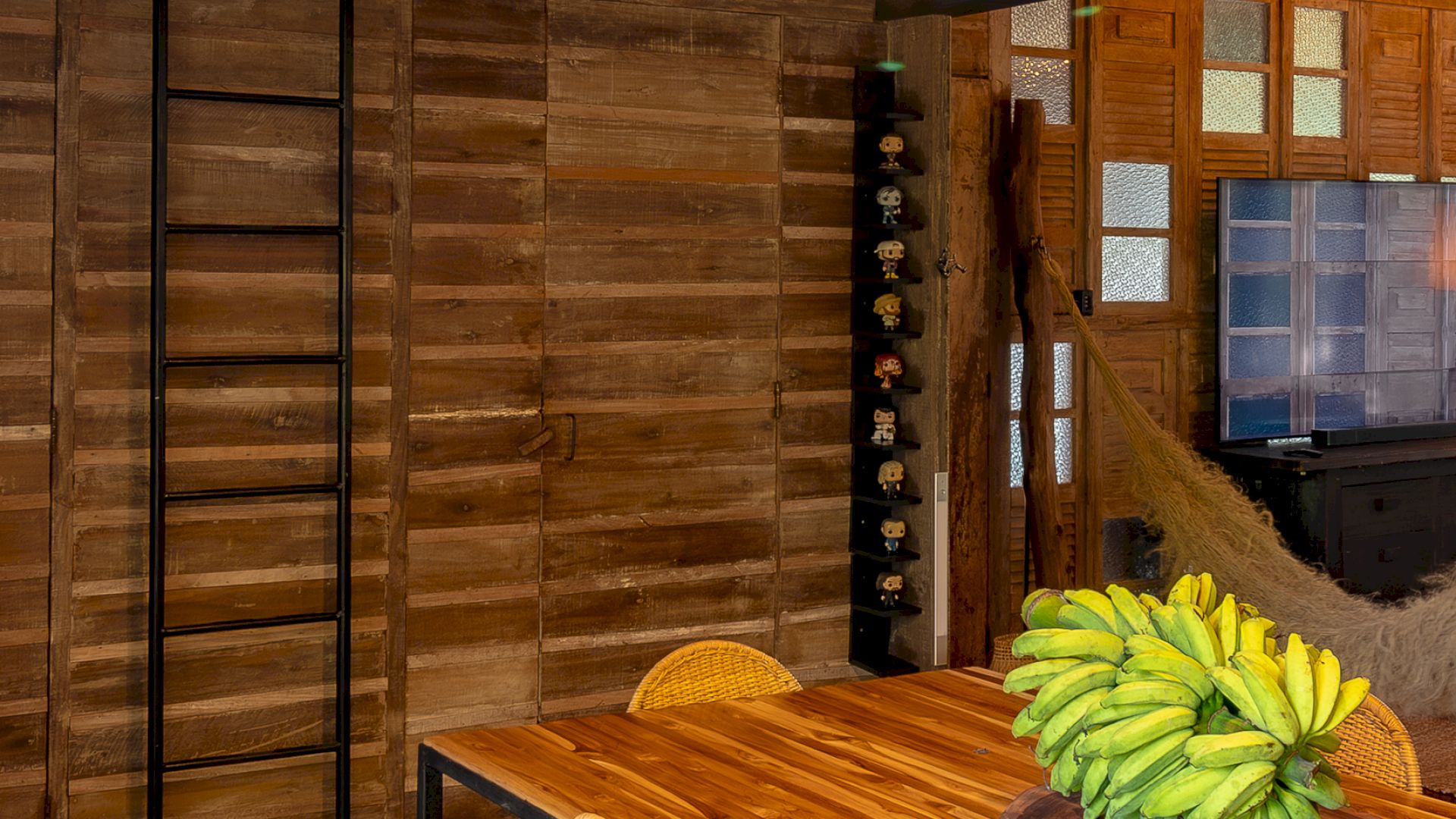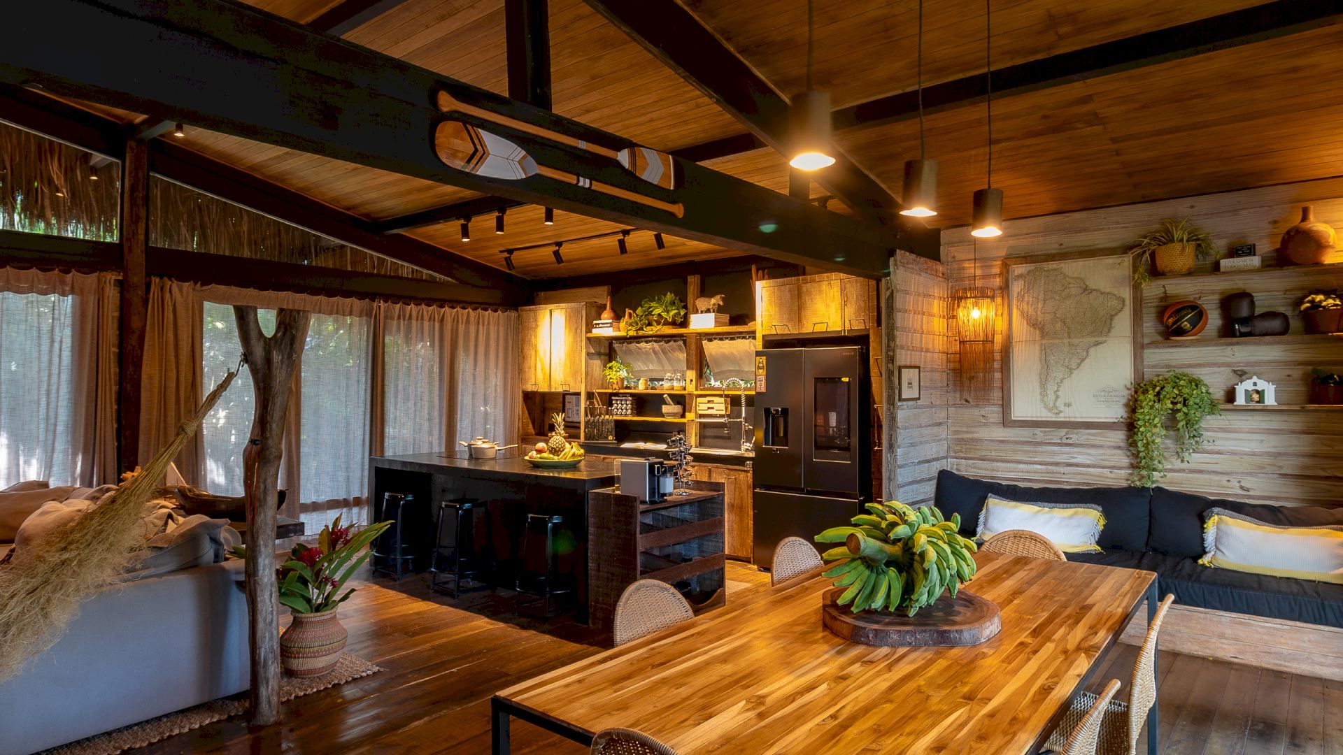 A sala principal, com ar-condicionado, sofá espaçoso e rede artesanal indígena, cria uma atmosfera de aconchego e autenticidade. Para os momentos de entretenimento, uma TV de 82” e sistema de som JBL proporcionam uma experiência audiovisual completa.