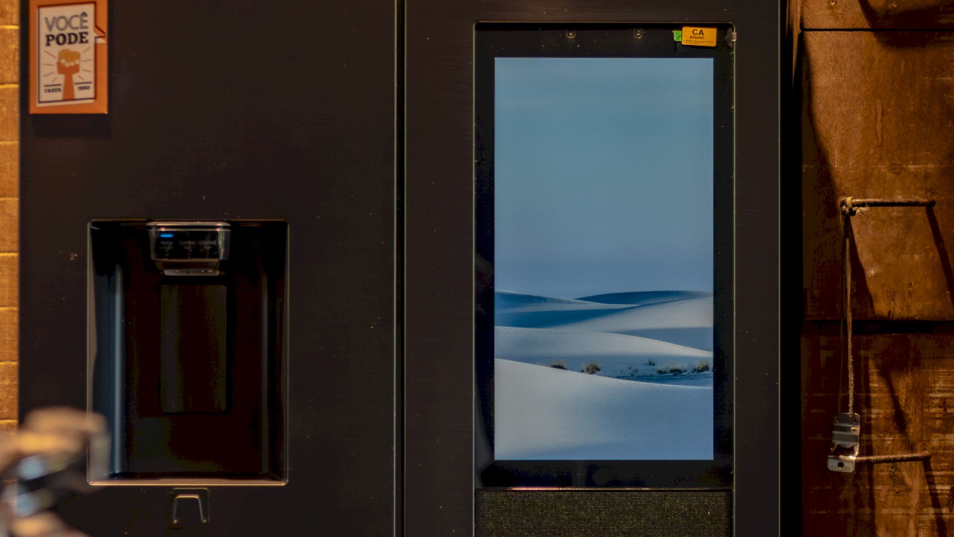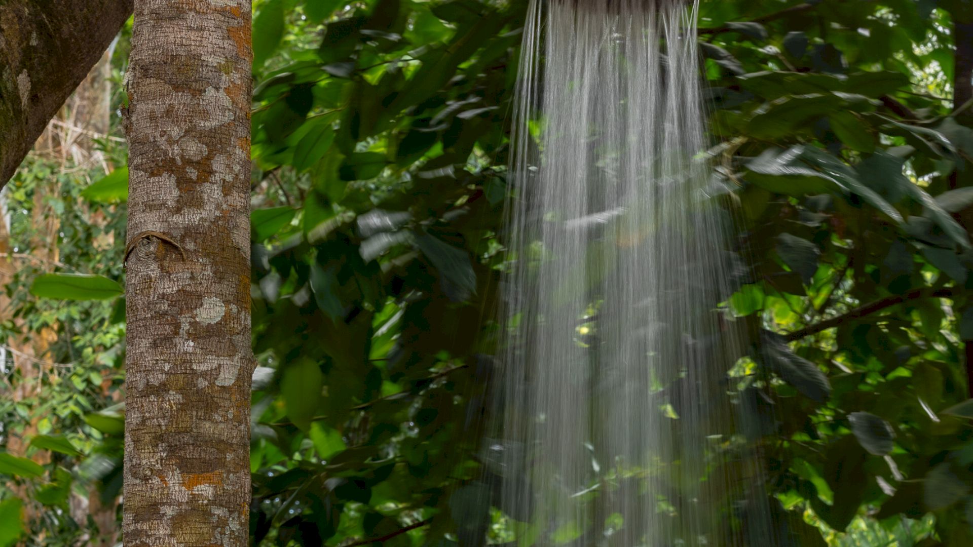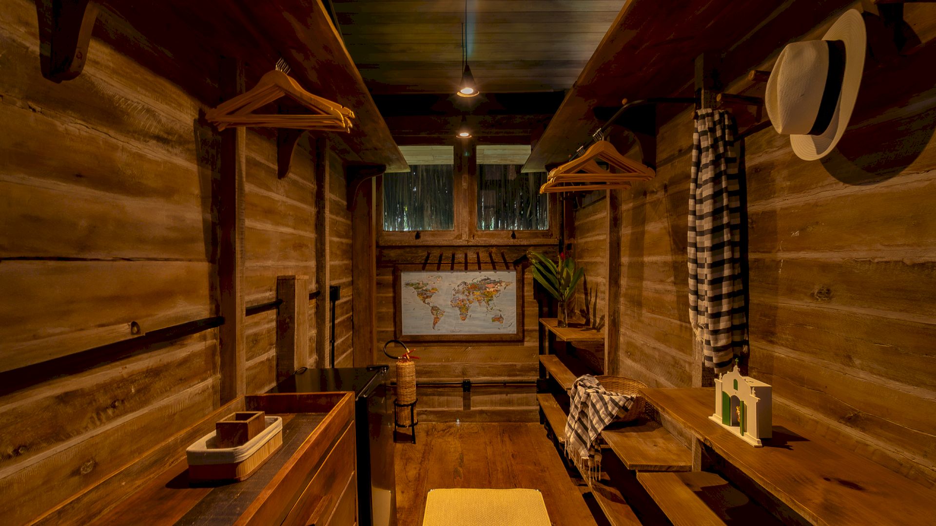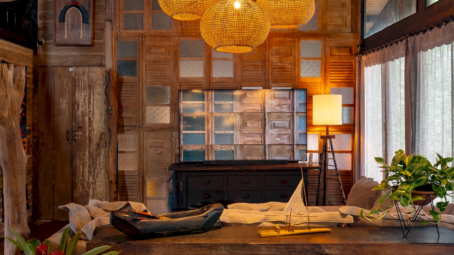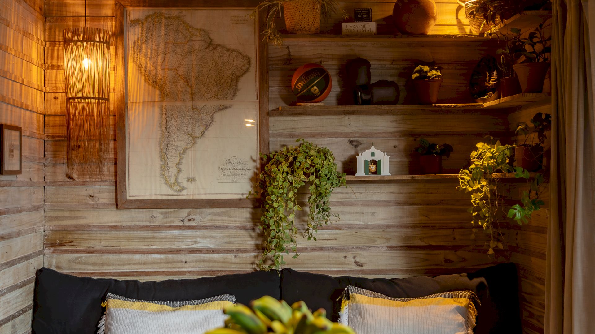 A sala principal, com ar-condicionado, sofá espaçoso e rede artesanal indígena, cria uma atmosfera de aconchego e autenticidade. Para os momentos de entretenimento, uma TV de 82” e sistema de som JBL proporcionam uma experiência audiovisual completa.