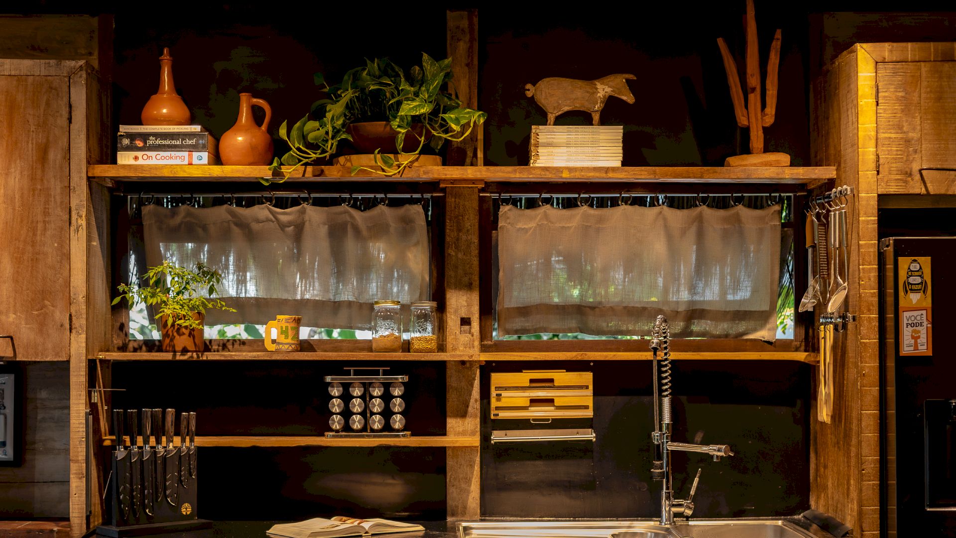 A cozinha é totalmente equipada com eletrodomésticos modernos, incluindo geladeira smart, cooktop por indução, forno, micro-ondas, airfryer, cafeteira e liquidificador, ideal para quem aprecia conforto e praticidade.