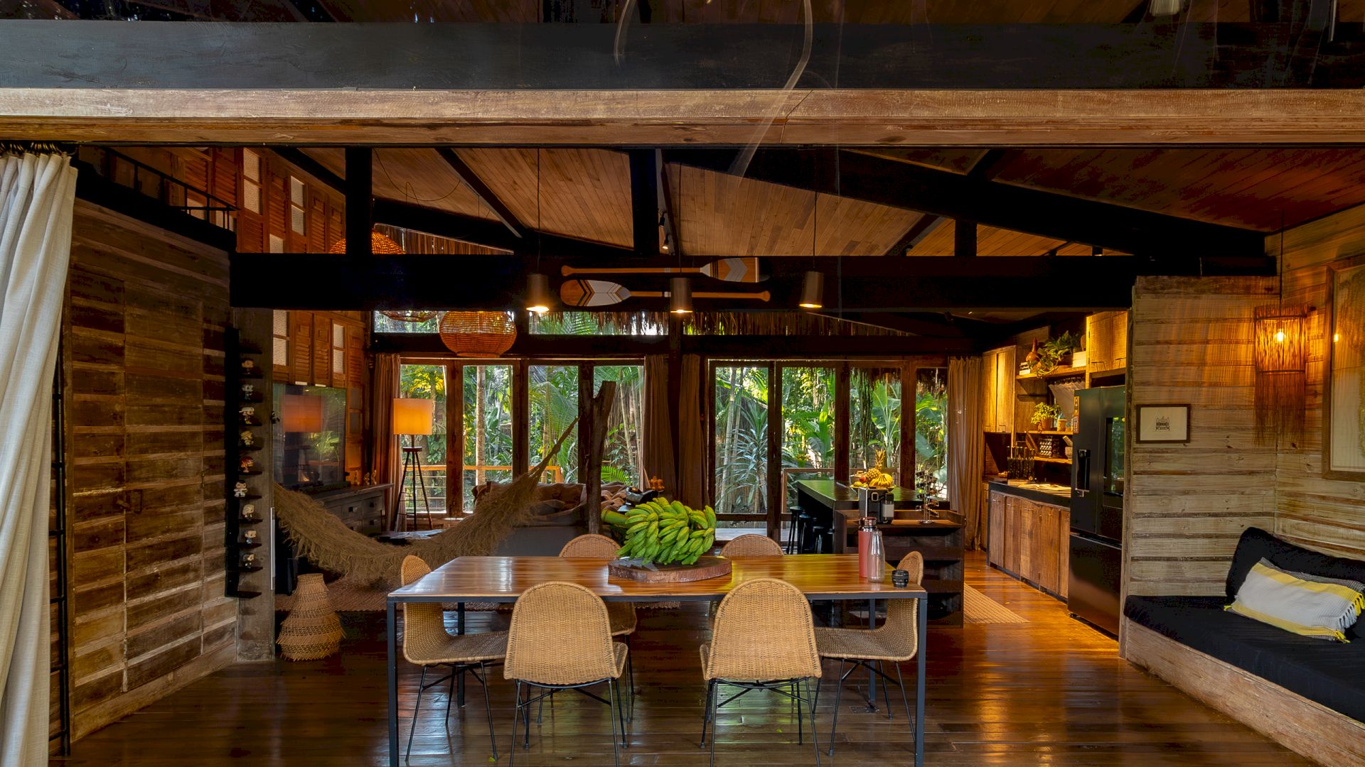 O ambiente de jantar é integrado à casa e oferece vista direta para o deck e para a mata nativa, perfeito para refeições em grupo e encontros descontraídos.