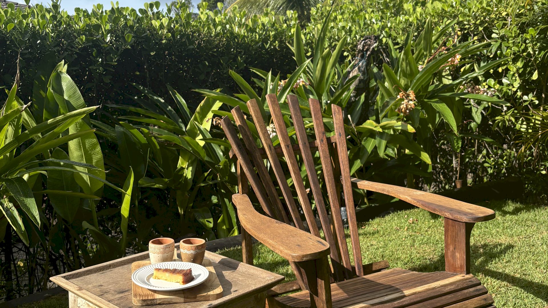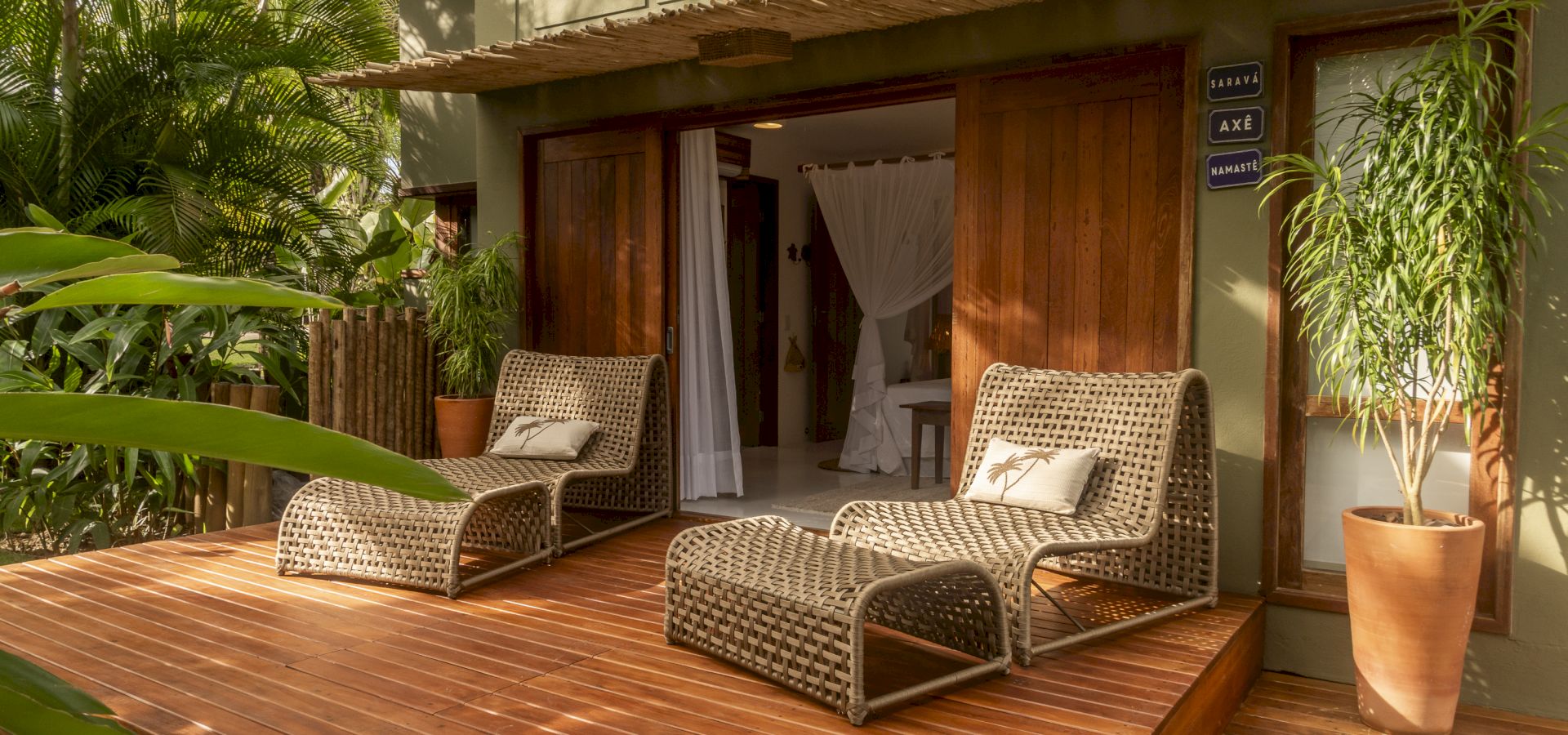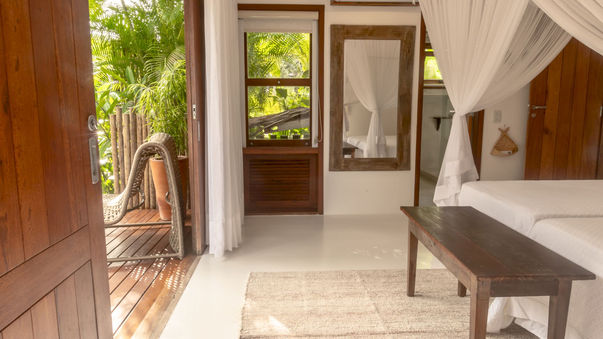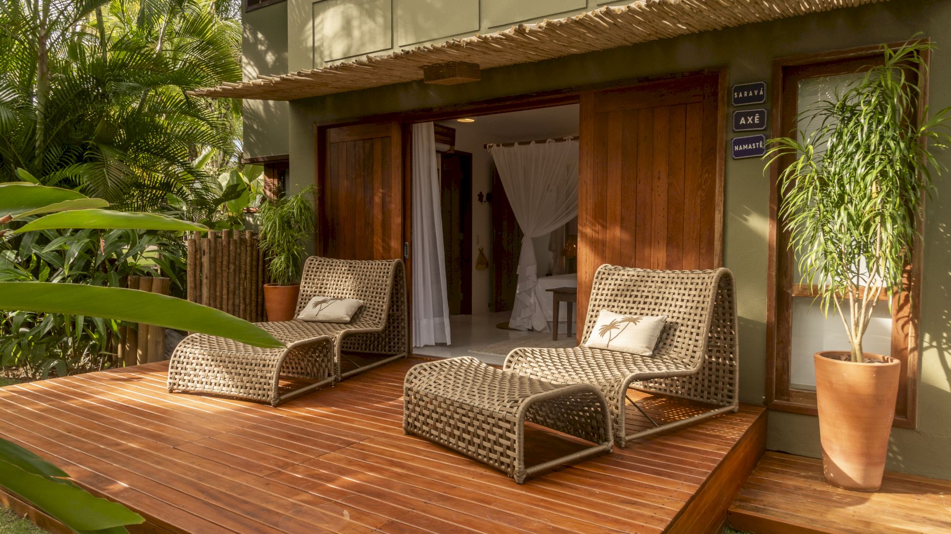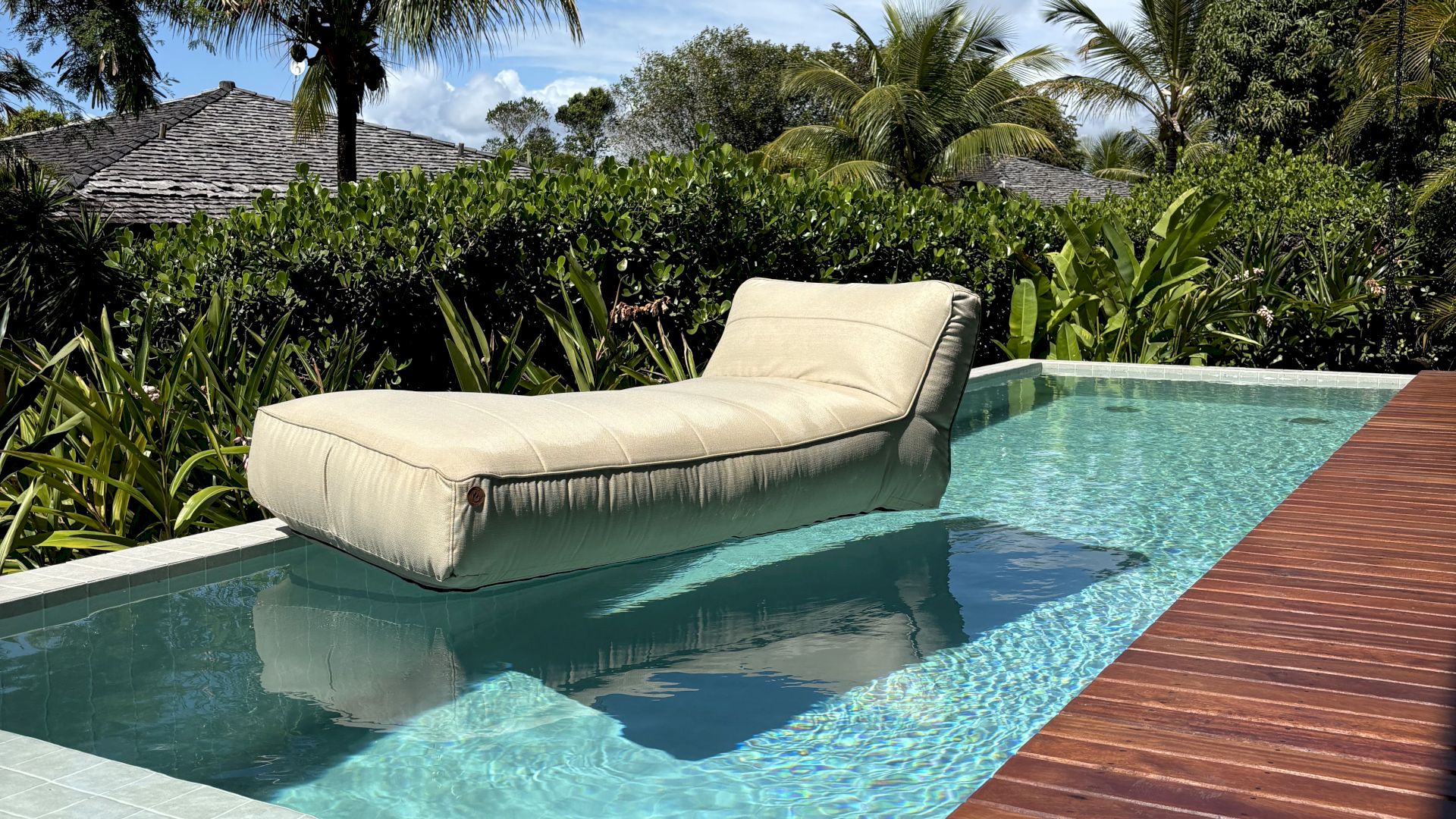 A área externa conta com piscina privativa, cercada por espaços de relaxamento que se integram ao paisagismo tropical característico da região.