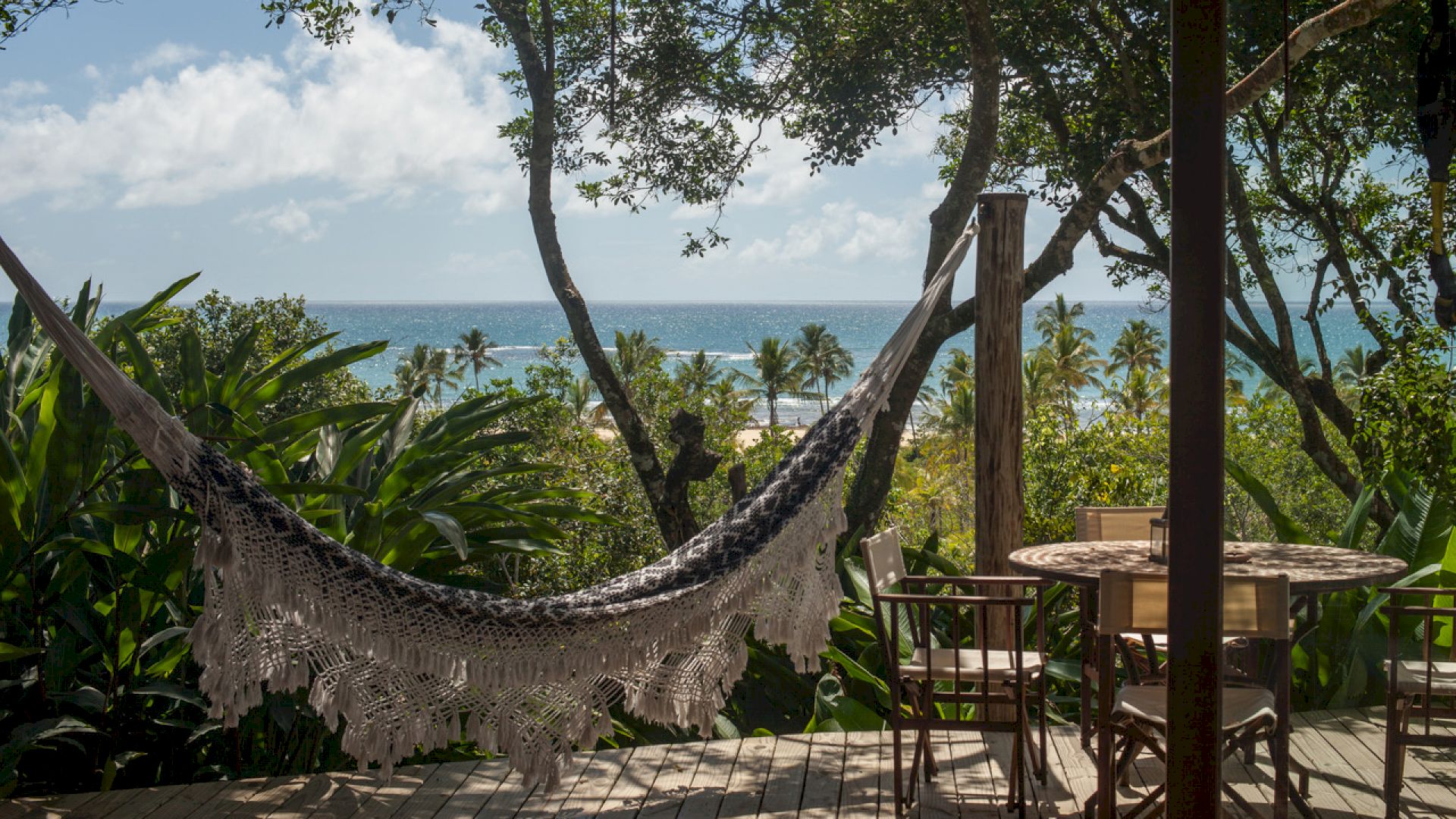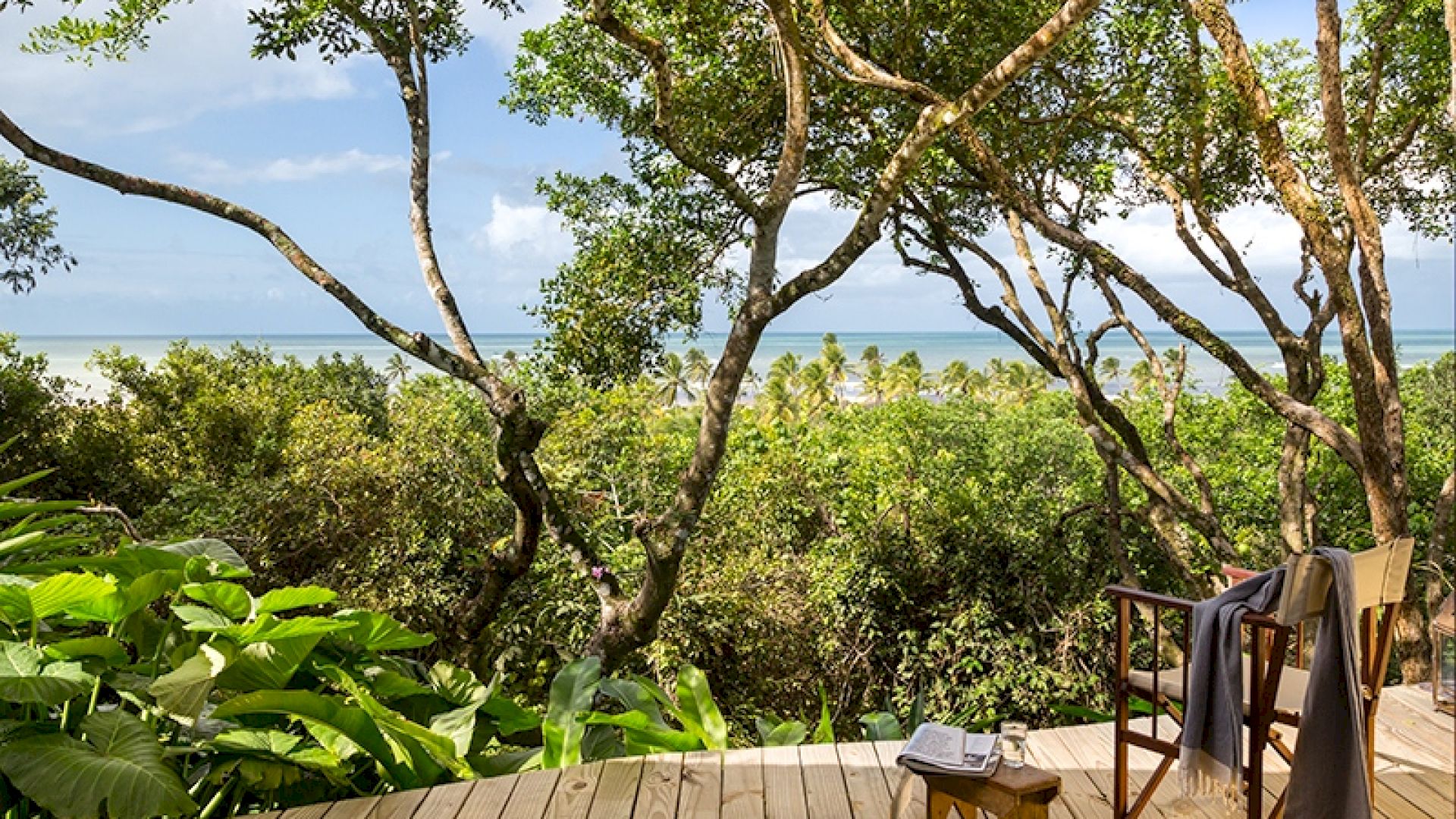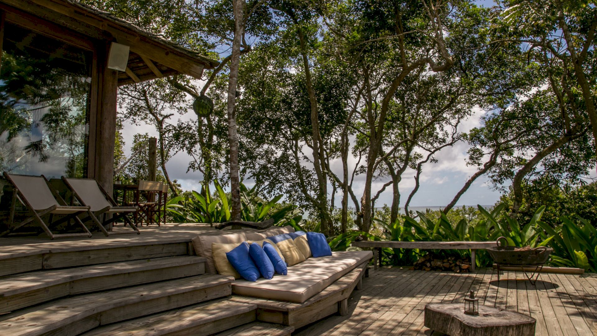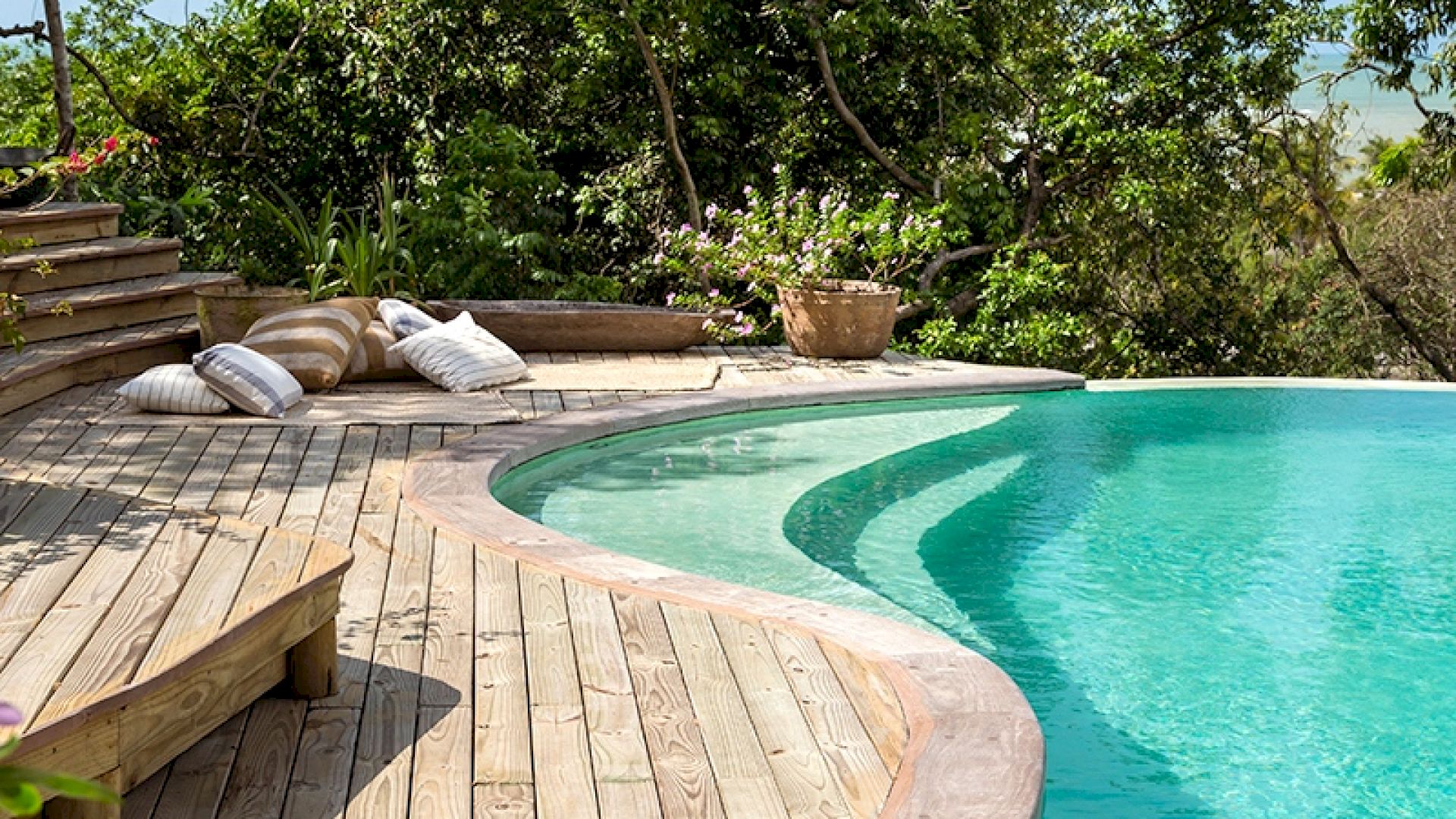 No deck da Varanda temos espaços com mesas e cadeiras para refeições, sofás, espreguiçadeiras e uma piscina com uma vista linda no jardim e no mar.