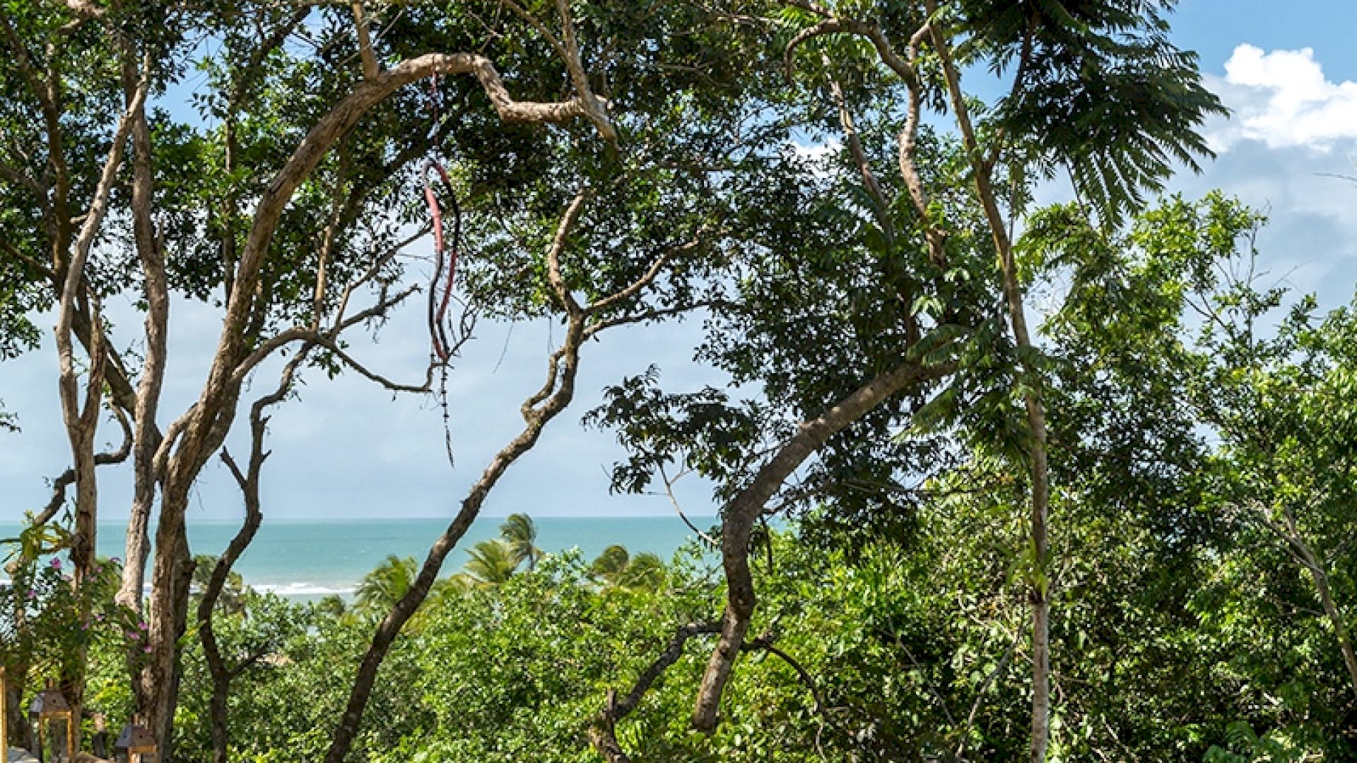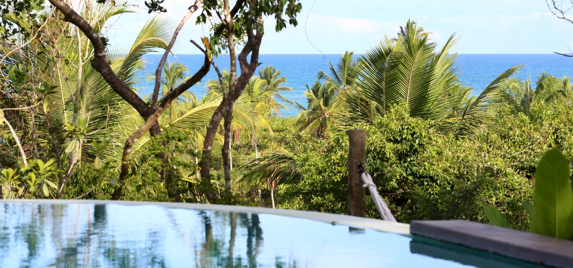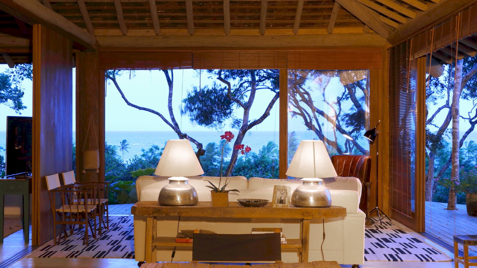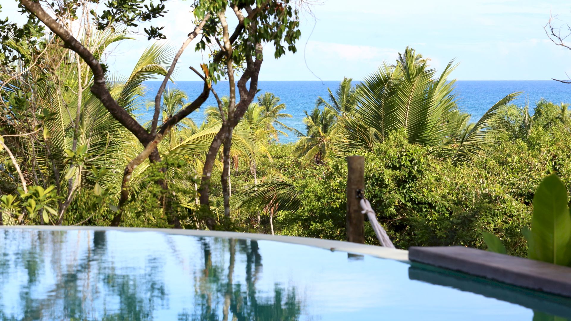 No deck da Varanda temos espaços com mesas e cadeiras para refeições, sofás, espreguiçadeiras e uma piscina com uma vista linda no jardim e no mar.