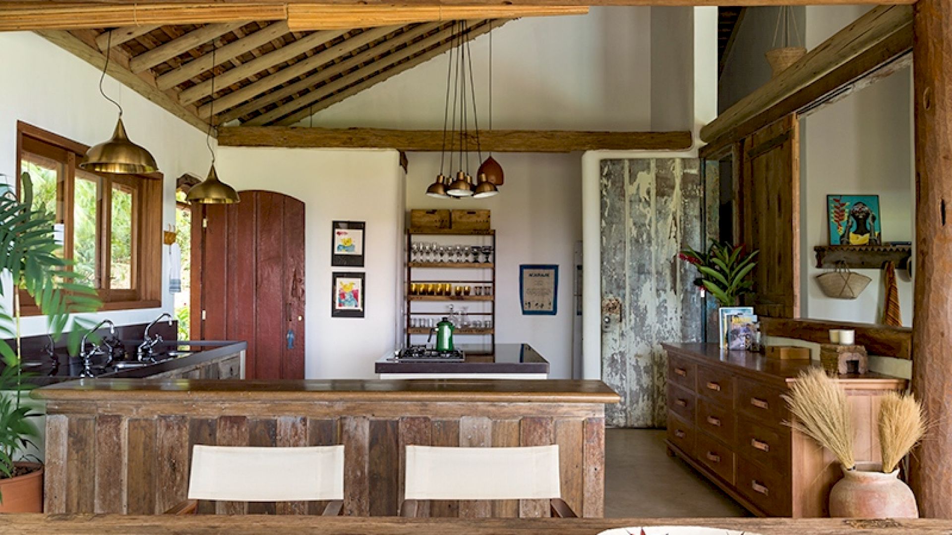 Uma sala de jantar e uma cozinha totalmente equipada, todos com vista mar e acesso a uma enorme varanda emoldurando a frente da casa.