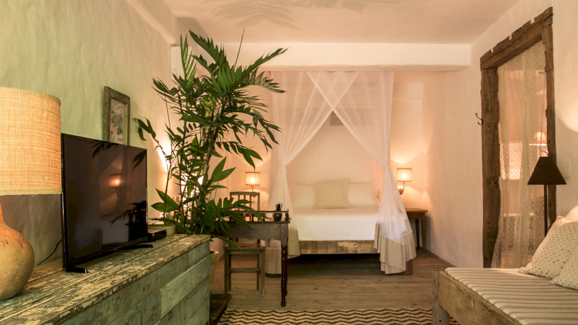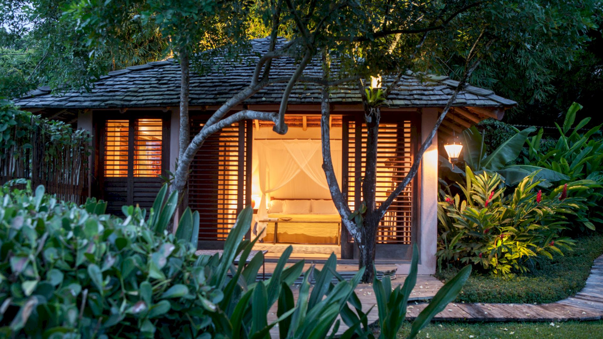 - 1 suíte no bangalô externo com cama king size, cofre e vista para o jardim