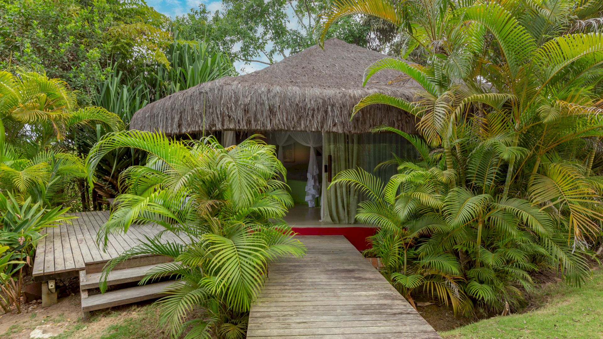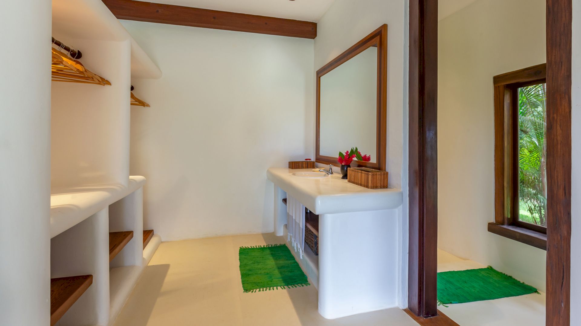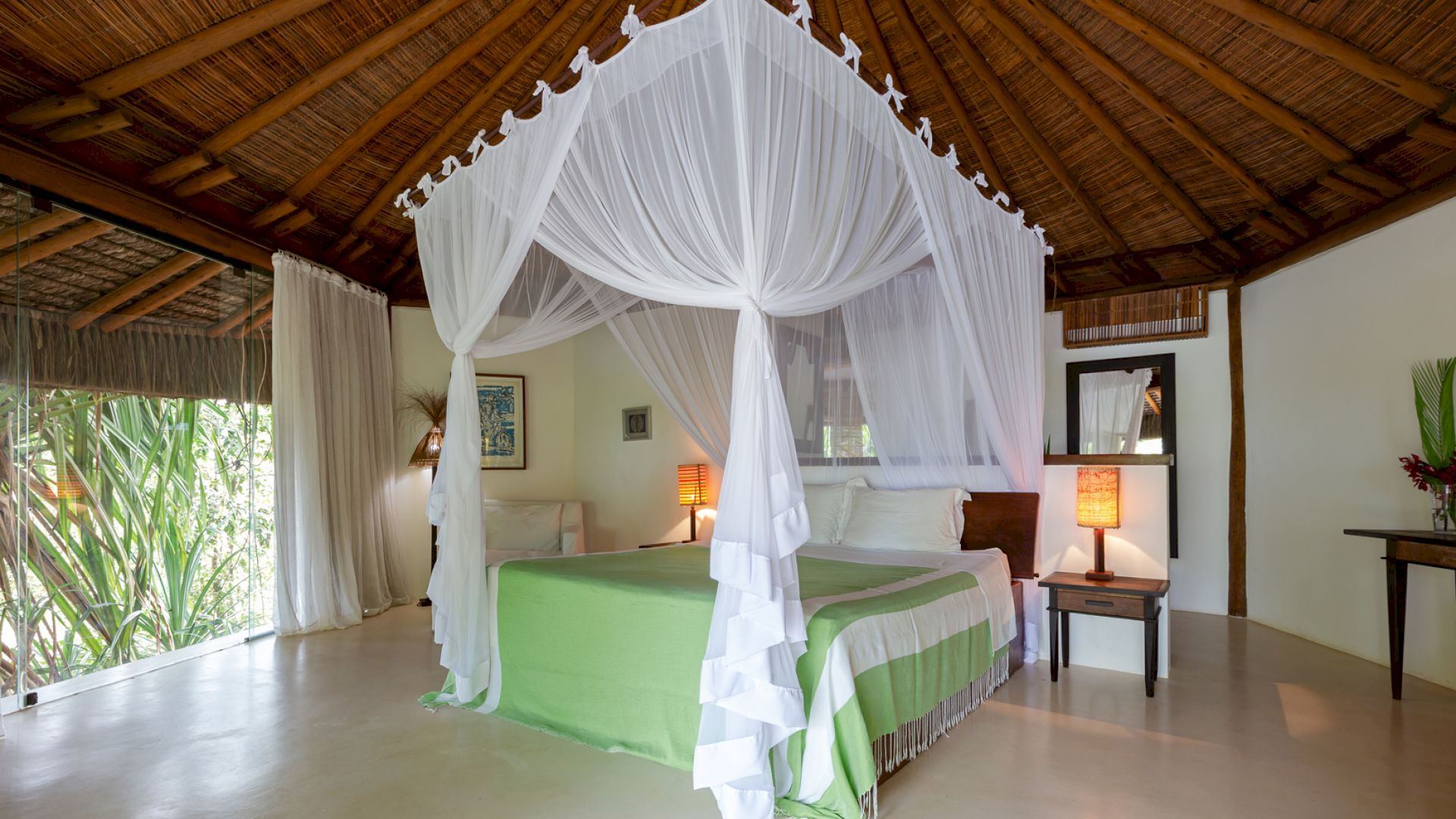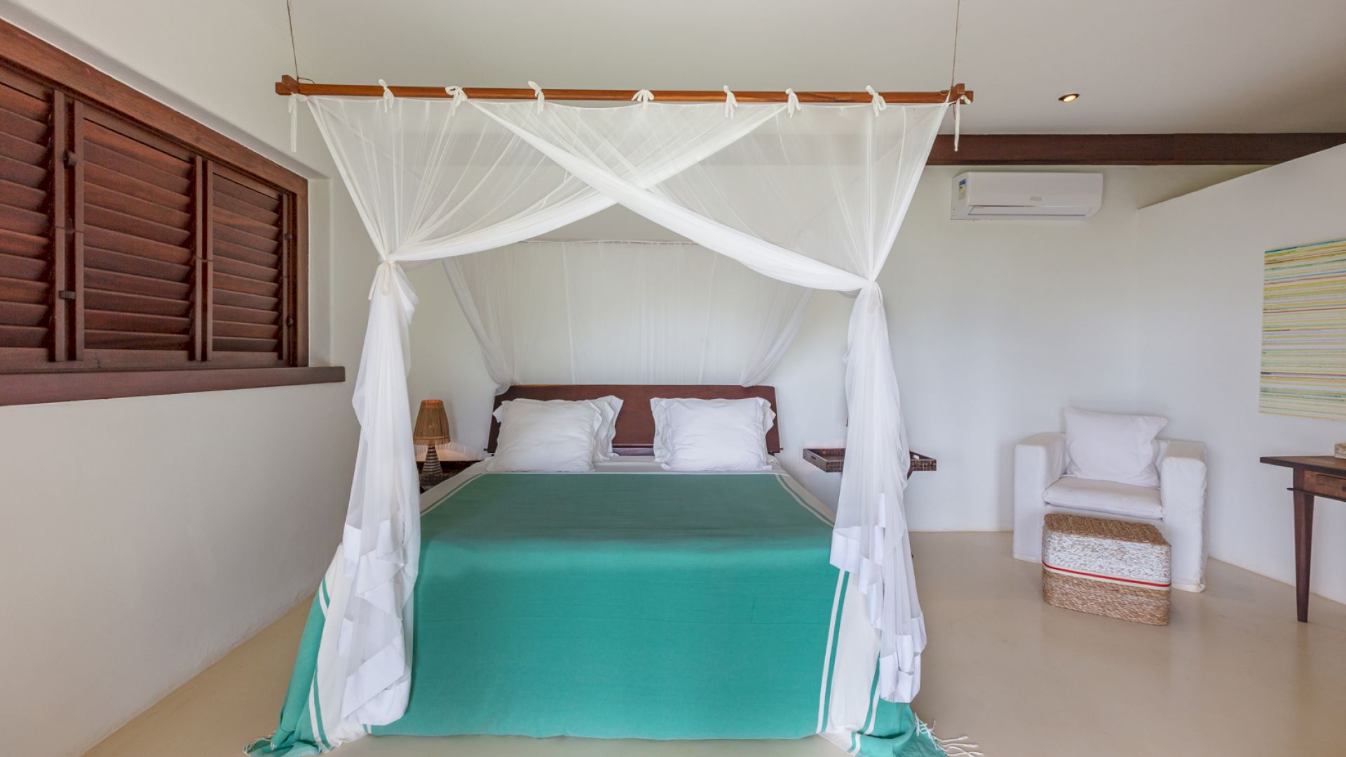 jardim, cama de casal king size, closet, cofre, ar condicionado, ventilador de teto, mosquiteiro.