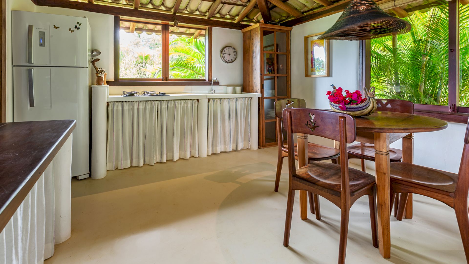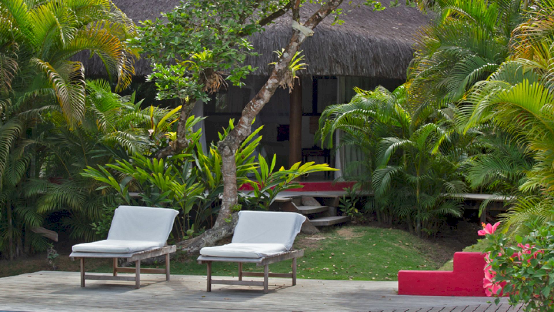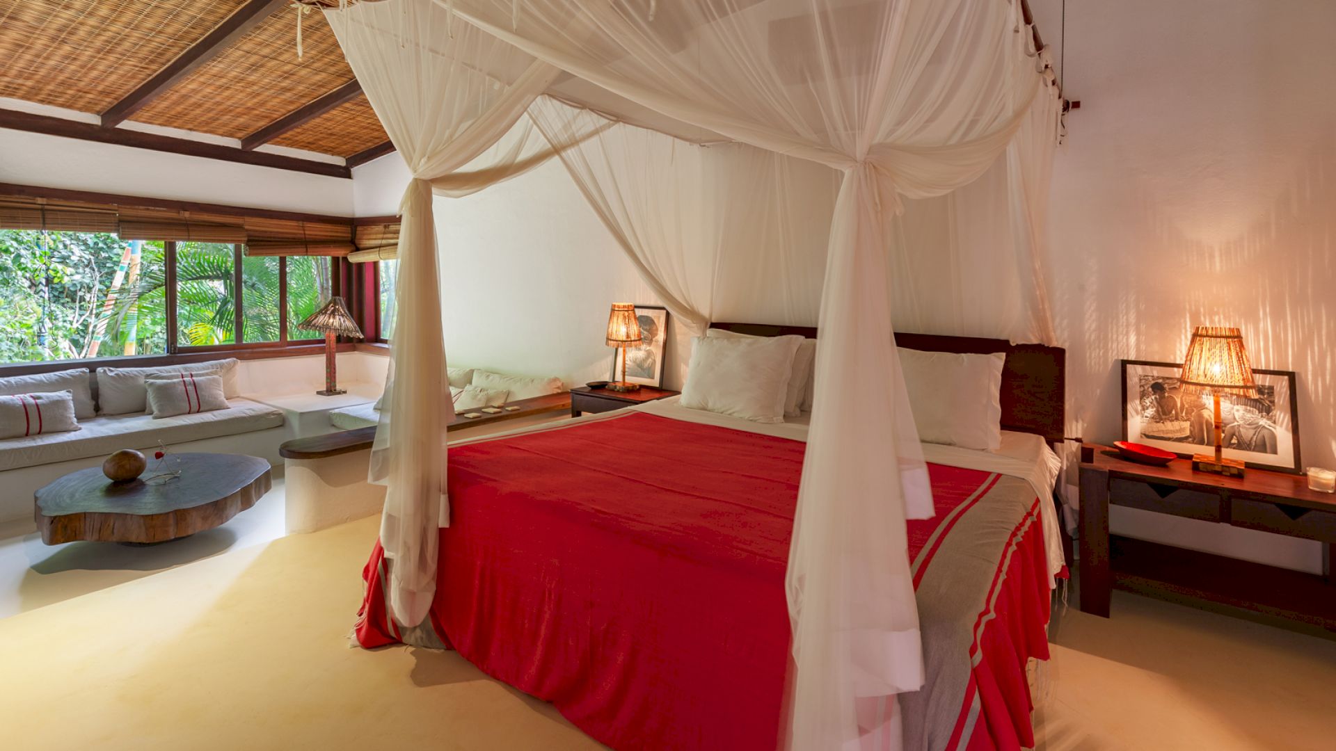 jardim, cama de casal king size, closet, cofre, ar condicionado, ventilador de teto, mosquiteiro.
