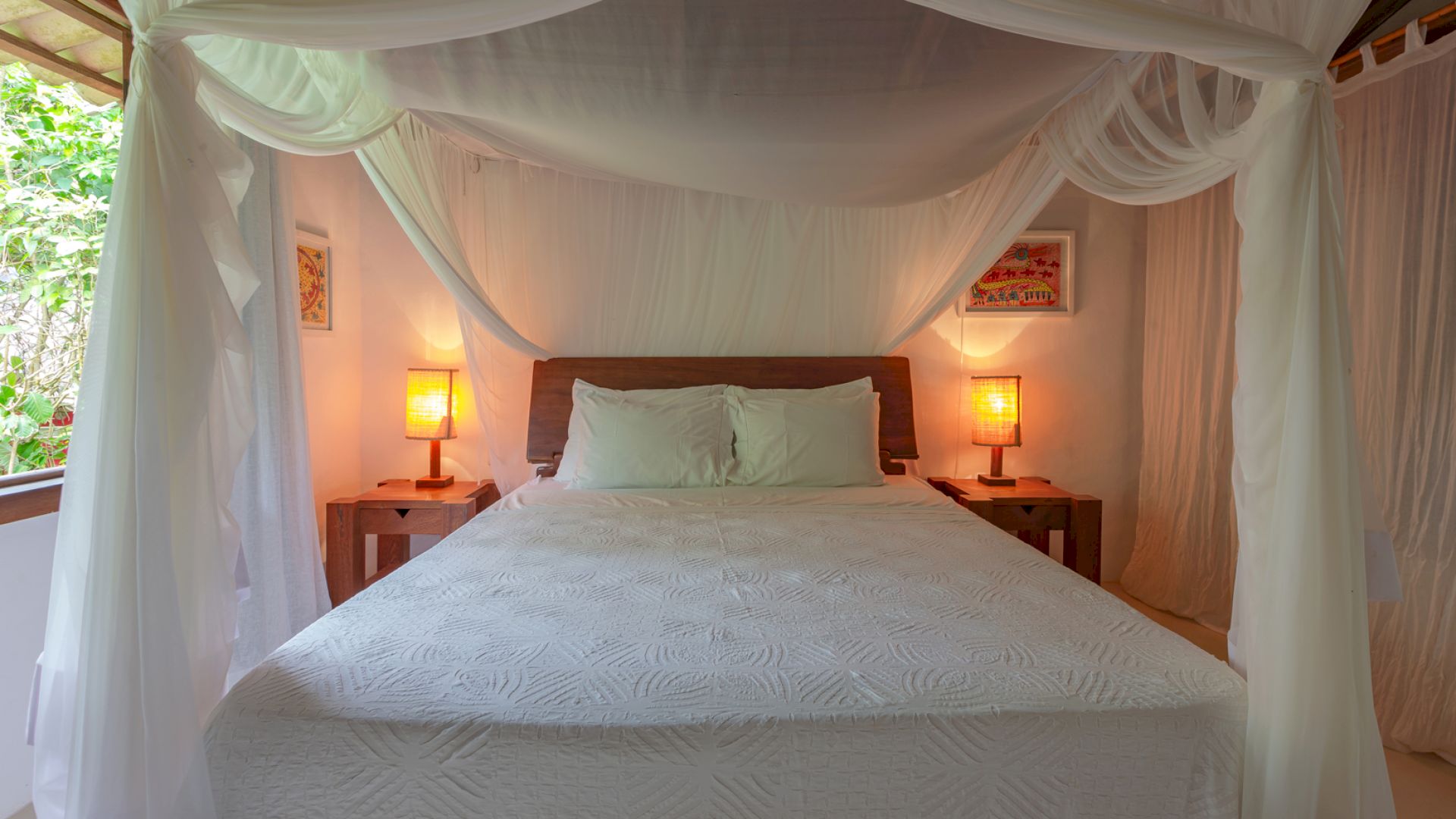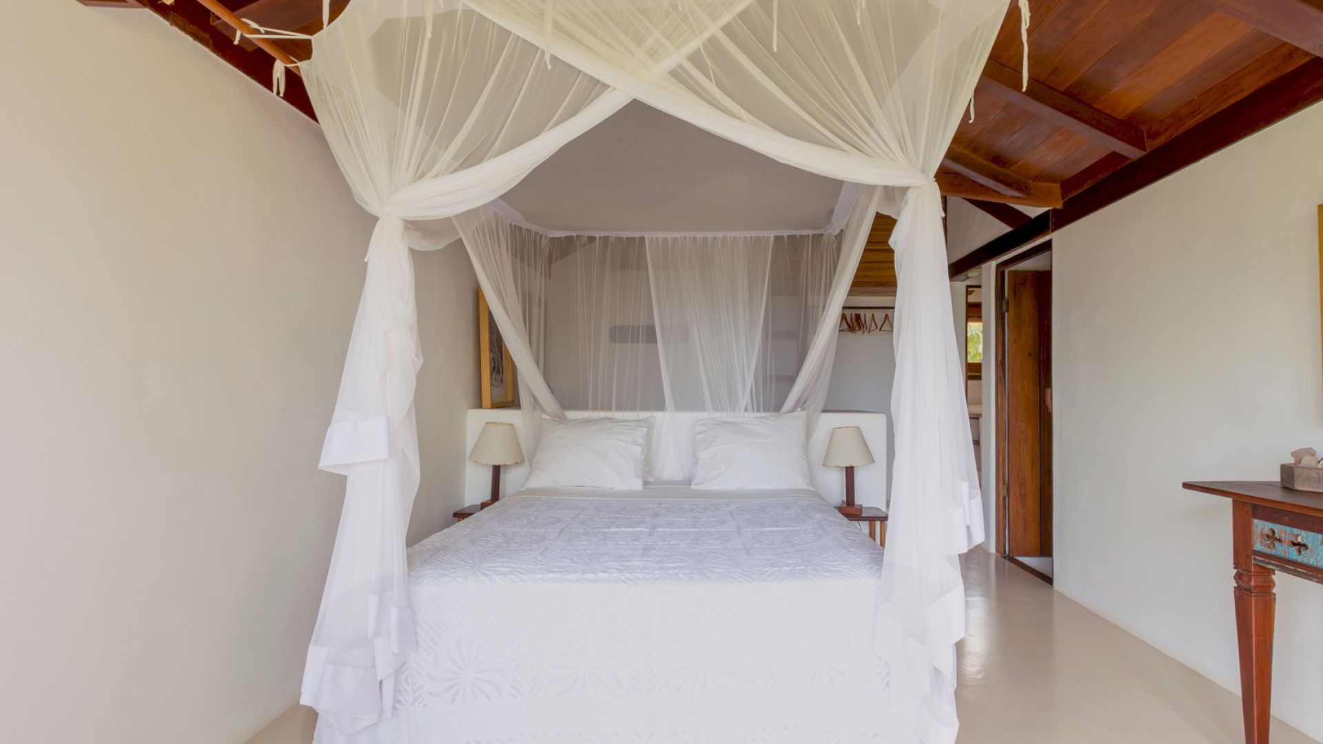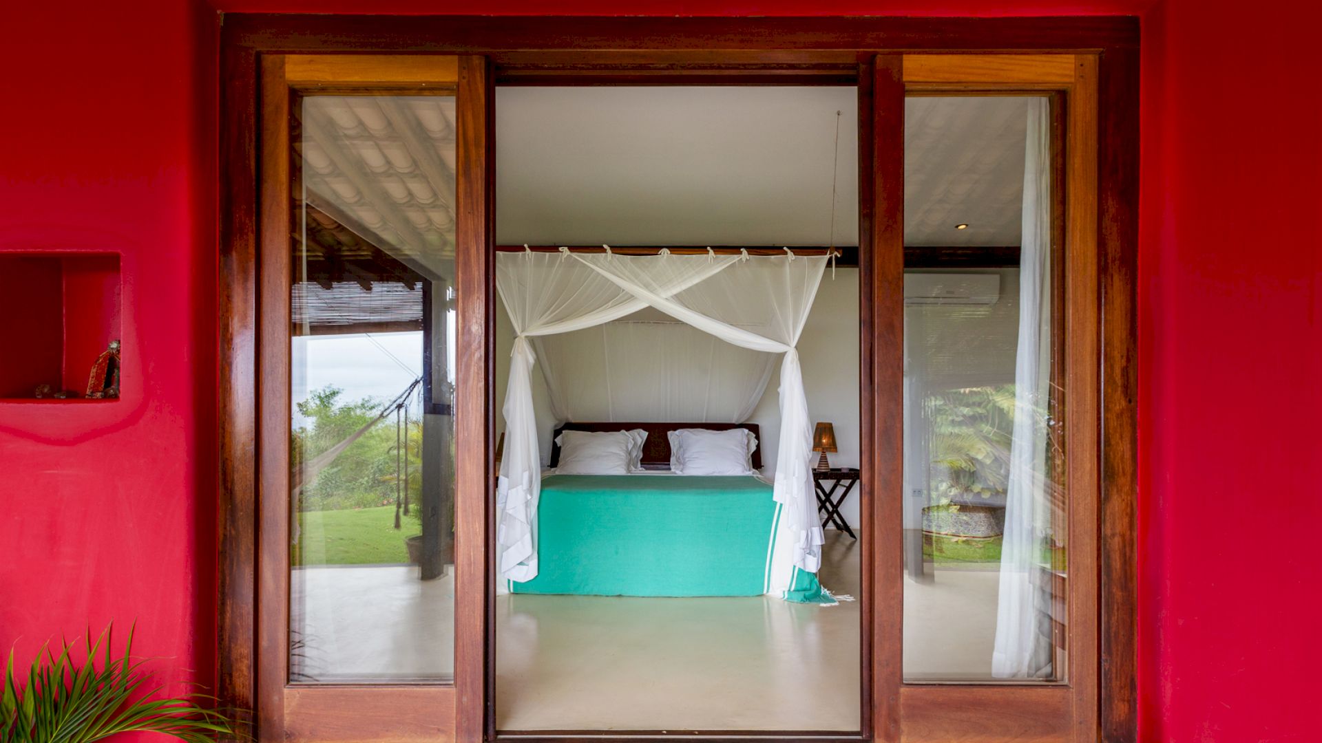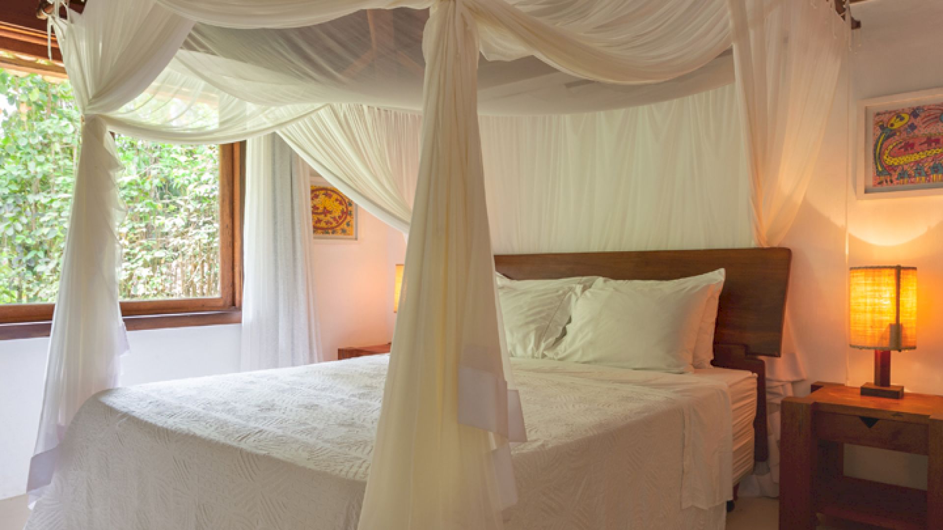 Suíte 06: piso térreo, vista para o jardim, 1 cama de casal queen size, cofre e mosquiteiro.