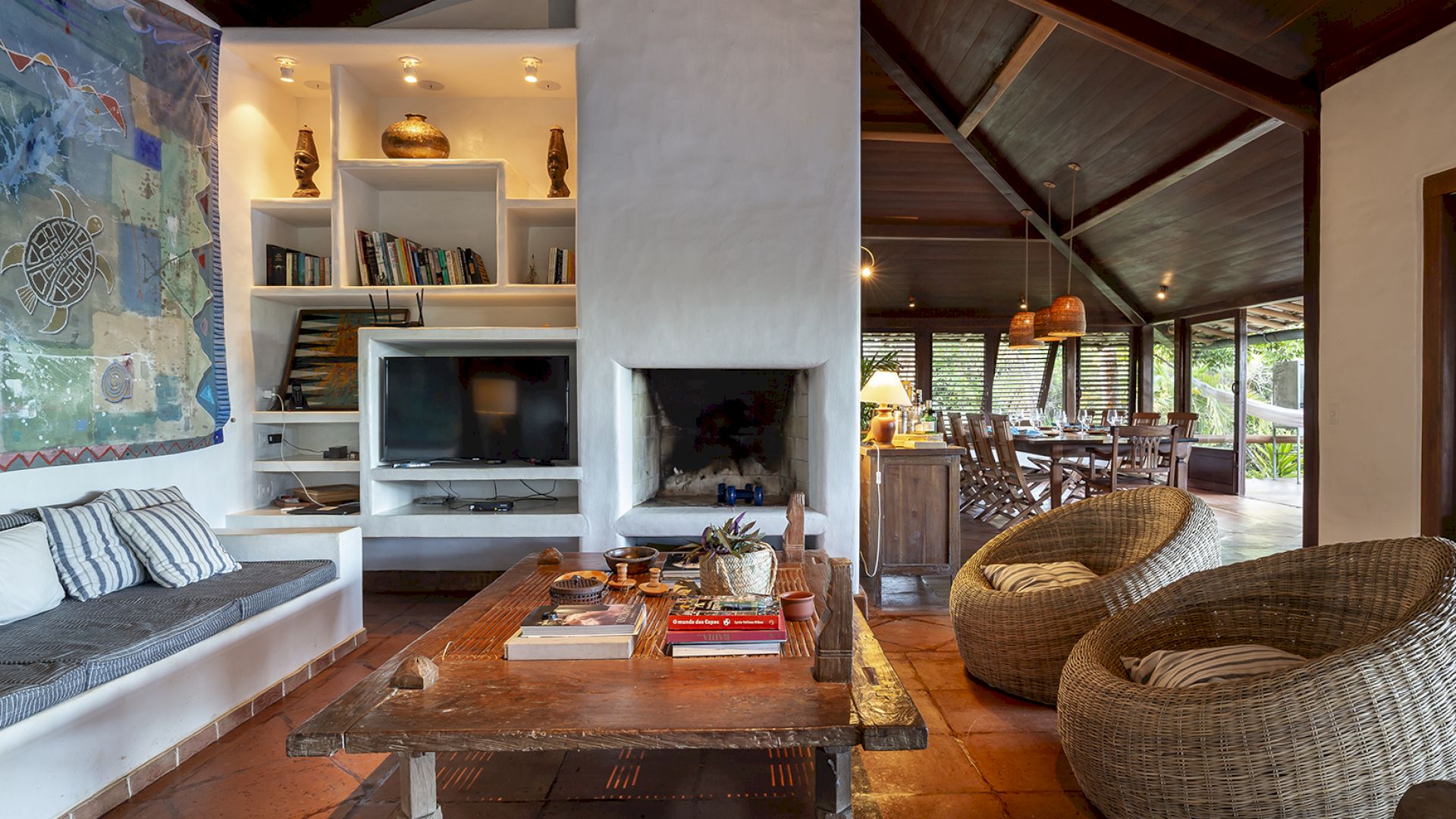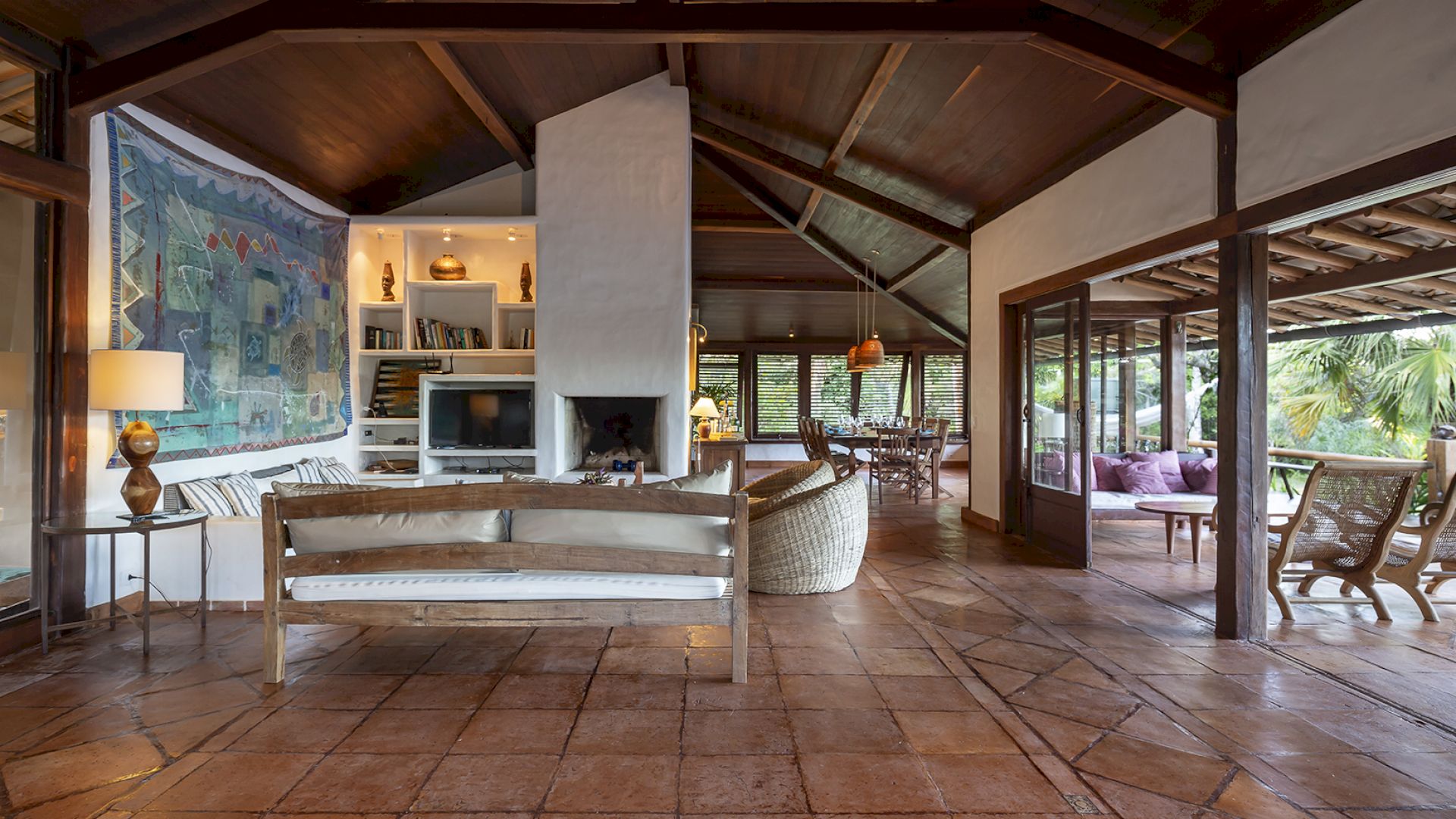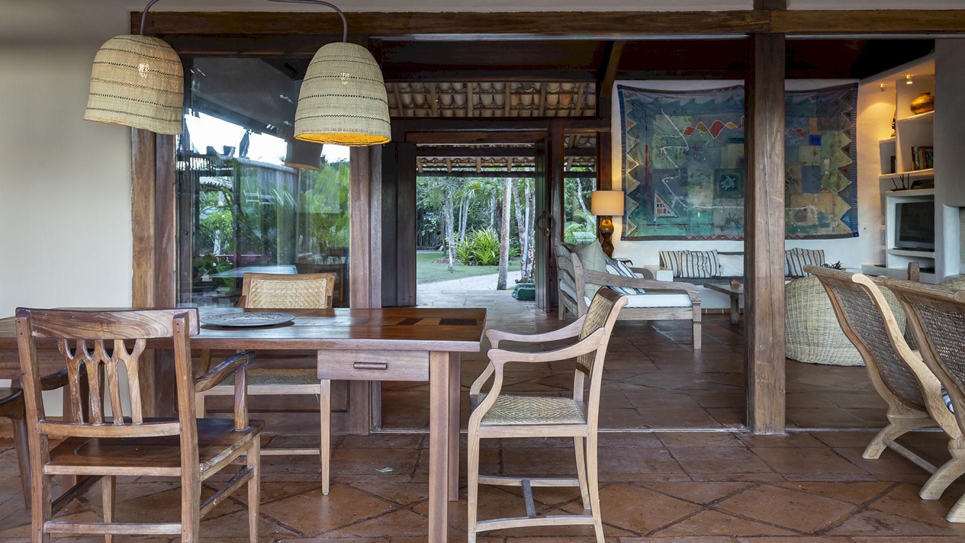 • Sala de TV e salas de estar e jantar com portas de vidro que se abrem para o jardim