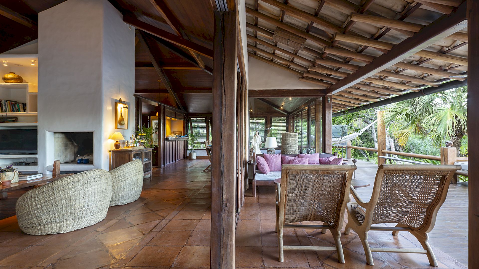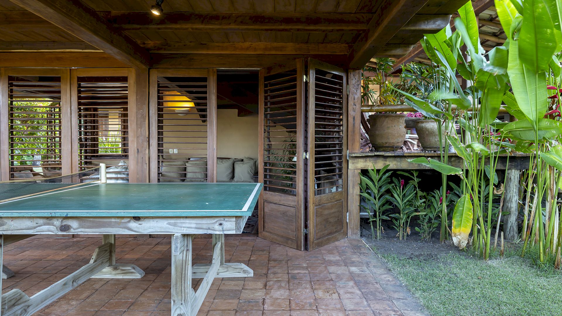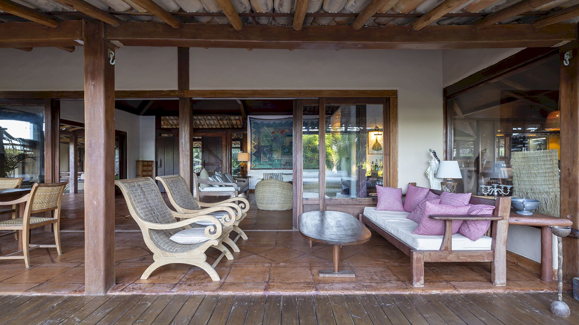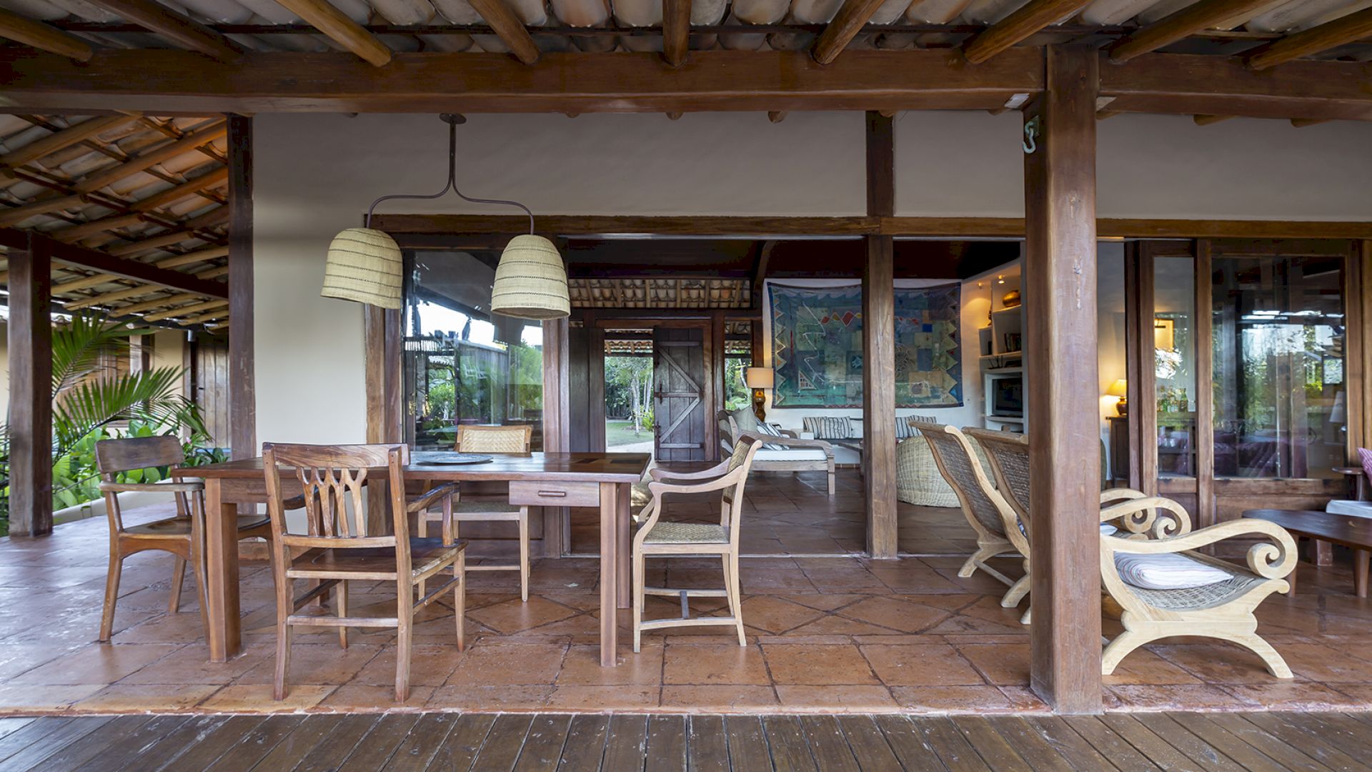 • Sala de TV e salas de estar e jantar com portas de vidro que se abrem para o jardim