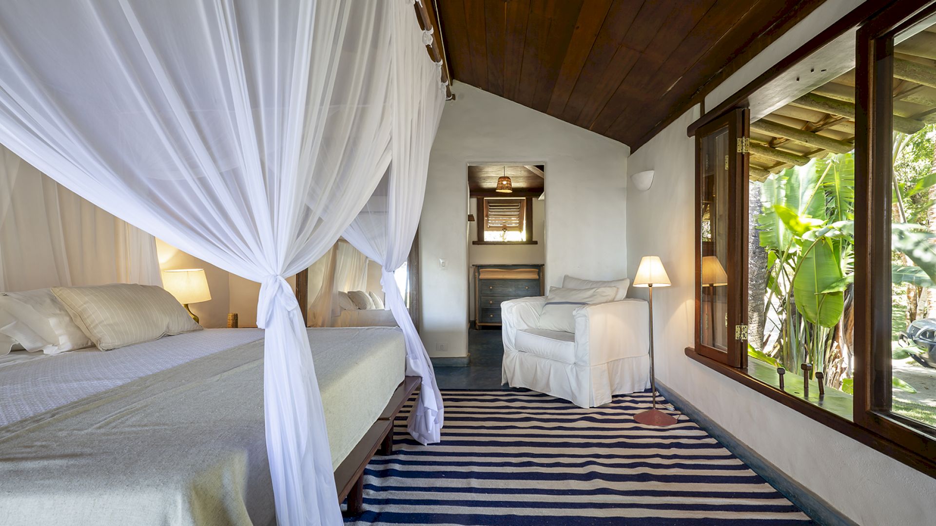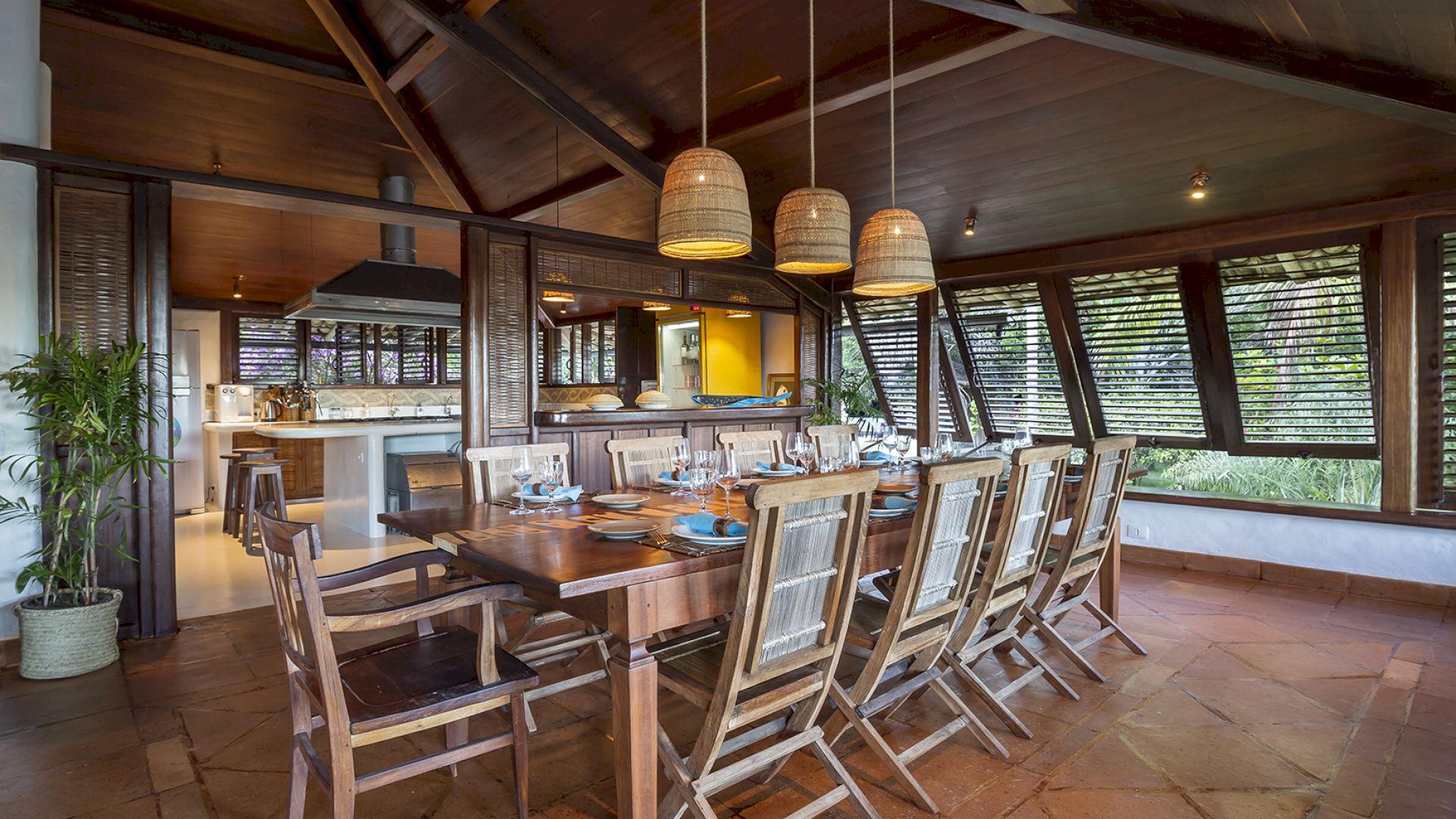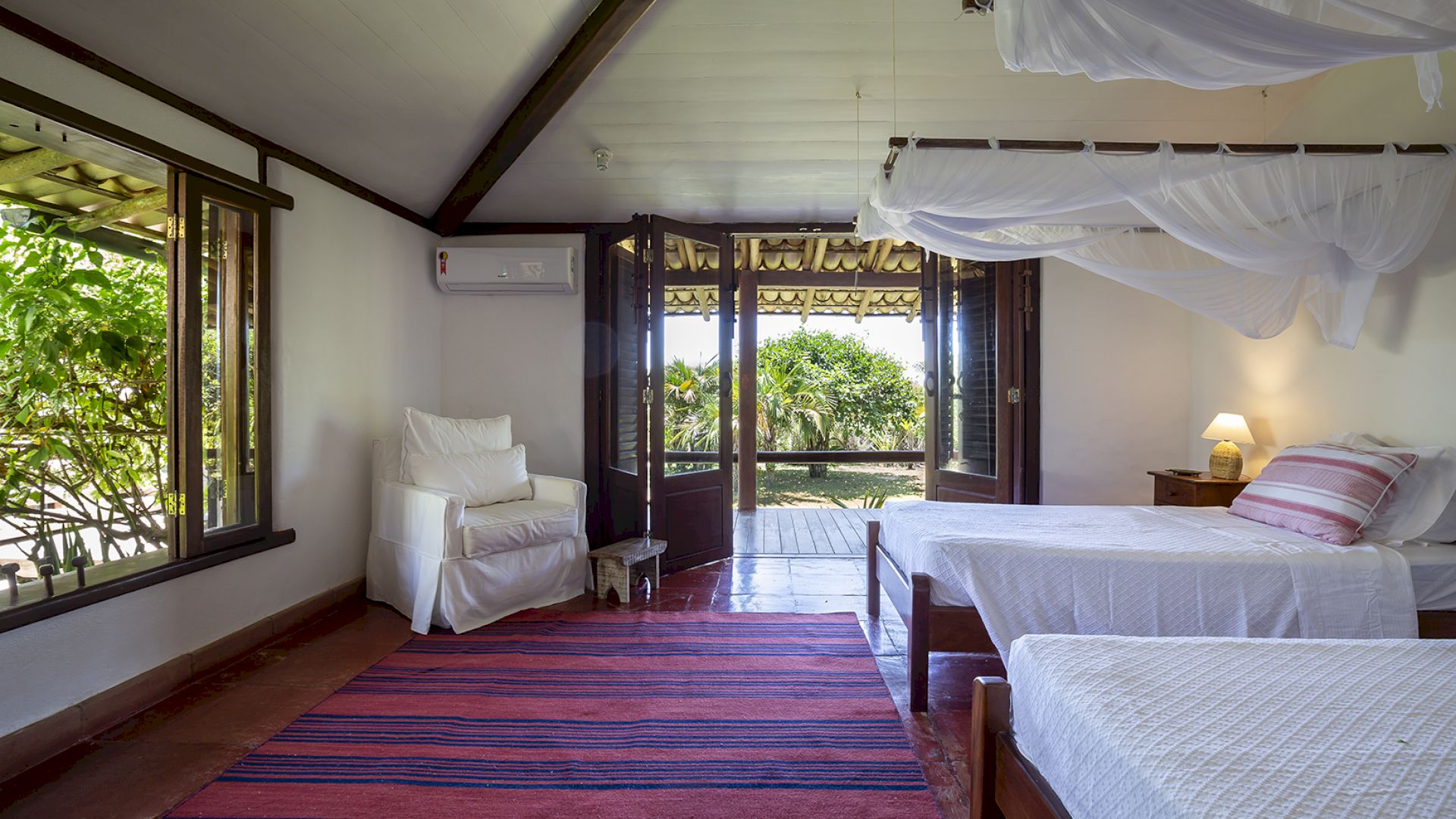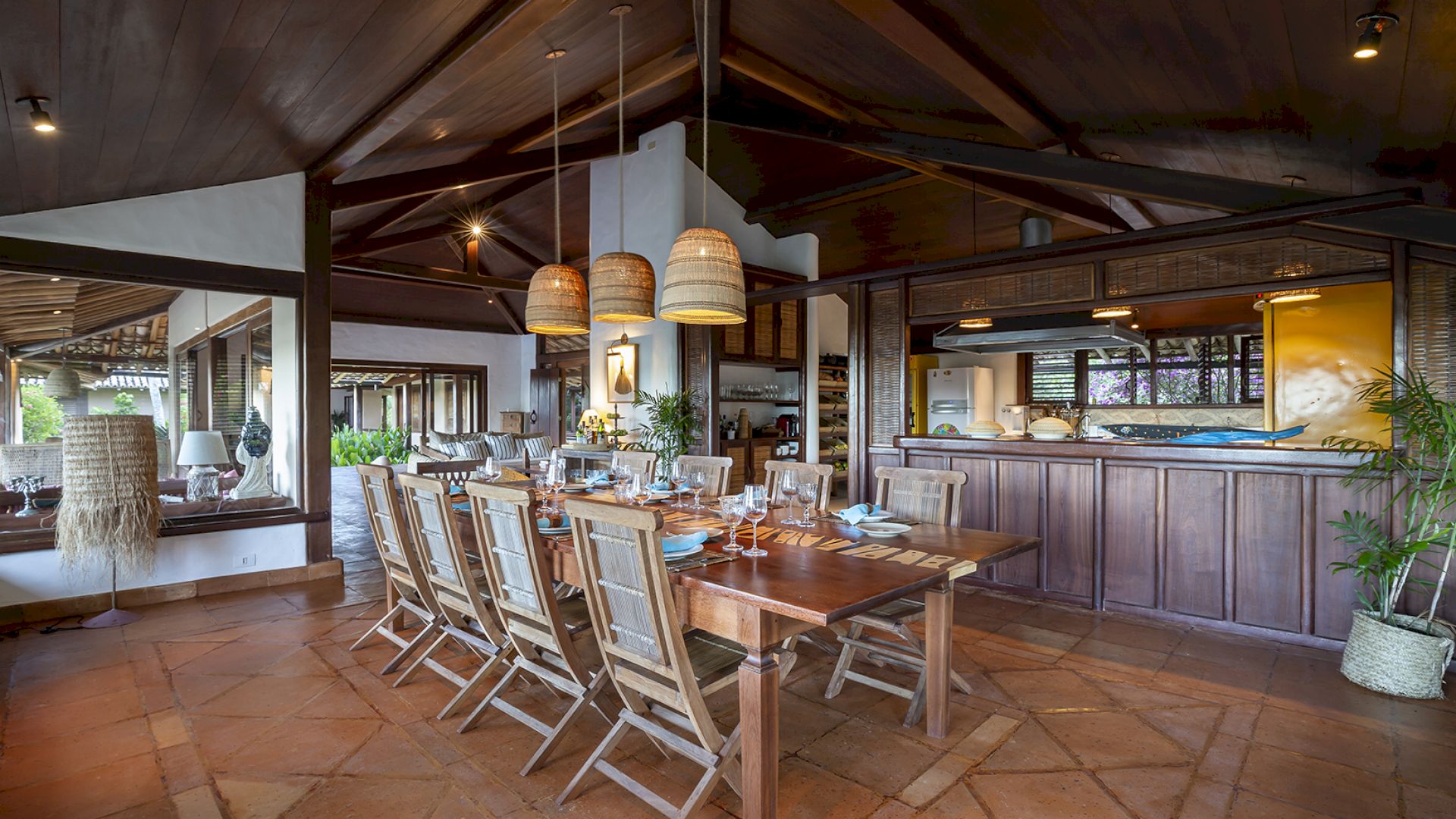 A villa acomoda até 14 hóspedes em 5 suítes e 2 quartos distribuídos entre a casa principal e a casa de hóspedes: