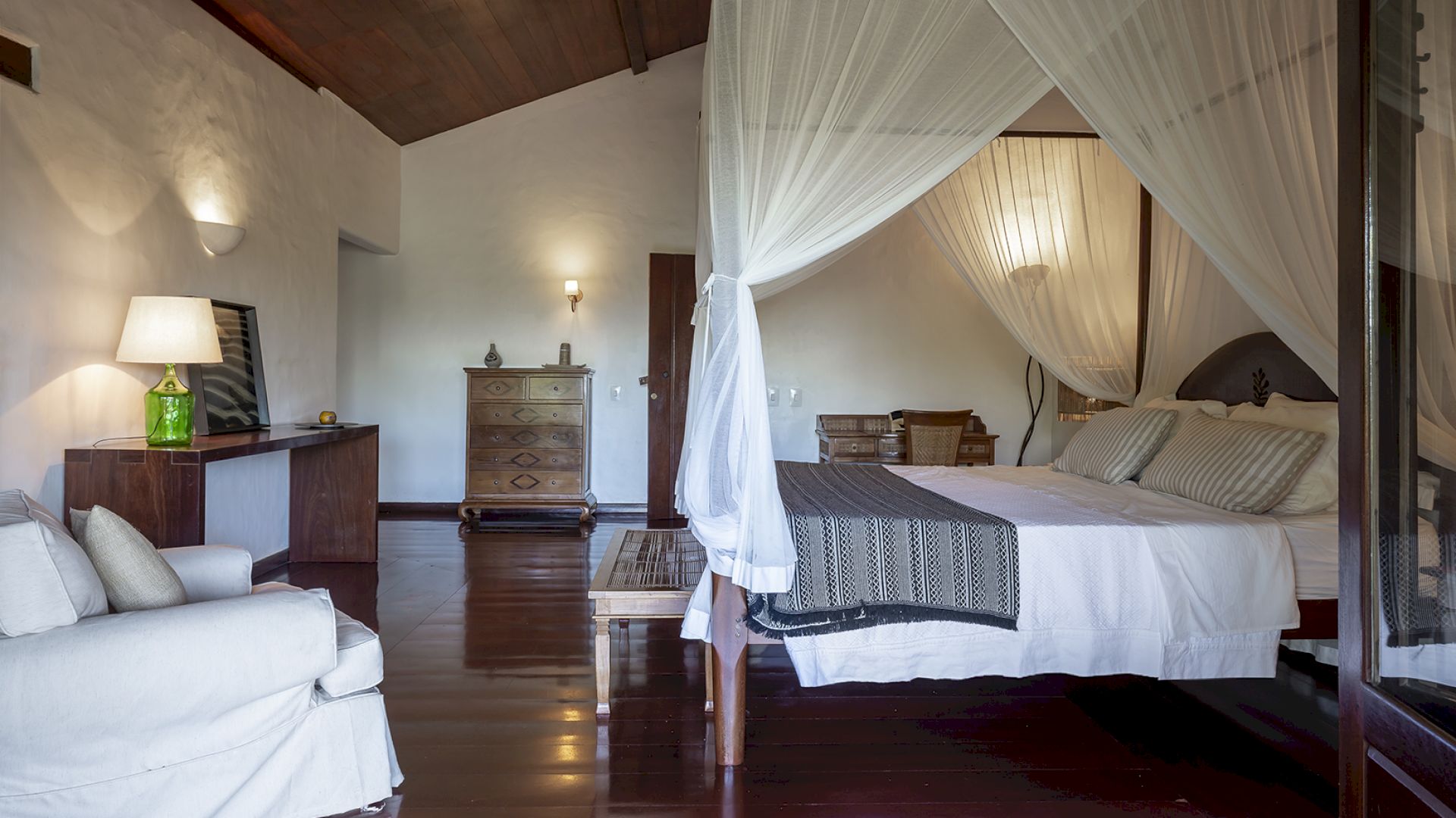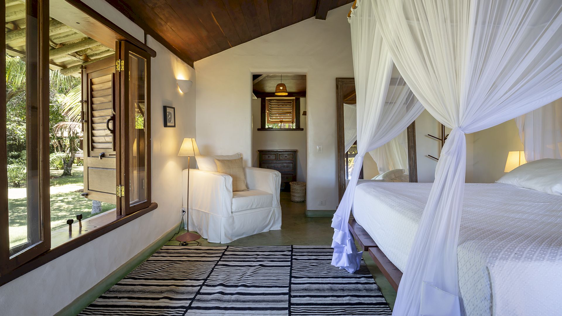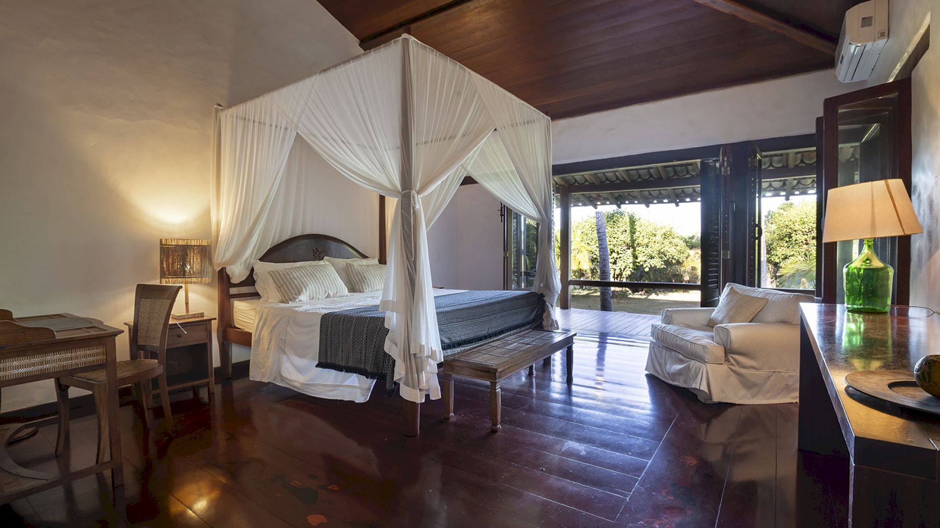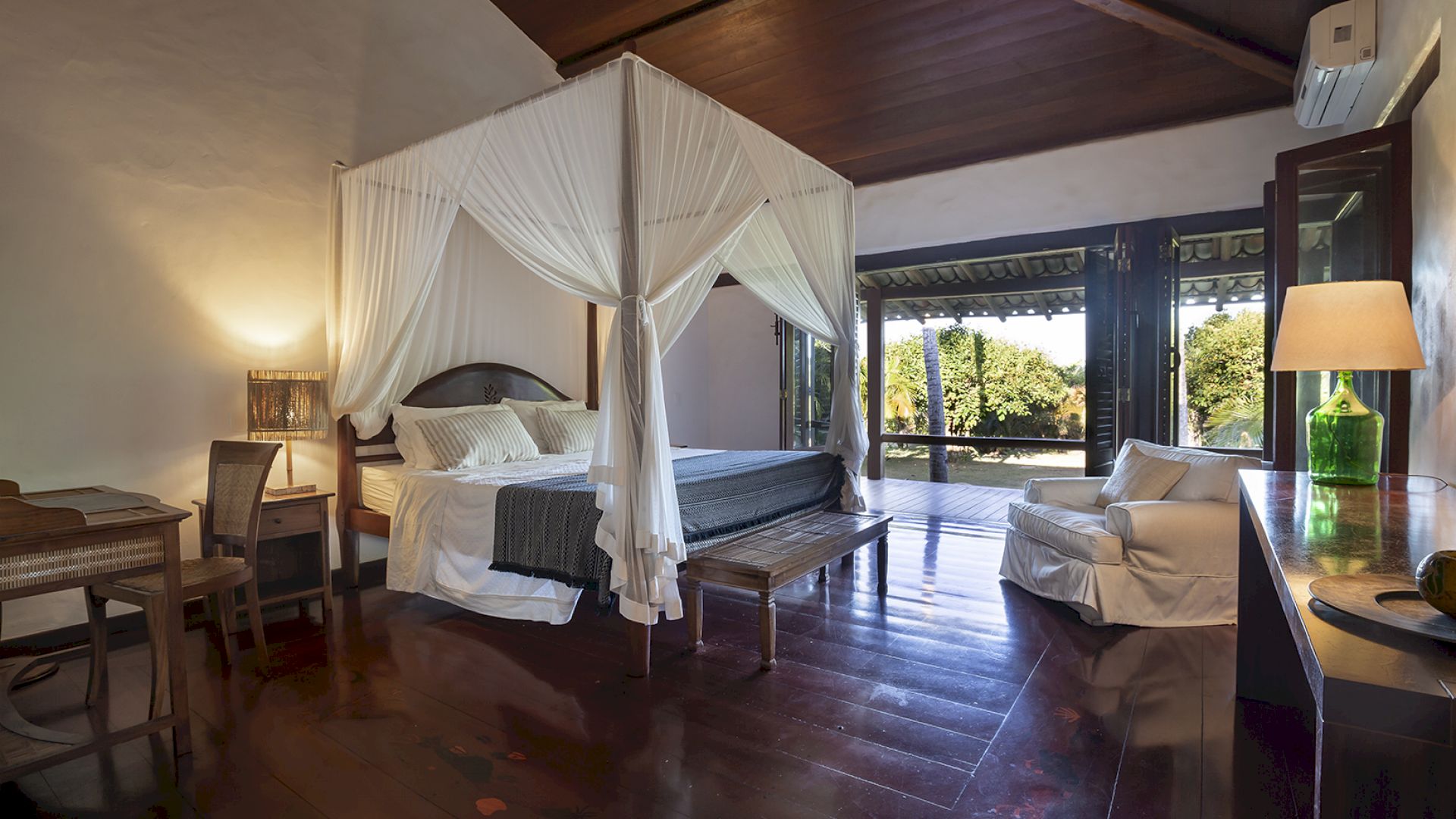 A villa acomoda até 14 hóspedes em 5 suítes e 2 quartos distribuídos entre a casa principal e a casa de hóspedes: