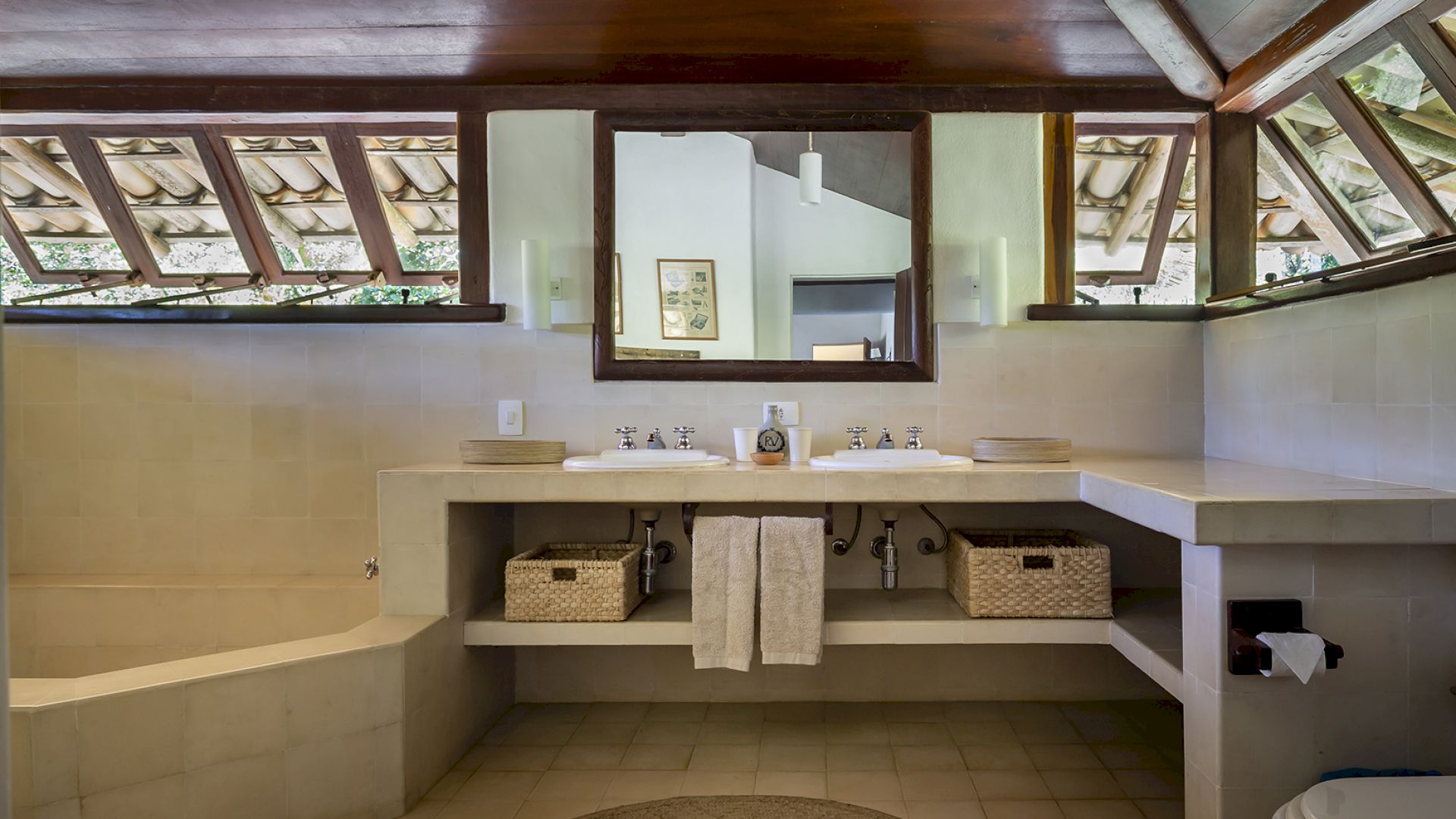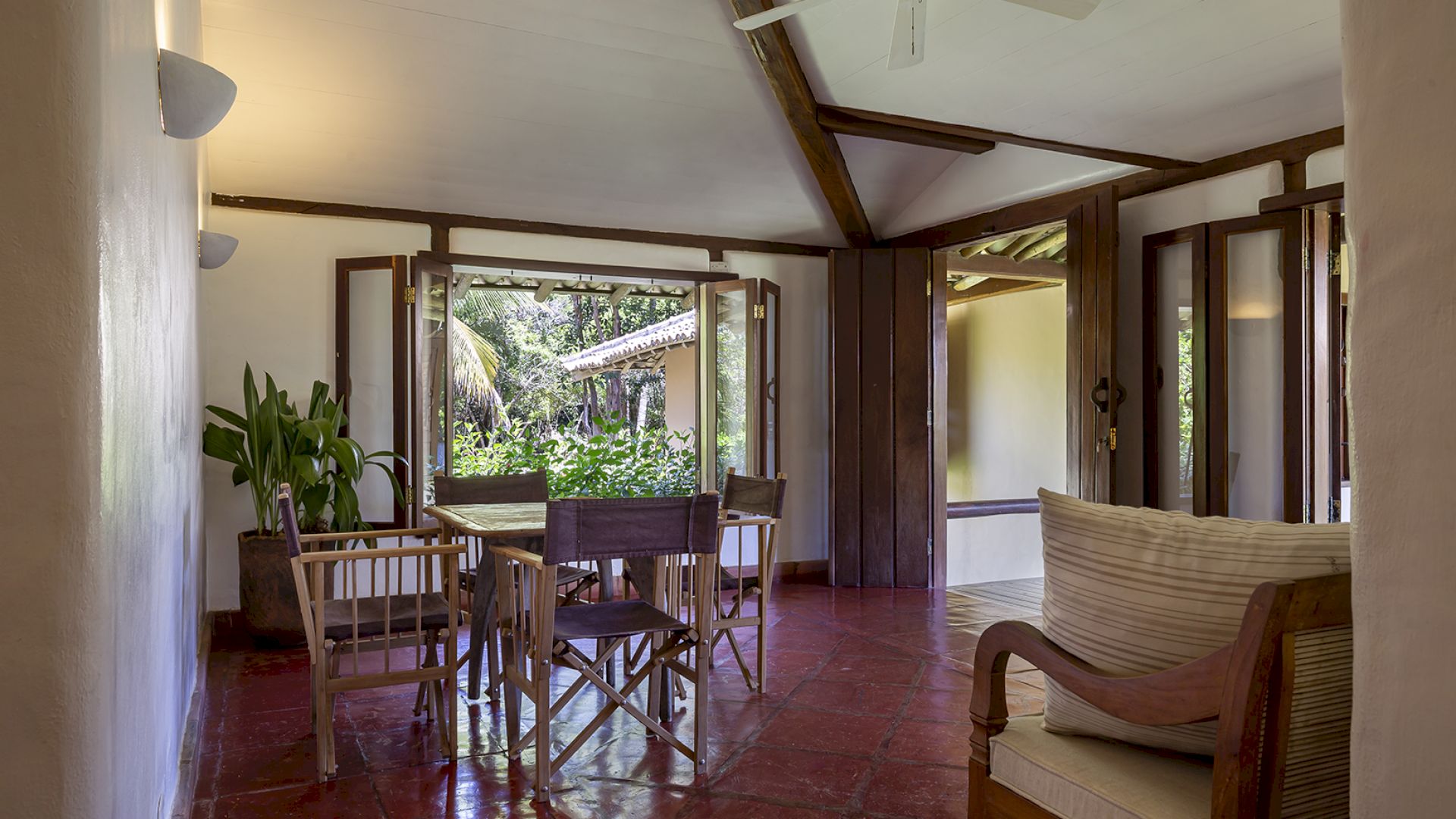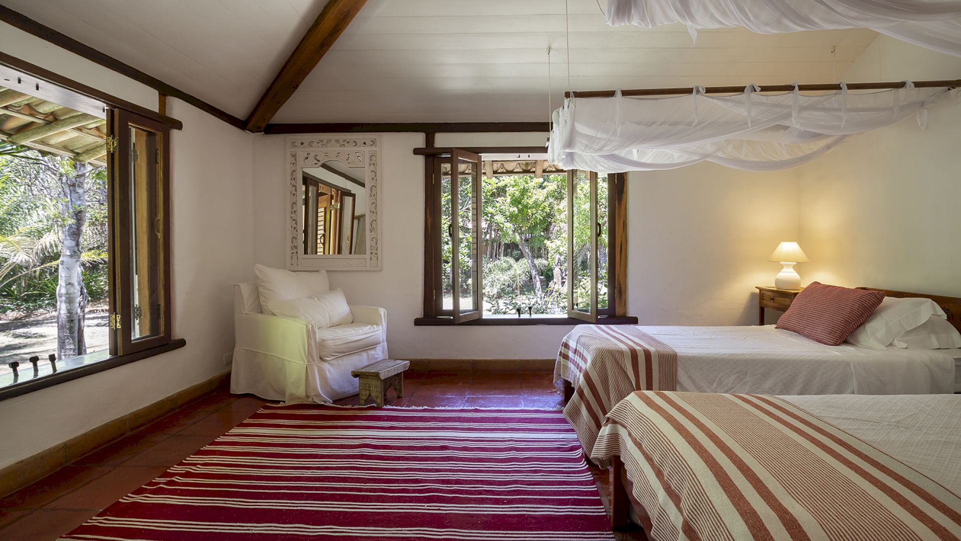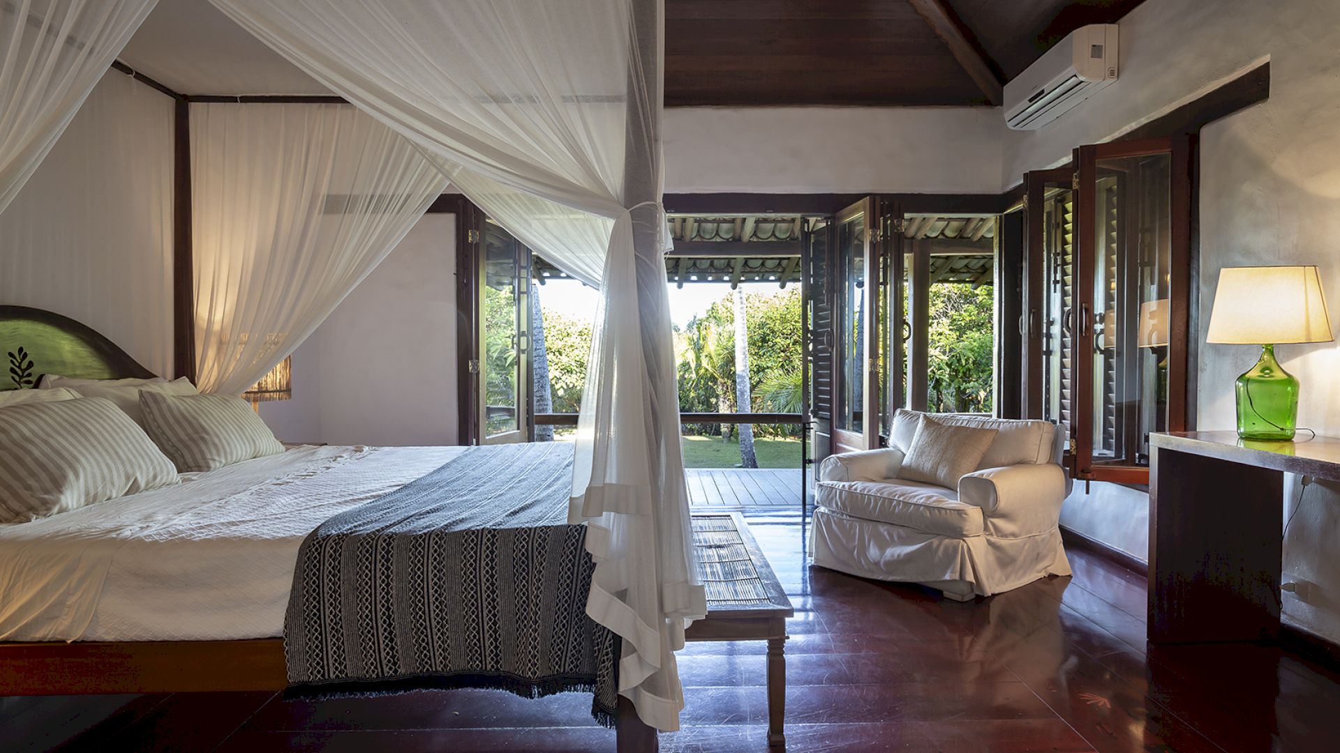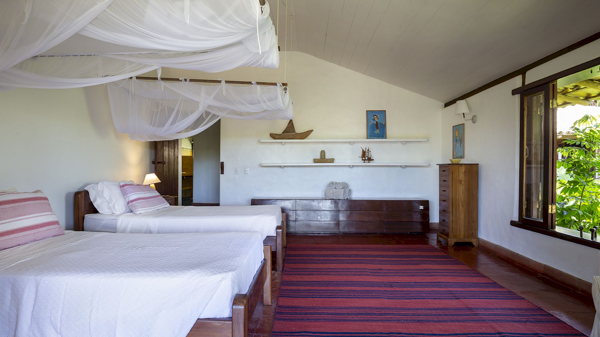 A villa acomoda até 14 hóspedes em 5 suítes e 2 quartos distribuídos entre a casa principal e a casa de hóspedes: