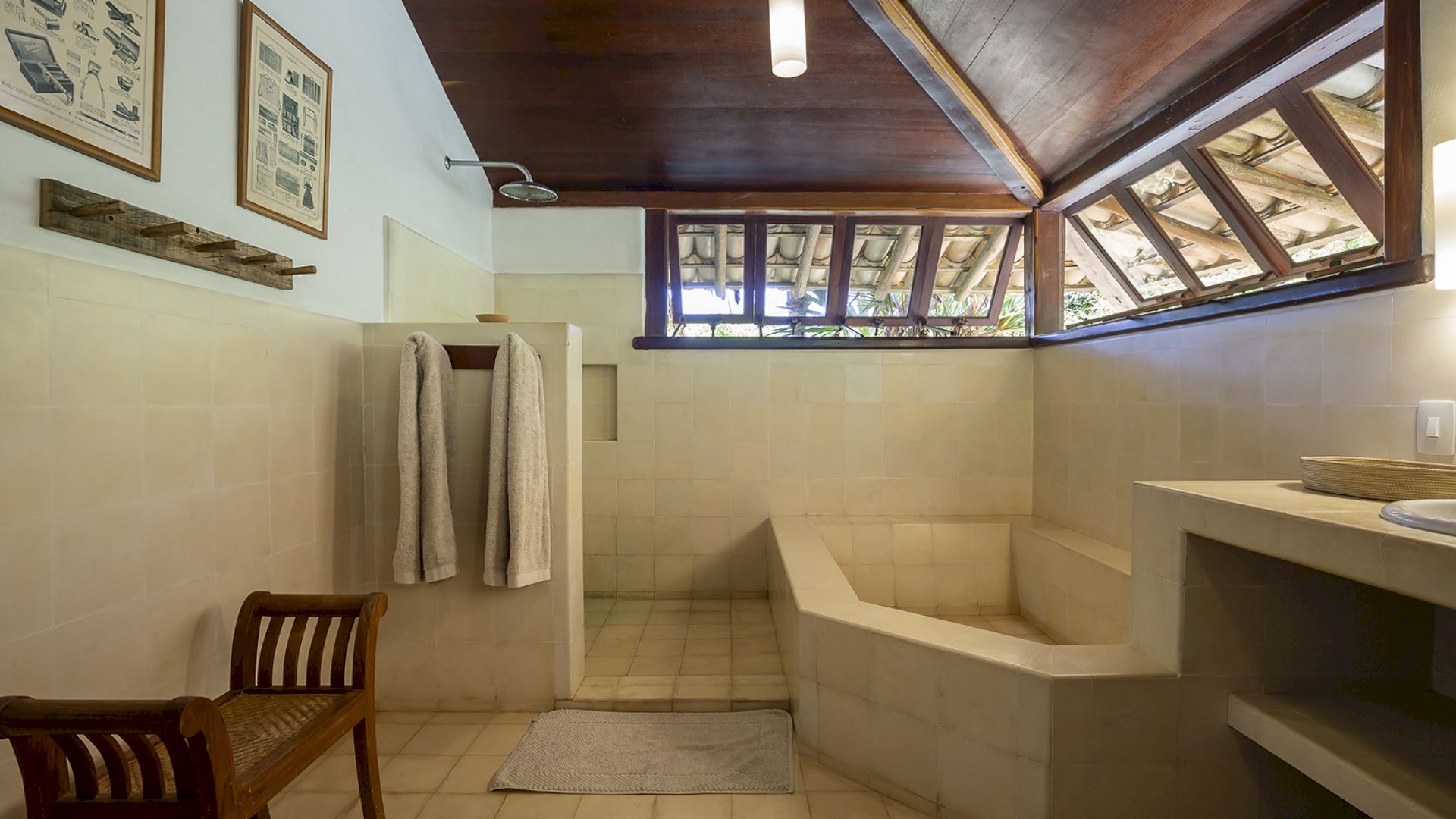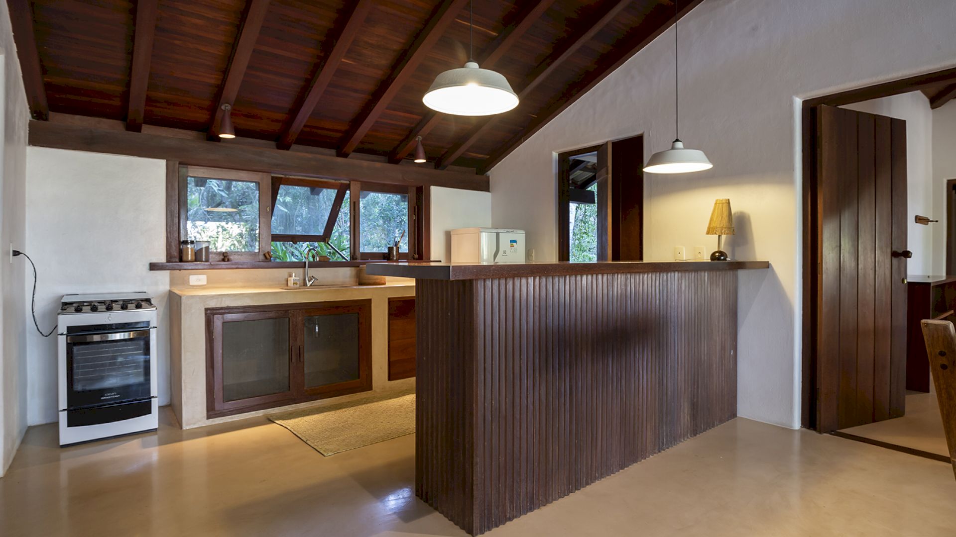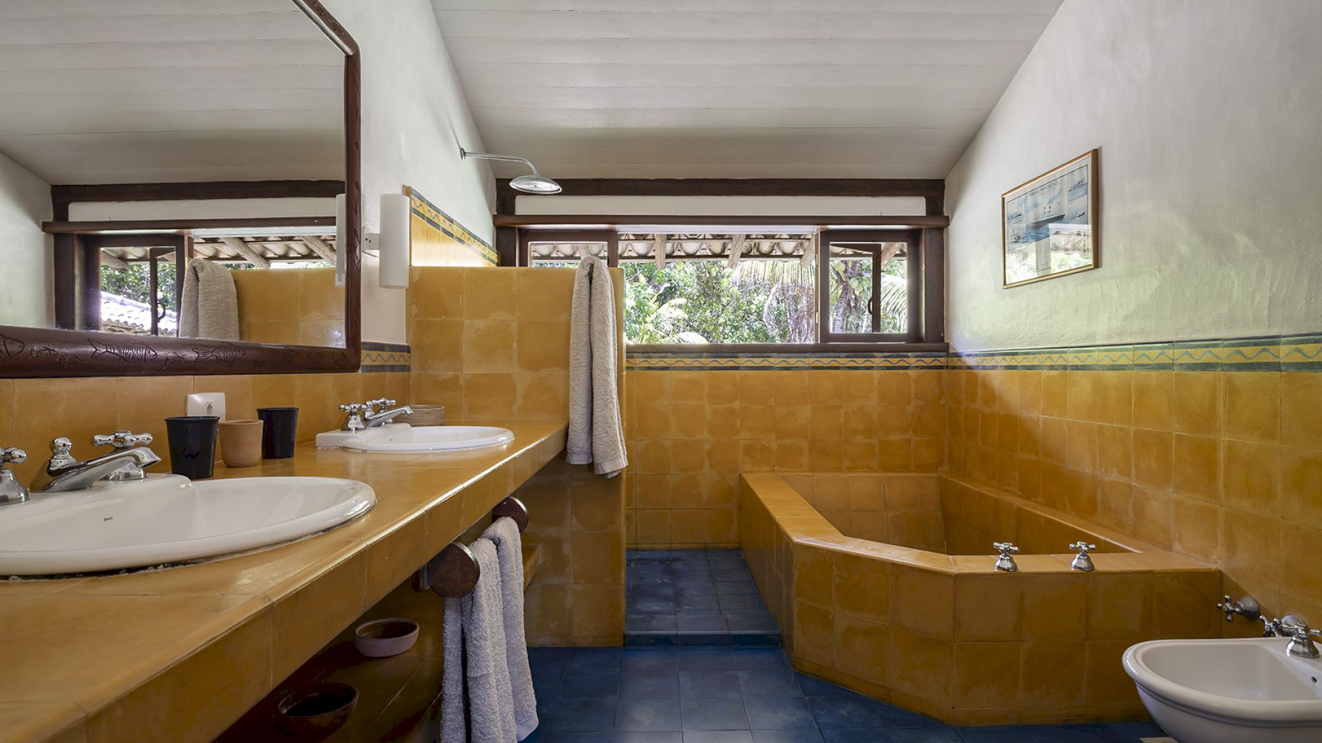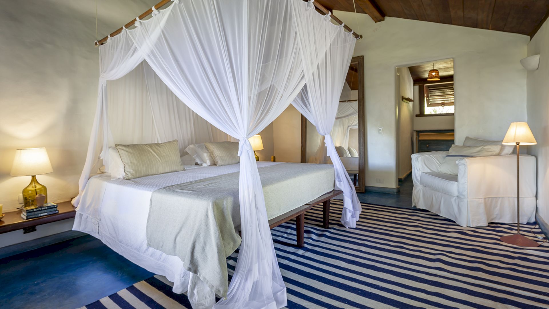 A villa acomoda até 14 hóspedes em 5 suítes e 2 quartos distribuídos entre a casa principal e a casa de hóspedes: