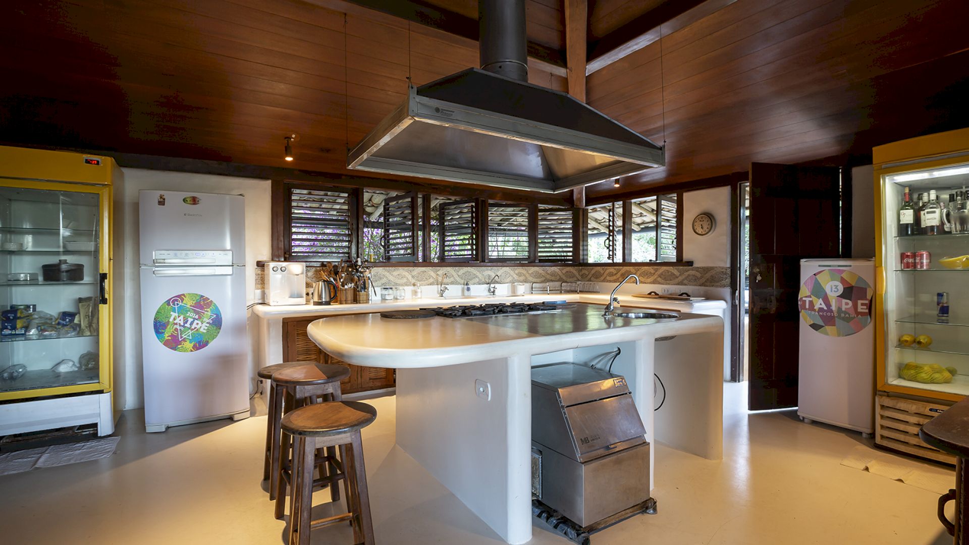 • Cozinha completa com fogão industrial, forno, coifa, 3 geladeiras, freezer, forno de pizza, máquina de gelo, despensa e armários