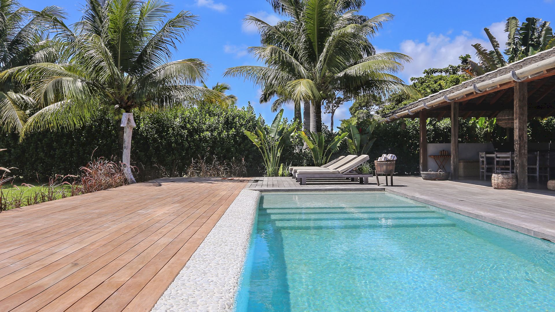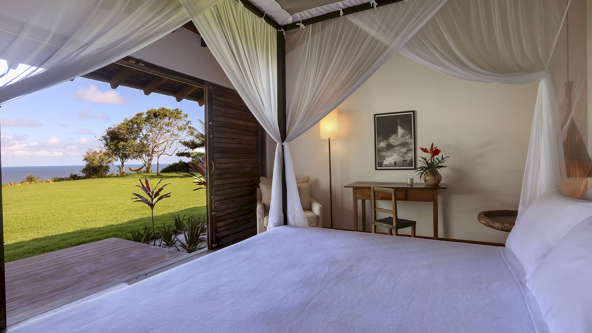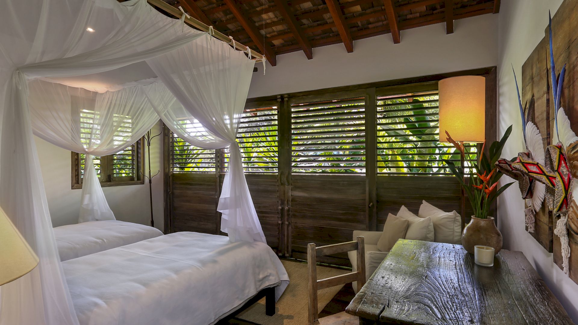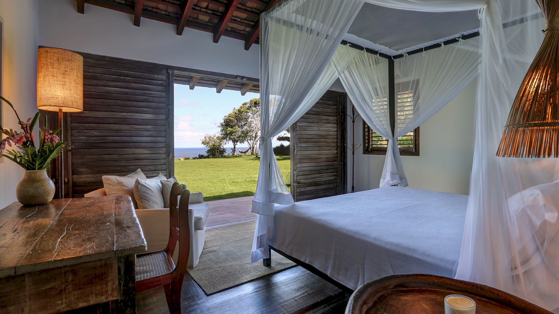 A villa acomoda até 10 hóspedes em 5 suítes espaçosas, todas equipadas com cofre, ar-condicionado e mosquiteiro: