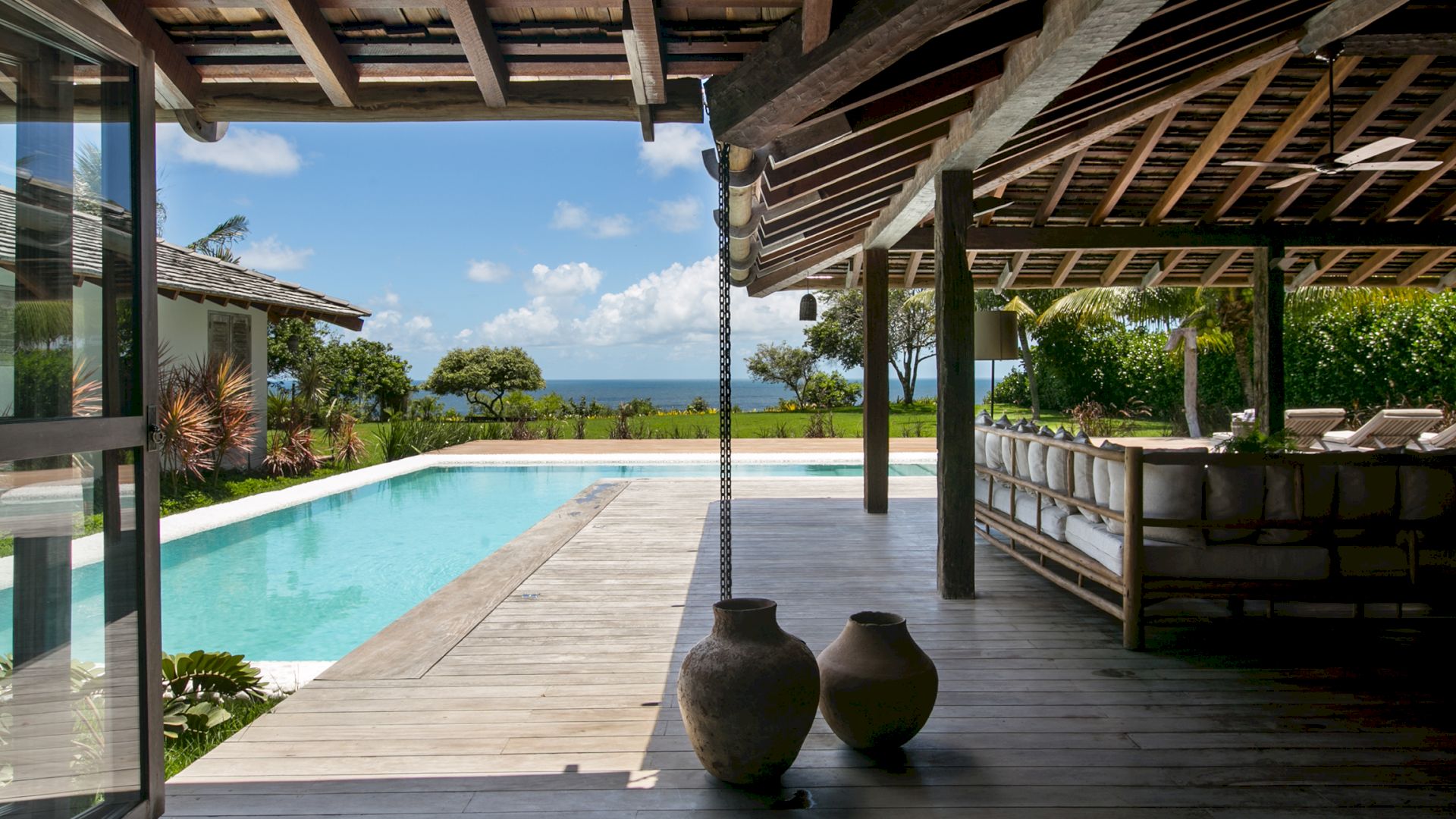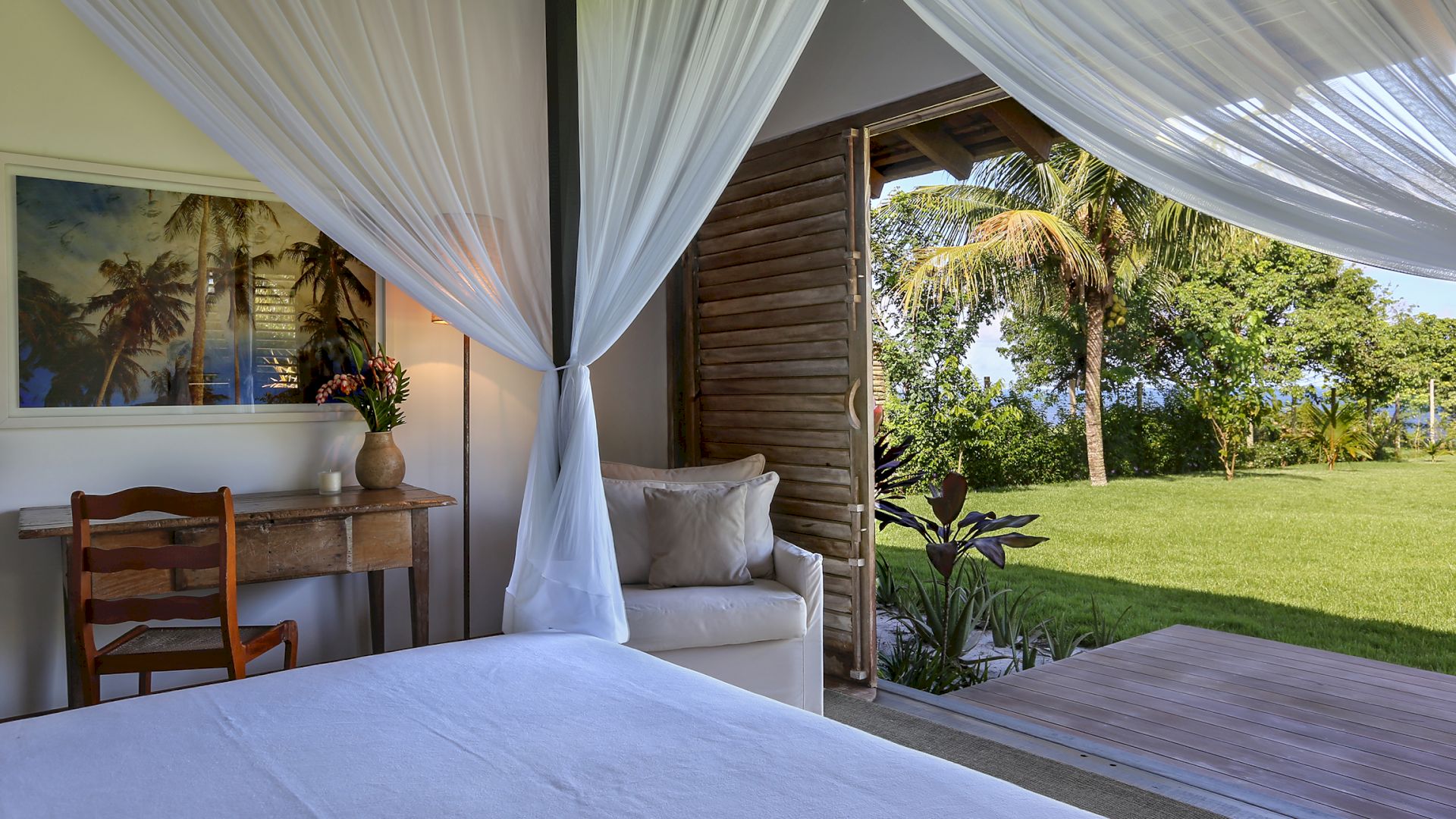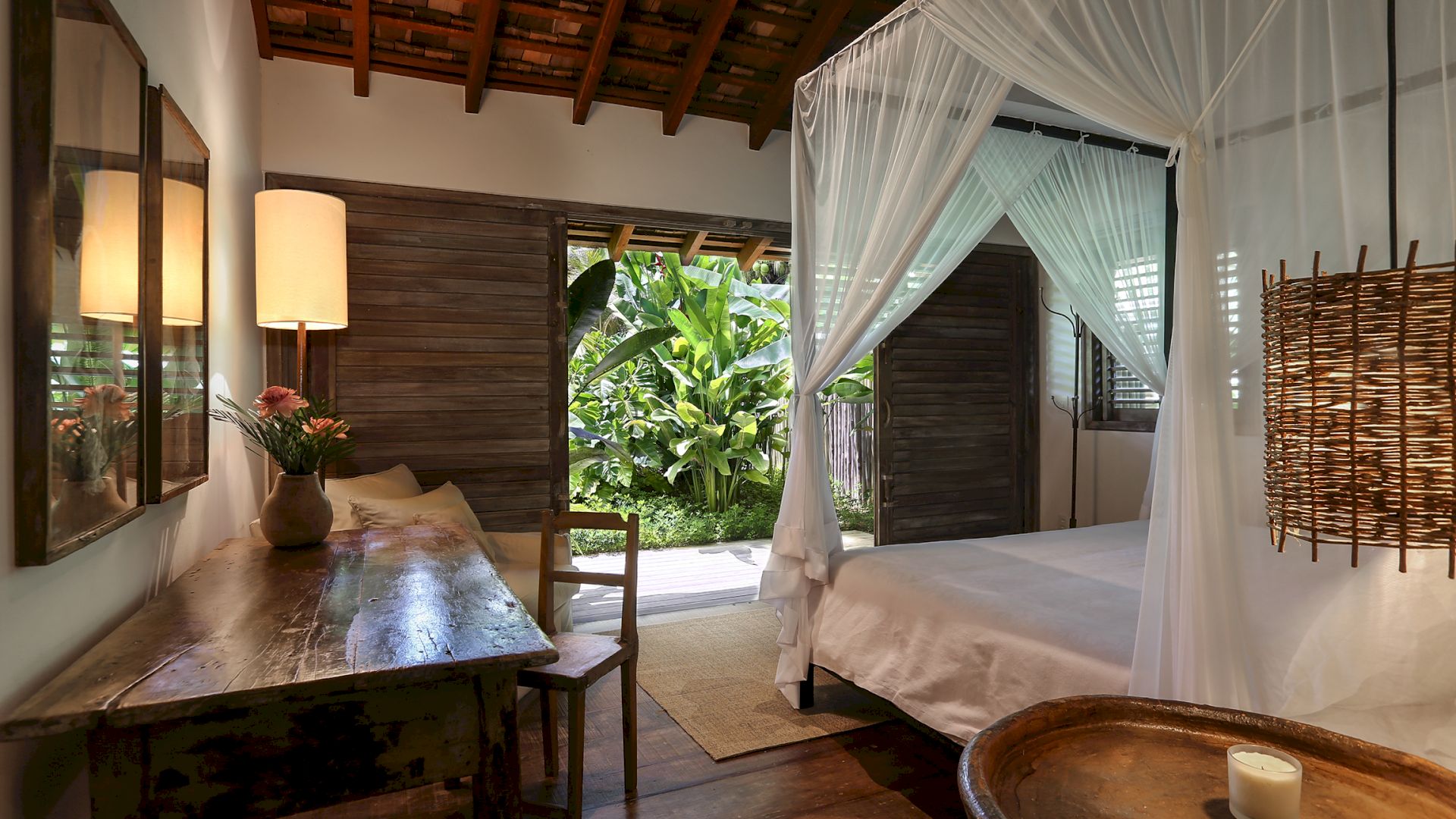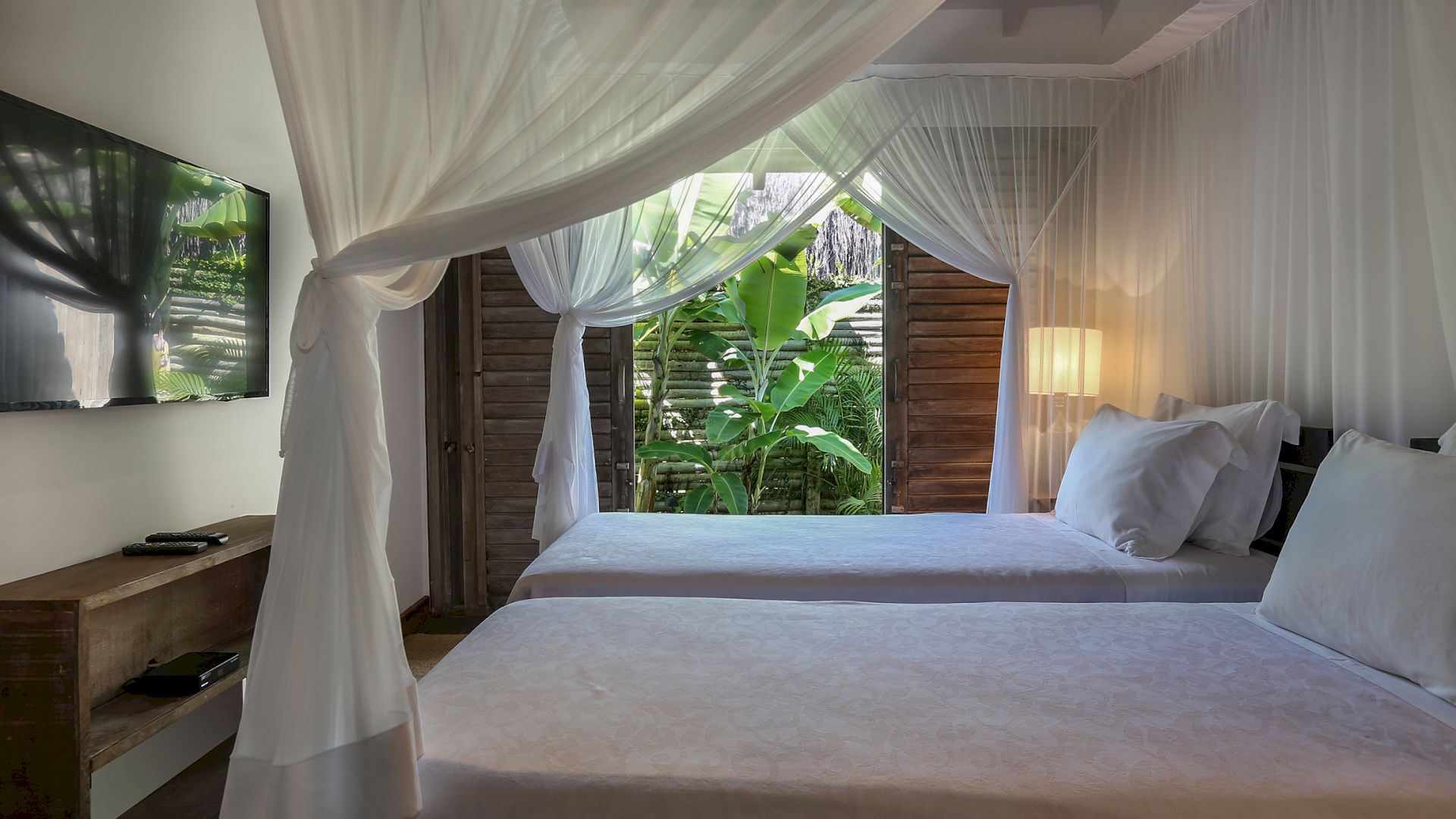 A villa acomoda até 10 hóspedes em 5 suítes espaçosas, todas equipadas com cofre, ar-condicionado e mosquiteiro: