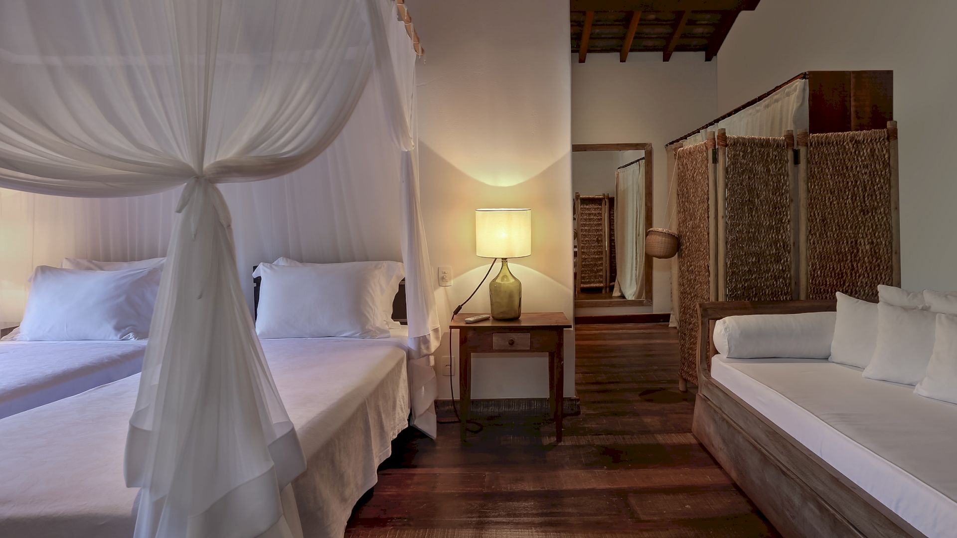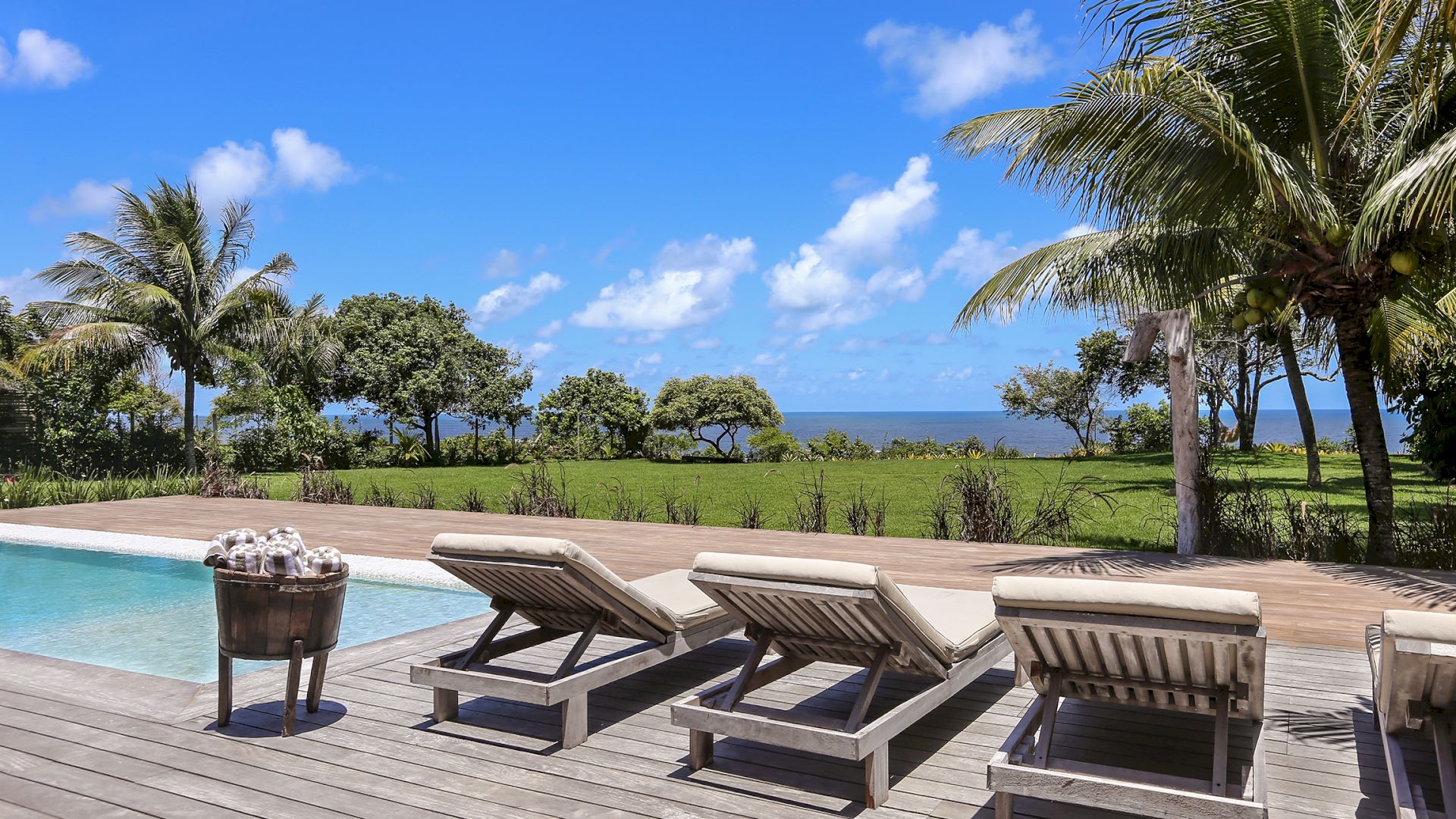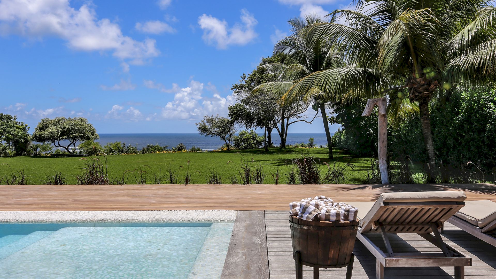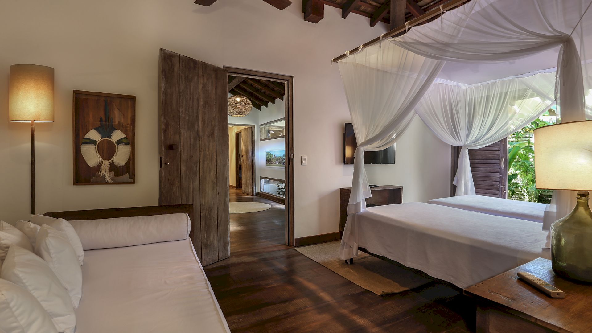 A villa acomoda até 10 hóspedes em 5 suítes espaçosas, todas equipadas com cofre, ar-condicionado e mosquiteiro: