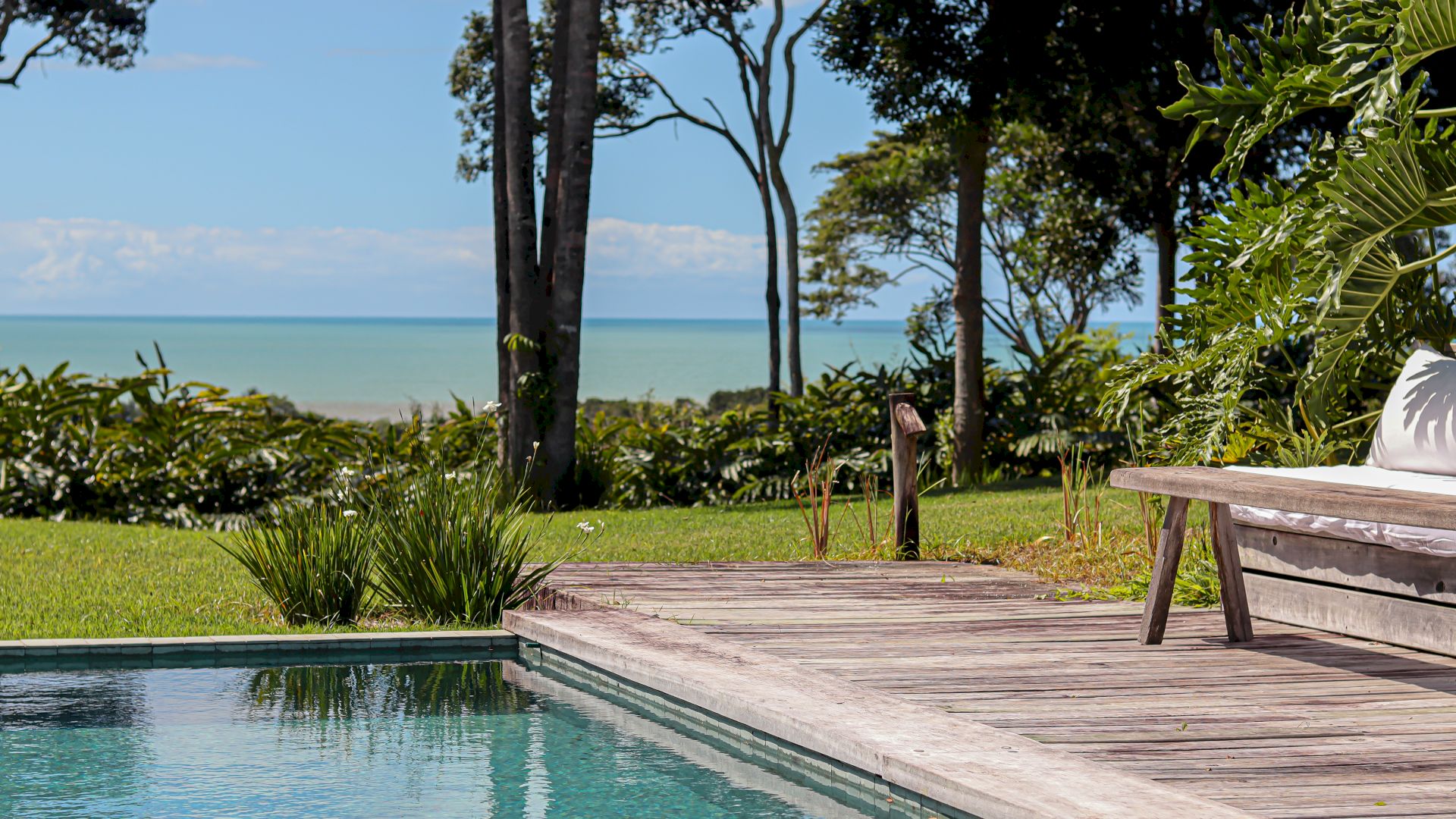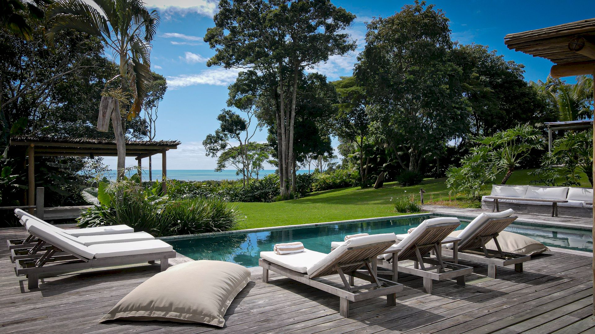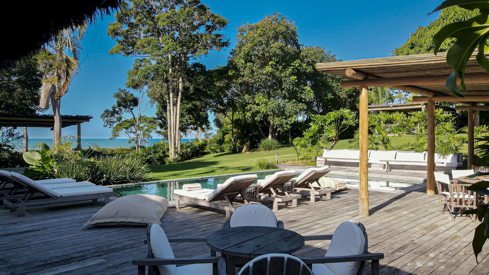 Área externa com piscina, espreguiçadeiras e vista para o mar