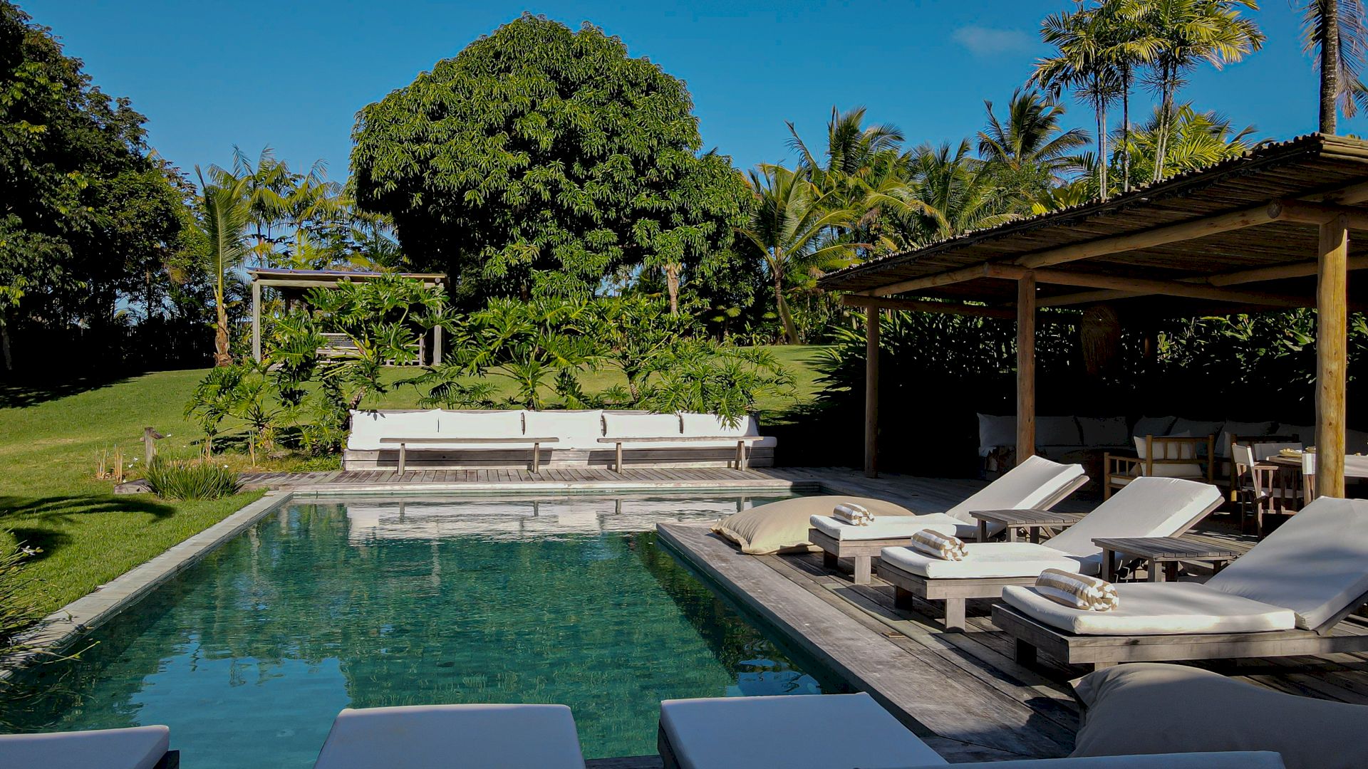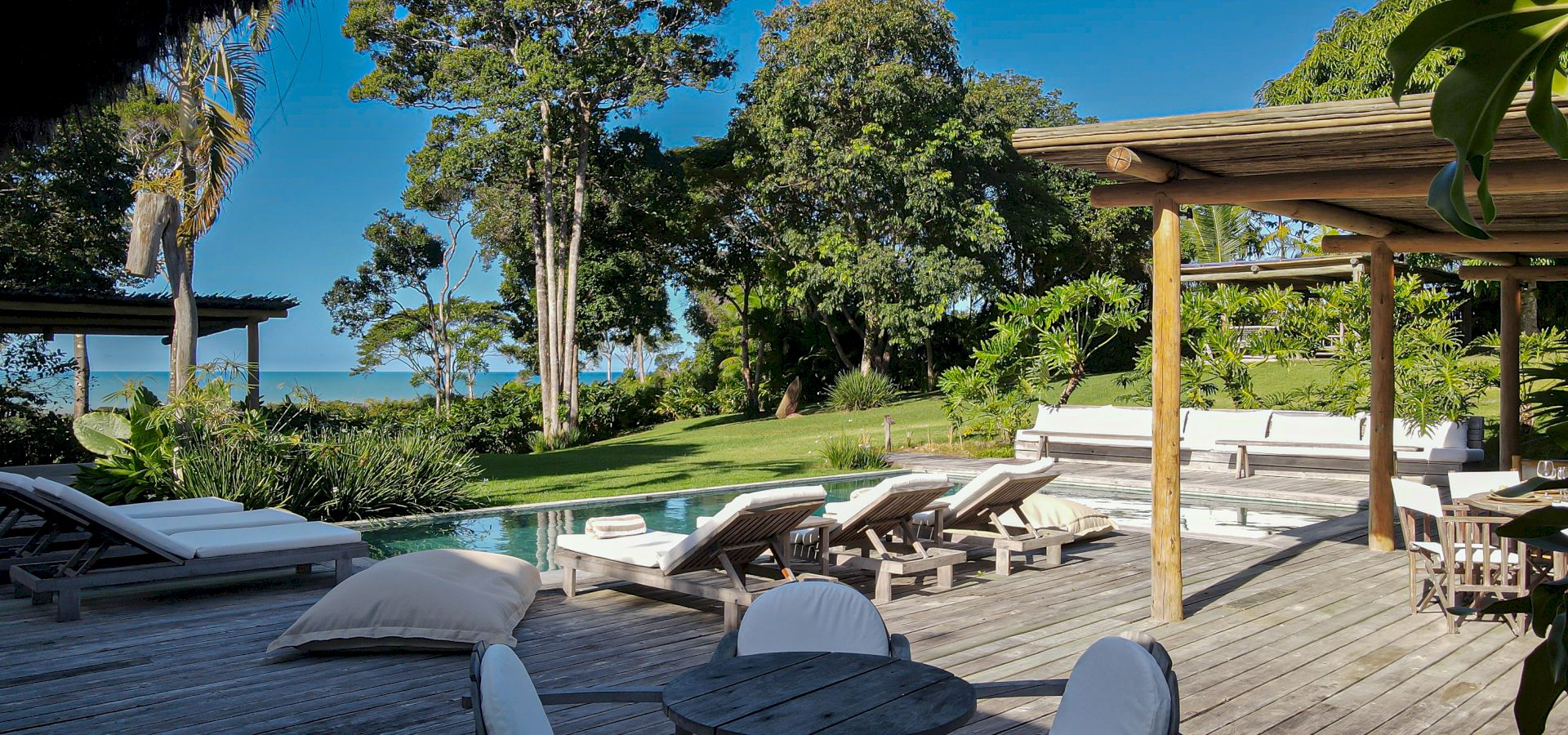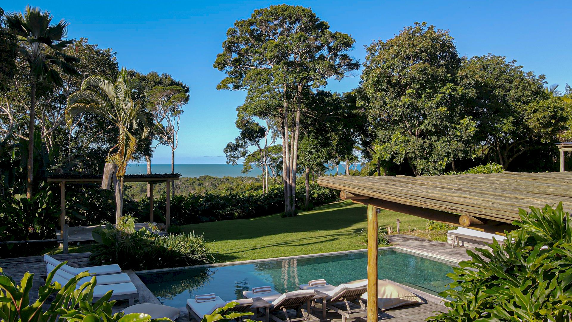Área externa com piscina, espreguiçadeiras e vista para o mar