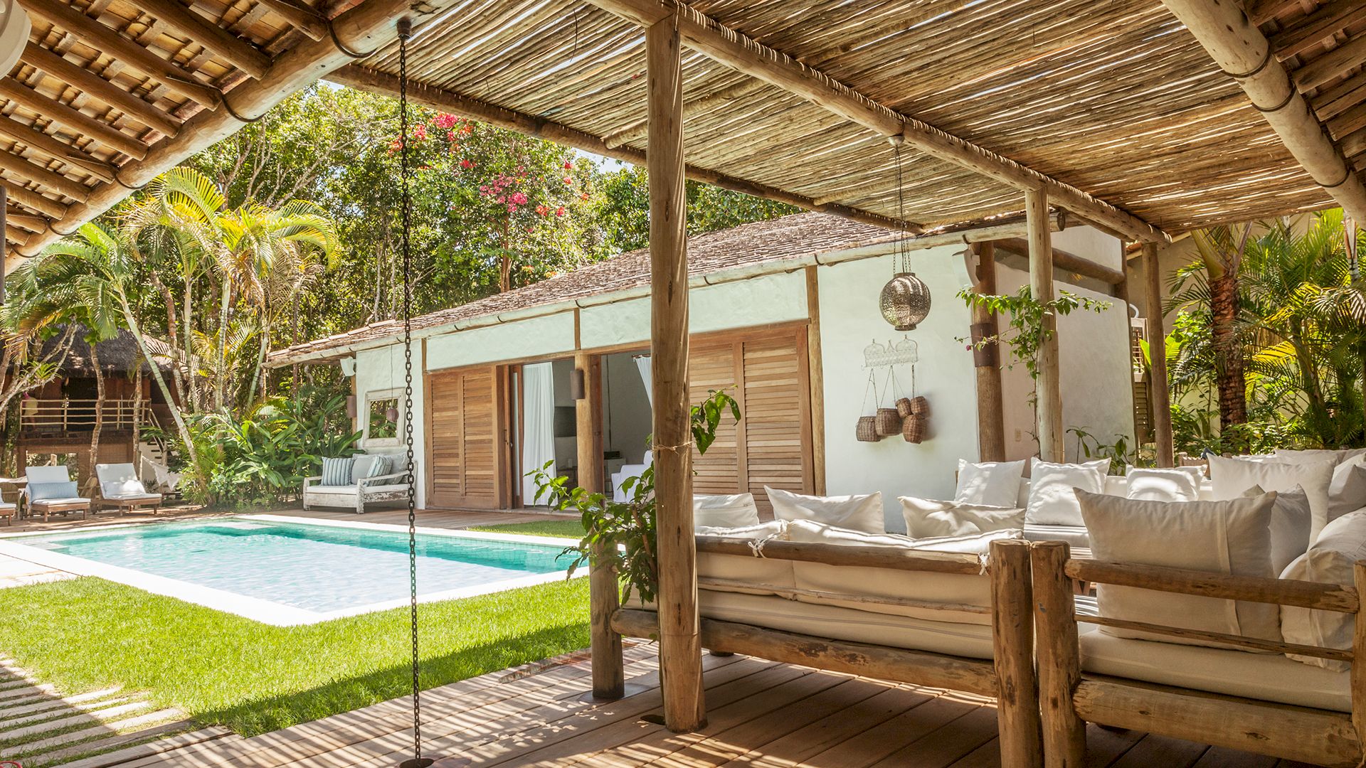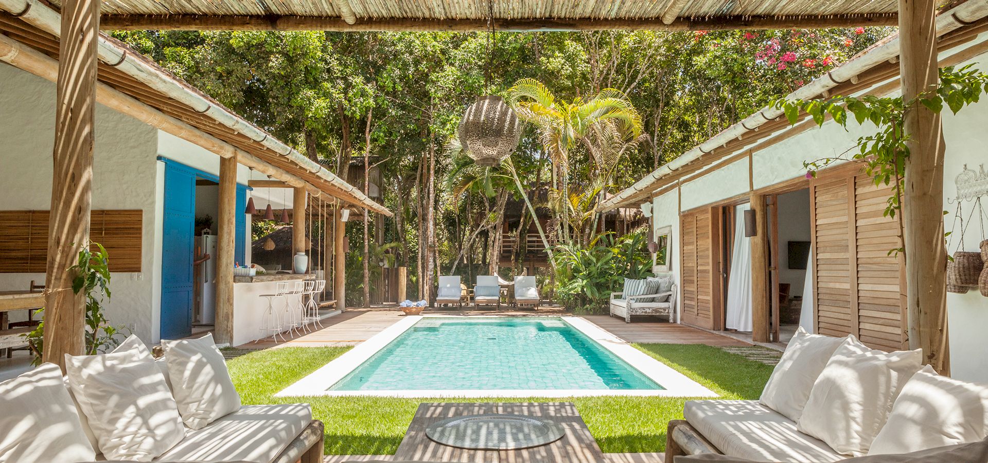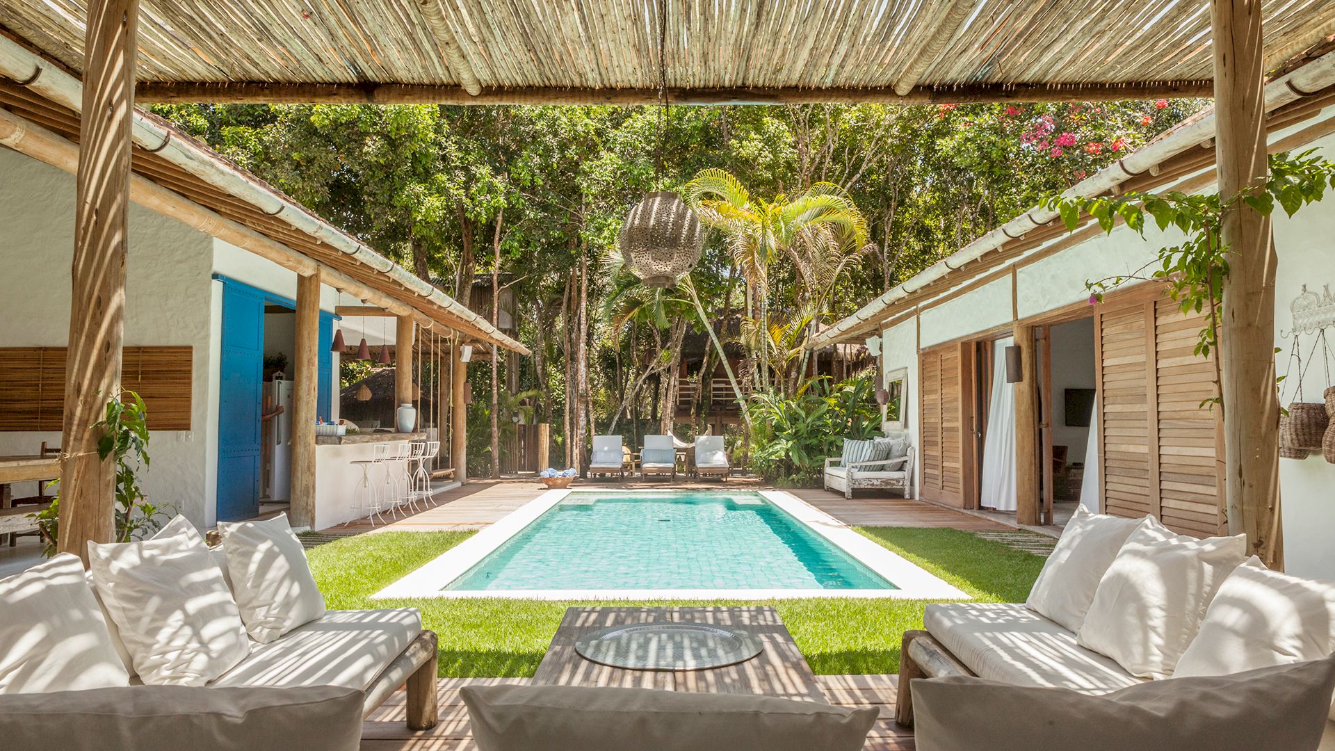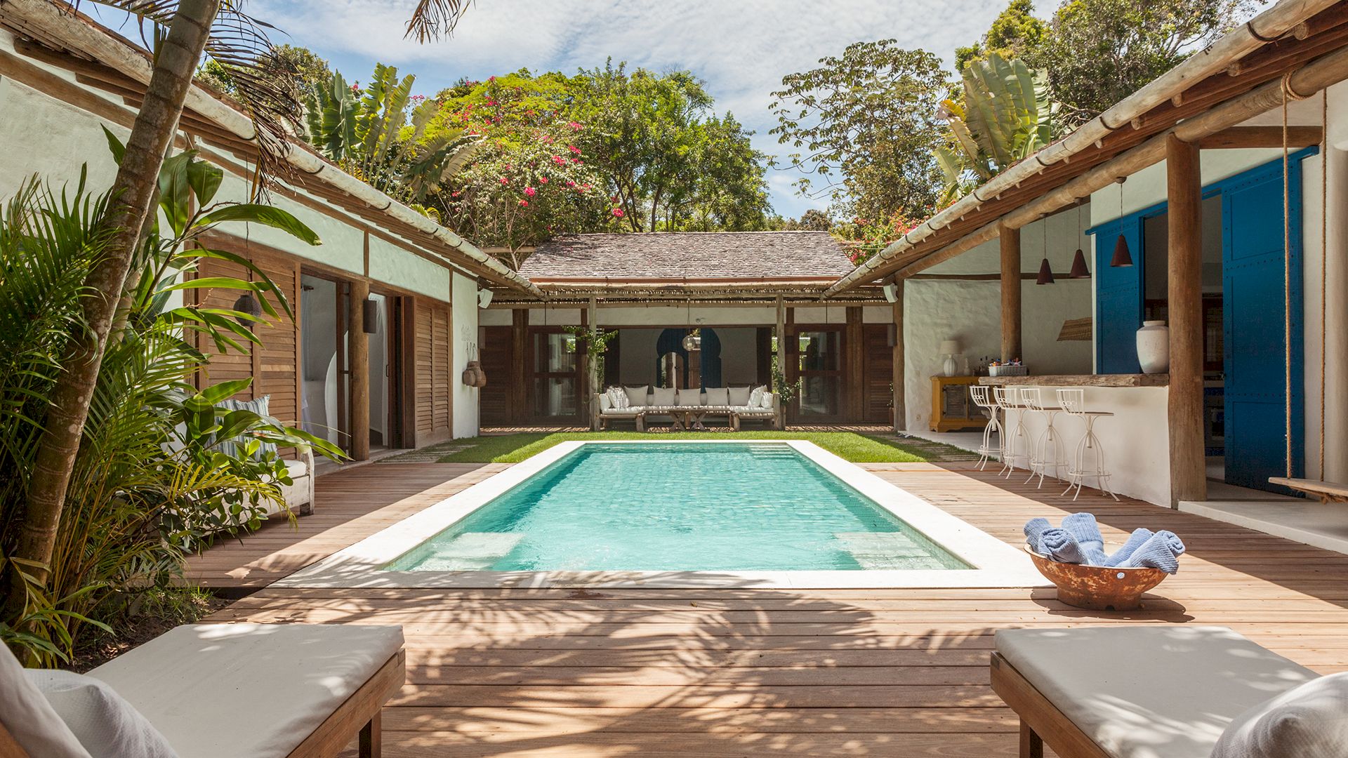 A piscina é o centro da casa, rodeada pela ampla sala de estar, quartos espaçosos, cozinha aberta e churrasqueira.