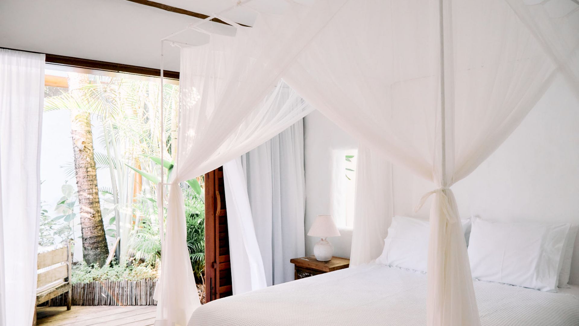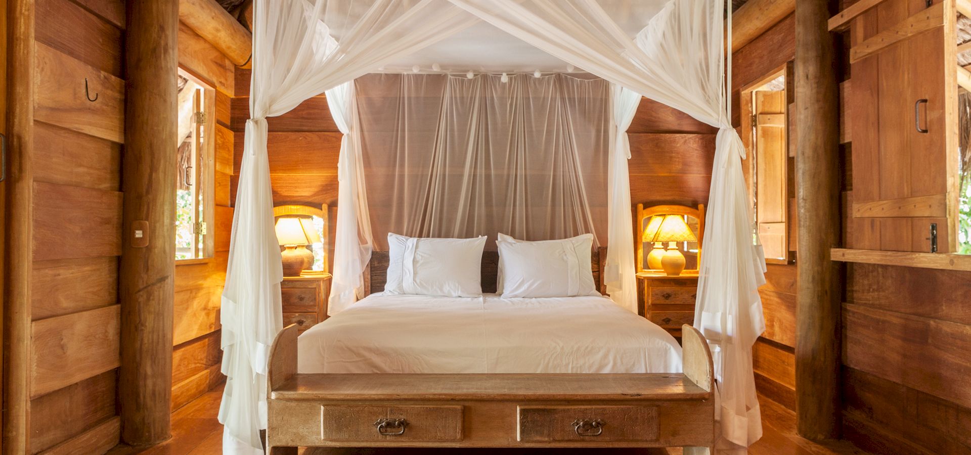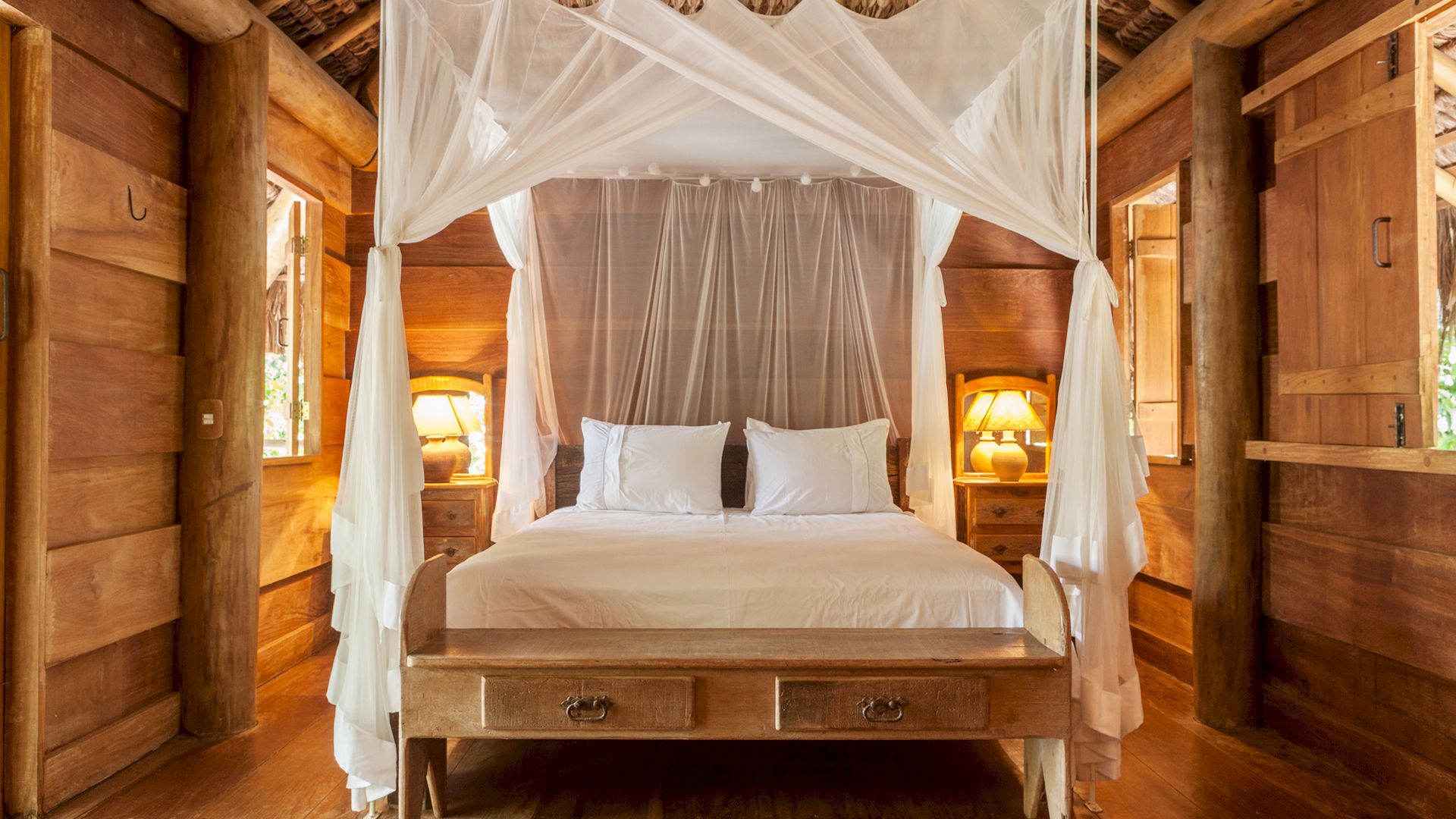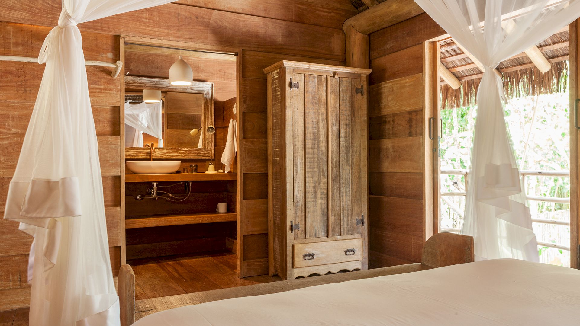 As quatro suítes, sendo uma a casa da árvore, são todas equipadas com ar condicionado, mosquiteiro.