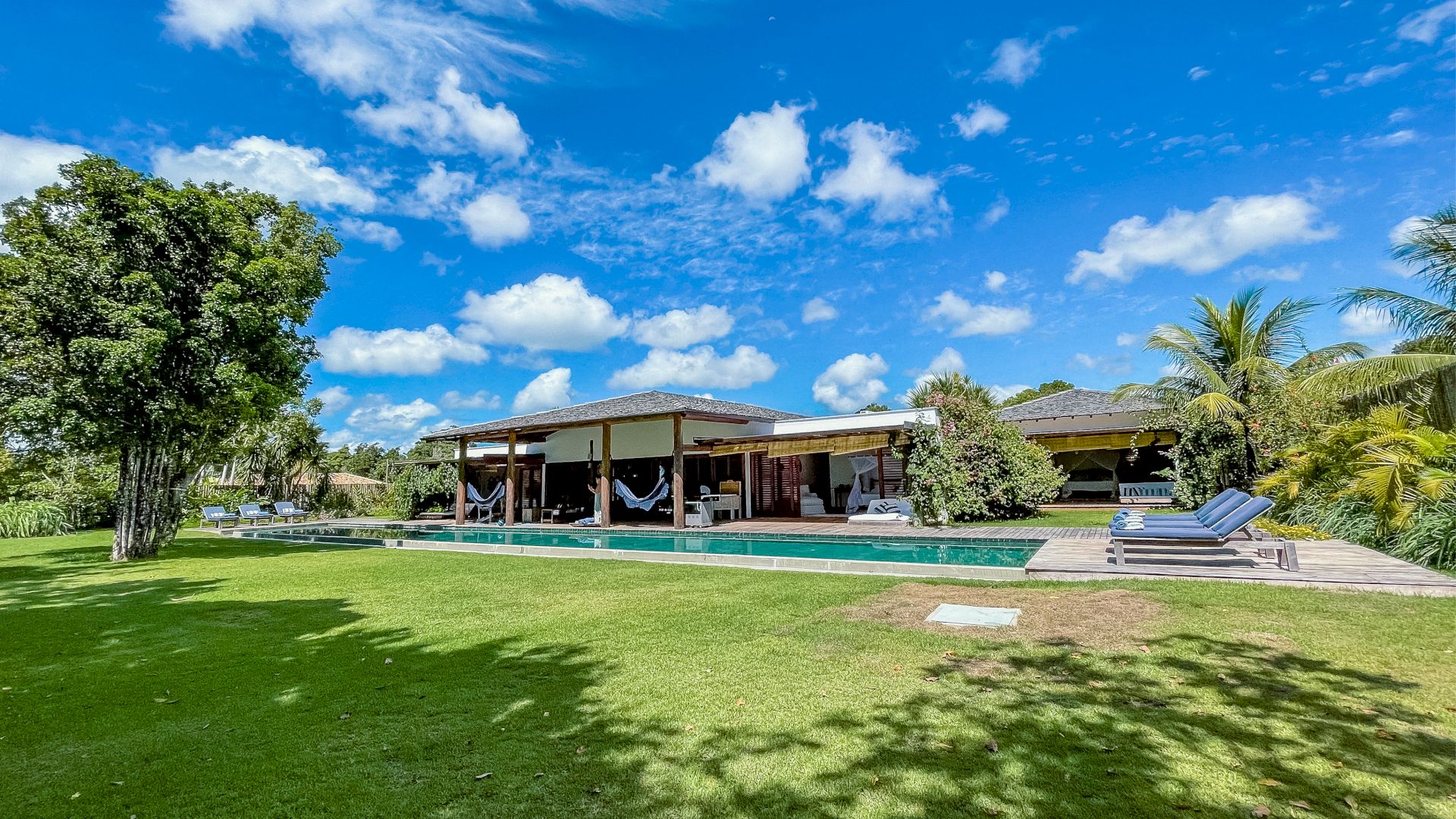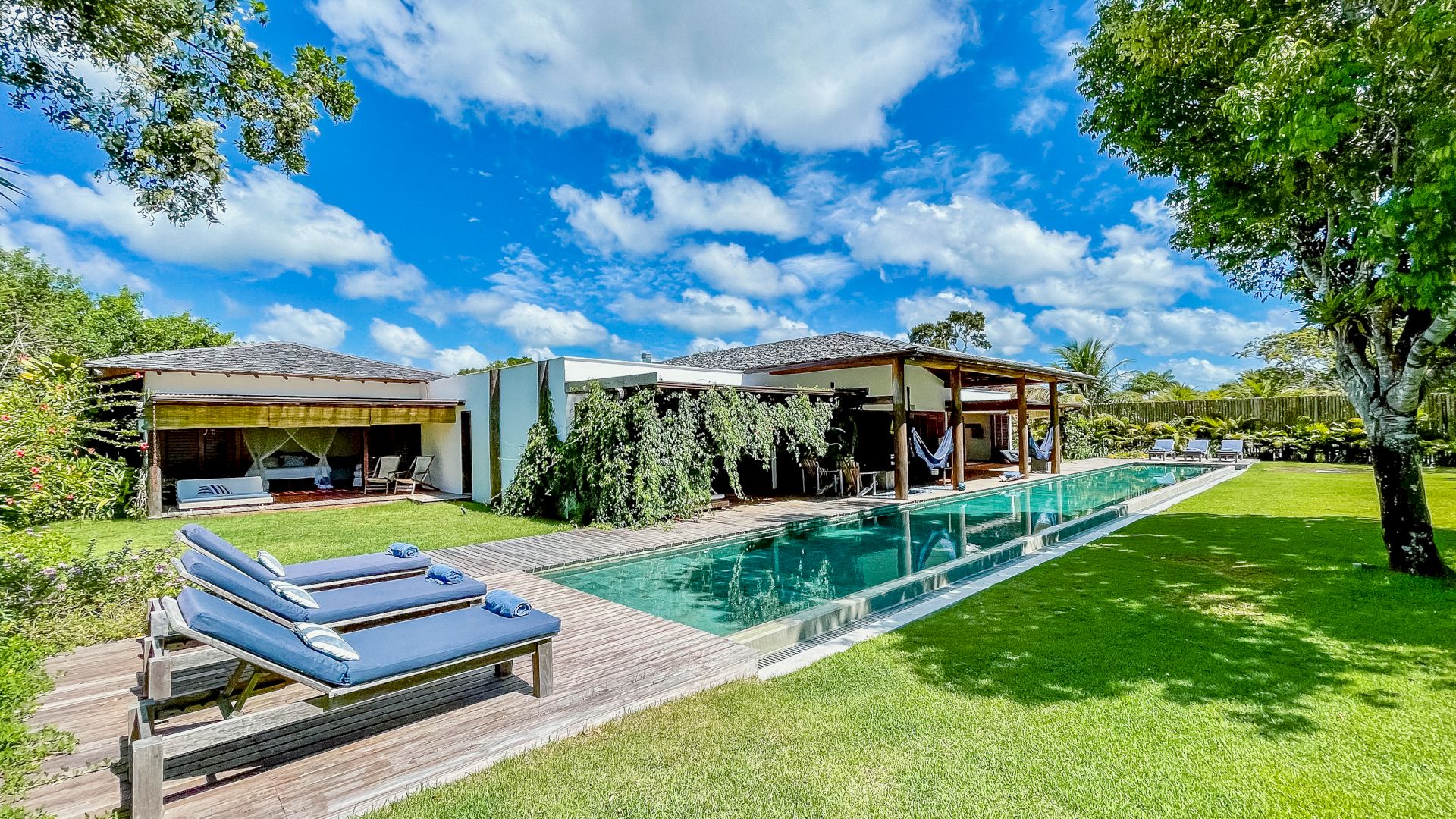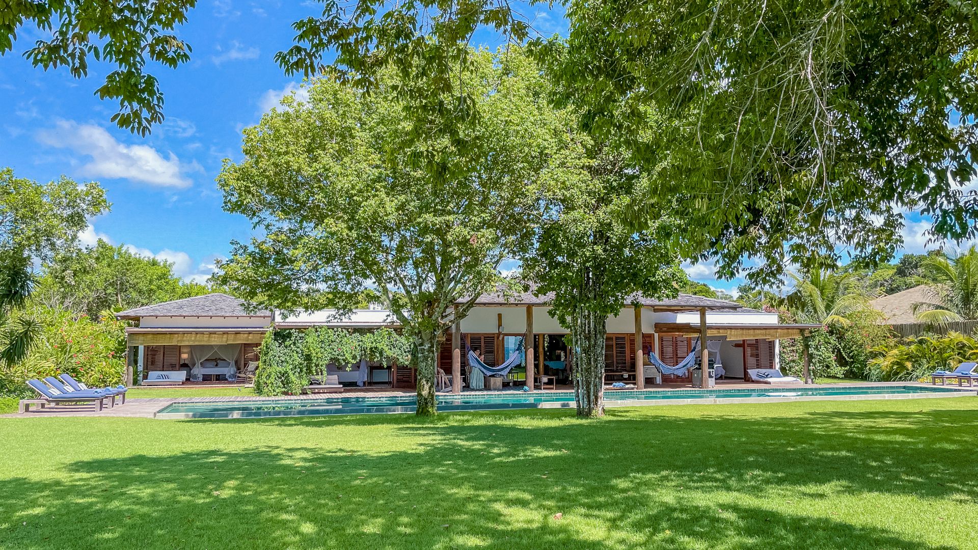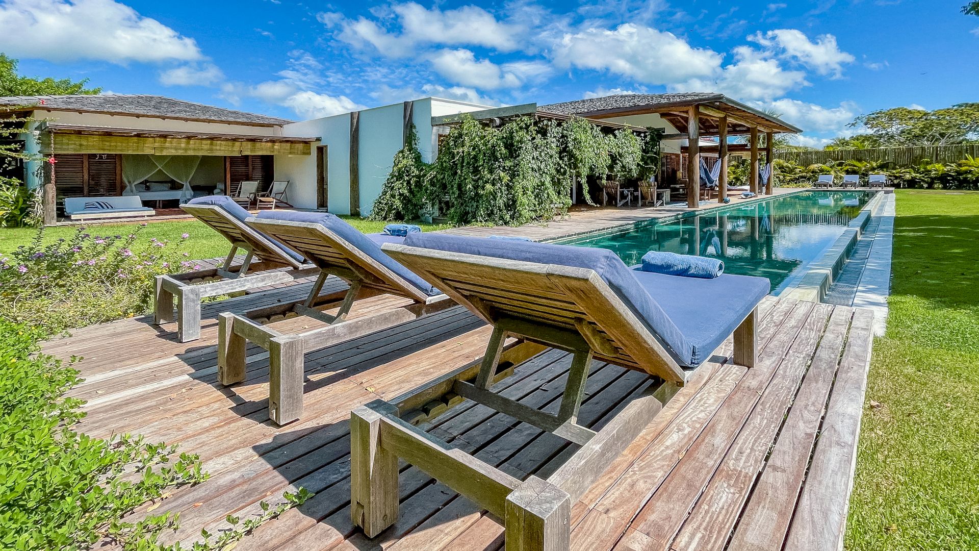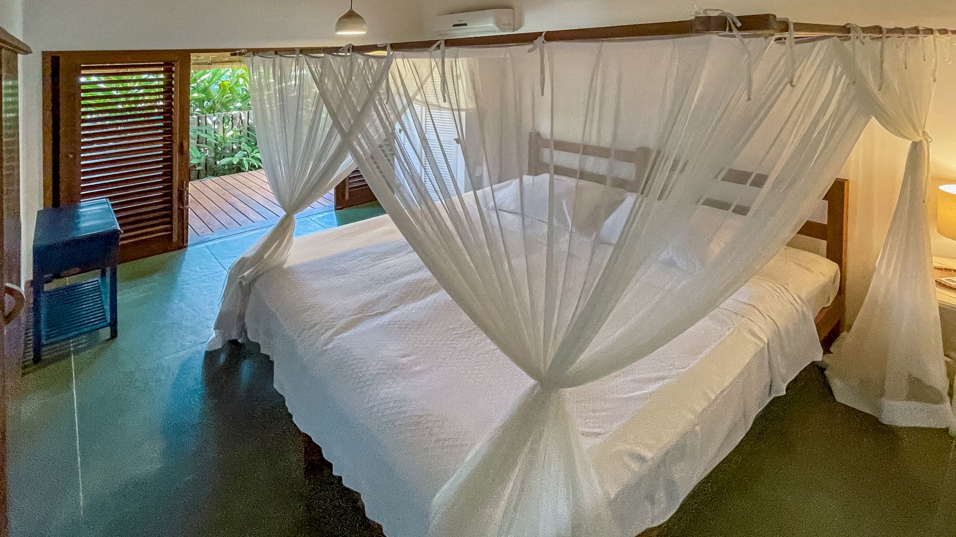 A villa acomoda até 10 hóspedes em 5 suítes espaçosas, todas equipadas com ar-condicionado e mosquiteiro:
