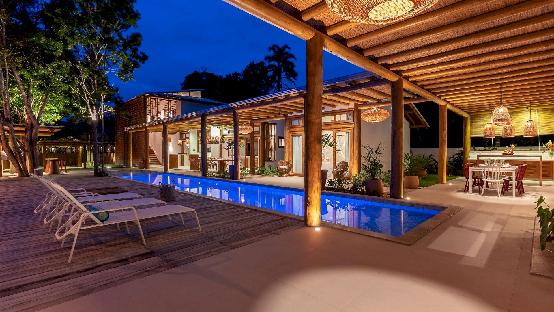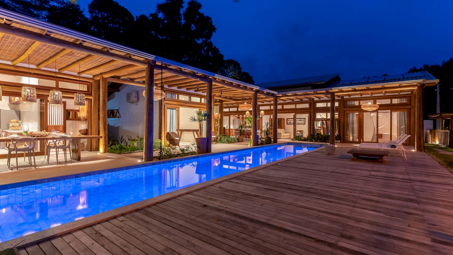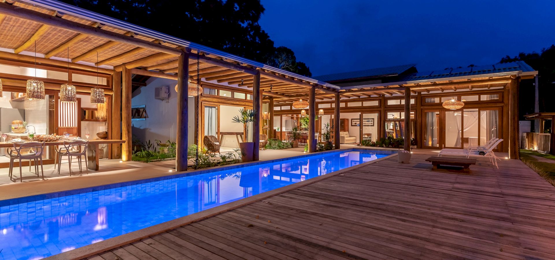 A casa possui 7 suÃtes que acomodam 15 hóspedes confortavelmente. Toda equipada com enxoval completo e cozinha completa, a casa dispõe uma parte de lazer completa com uma linda piscina integrando com a varanda, espaço gourmet, churrasqueira, espreguiçadeiras e jardim.