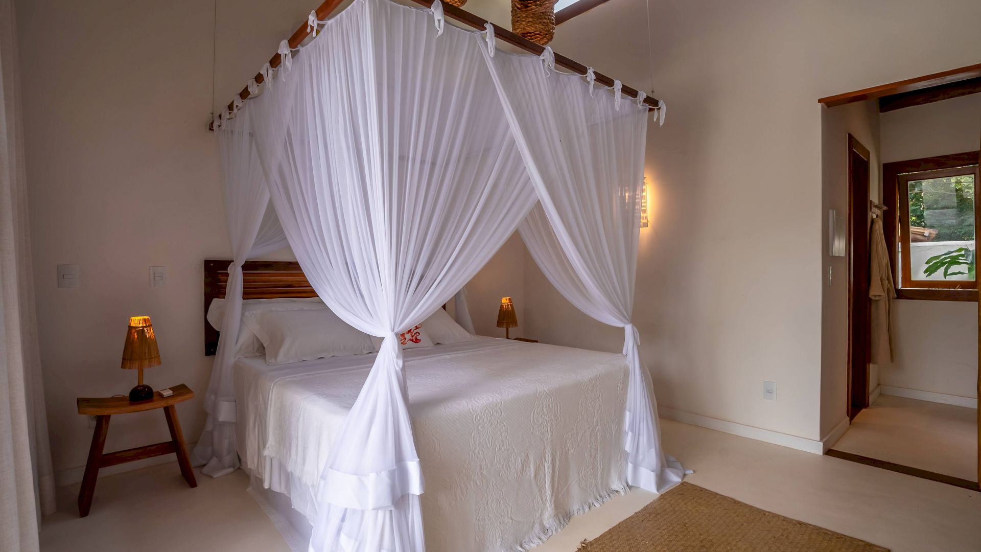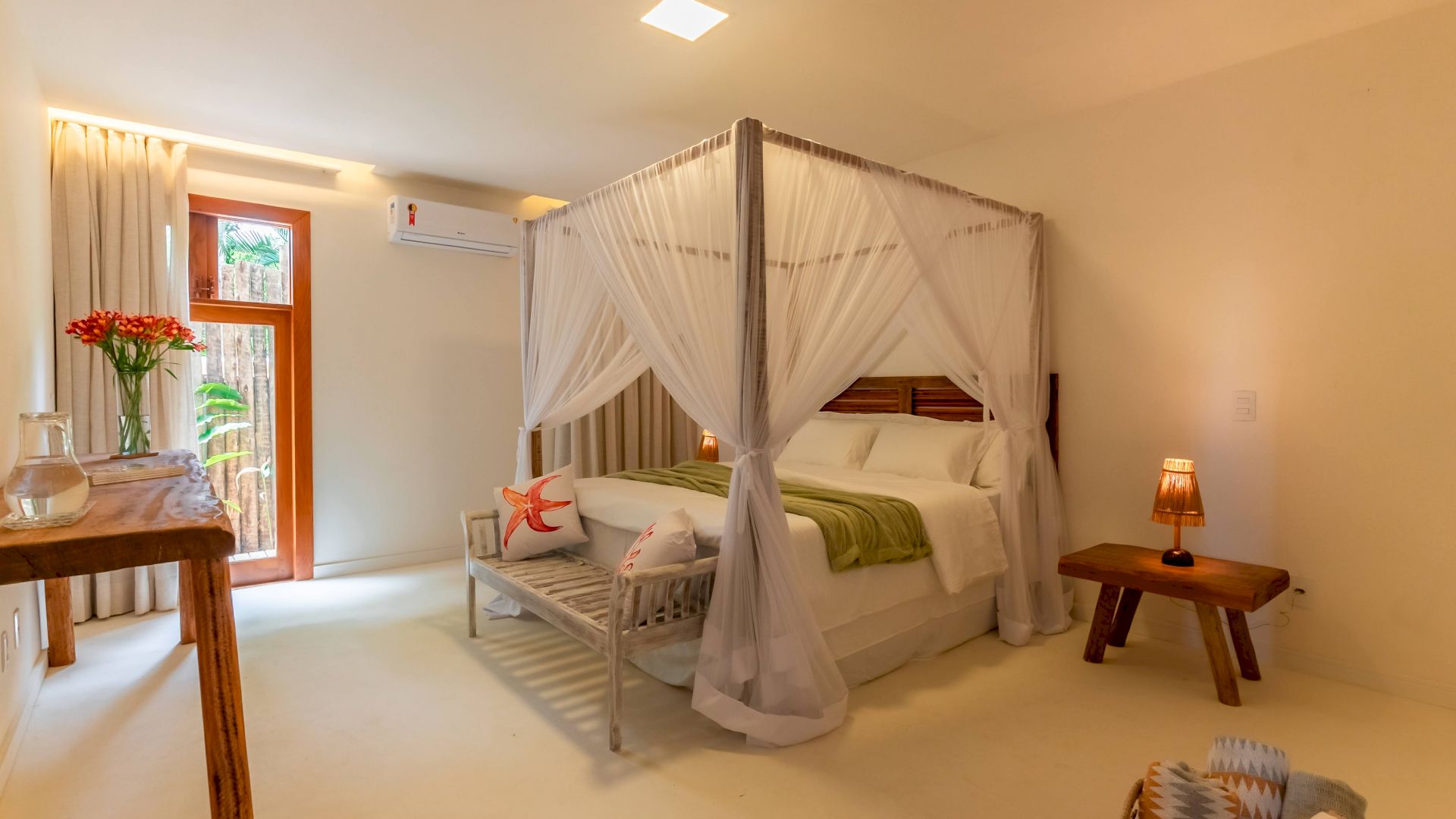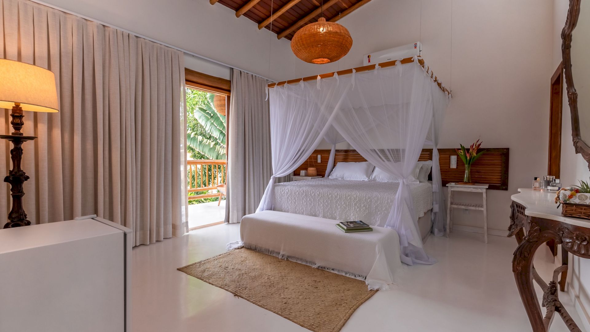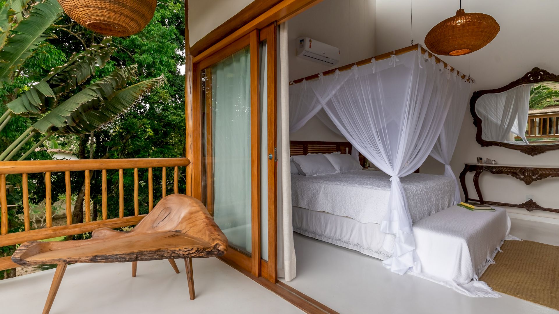 As suÃtes sao equipadas com cama king-size, ar condicionado, closet, mosquiteiro,