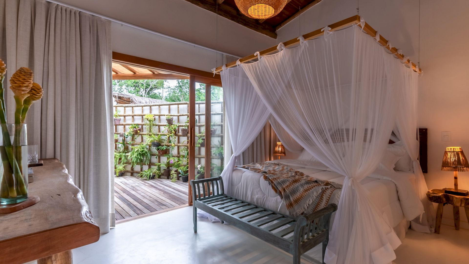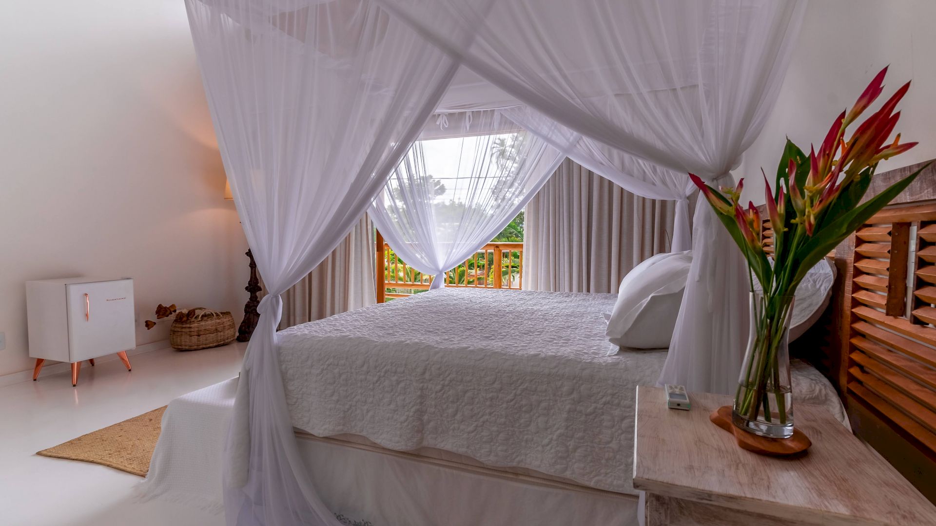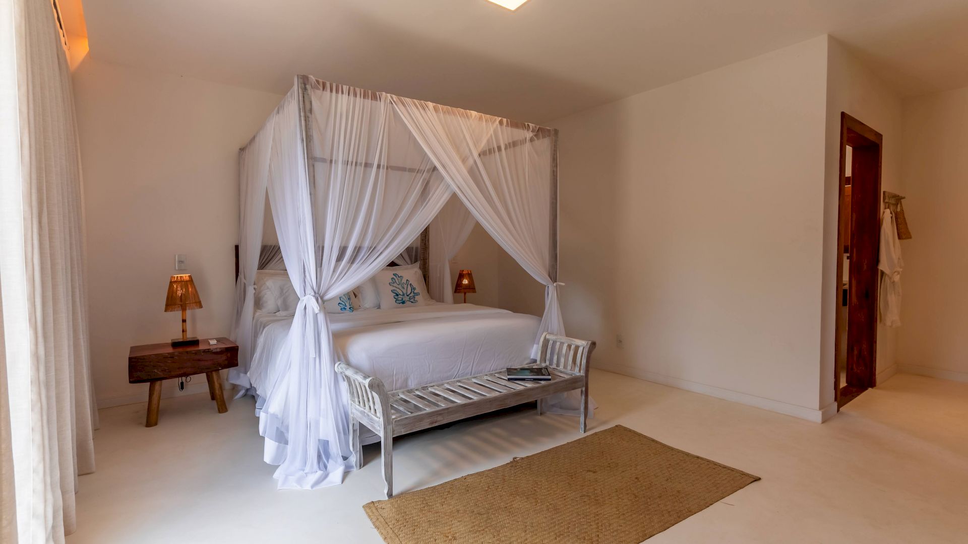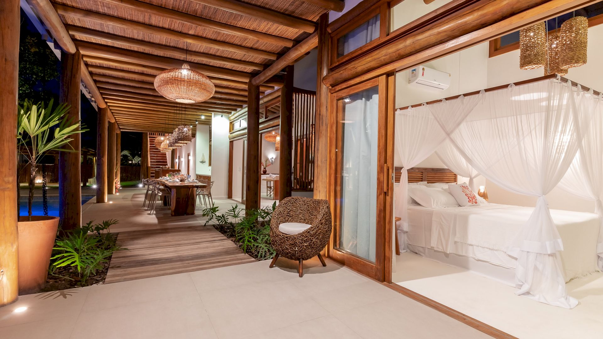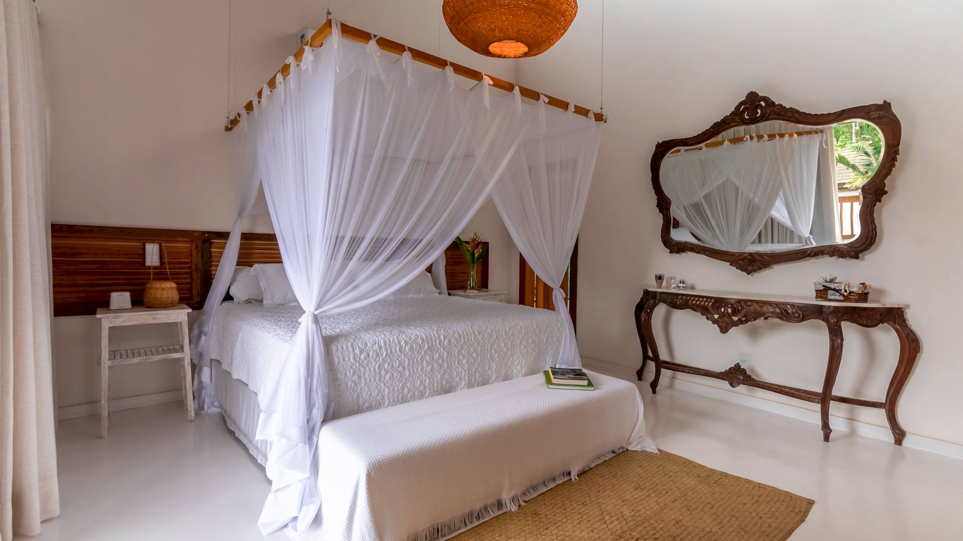 As suÃtes sao equipadas com cama king-size, ar condicionado, closet, mosquiteiro,
