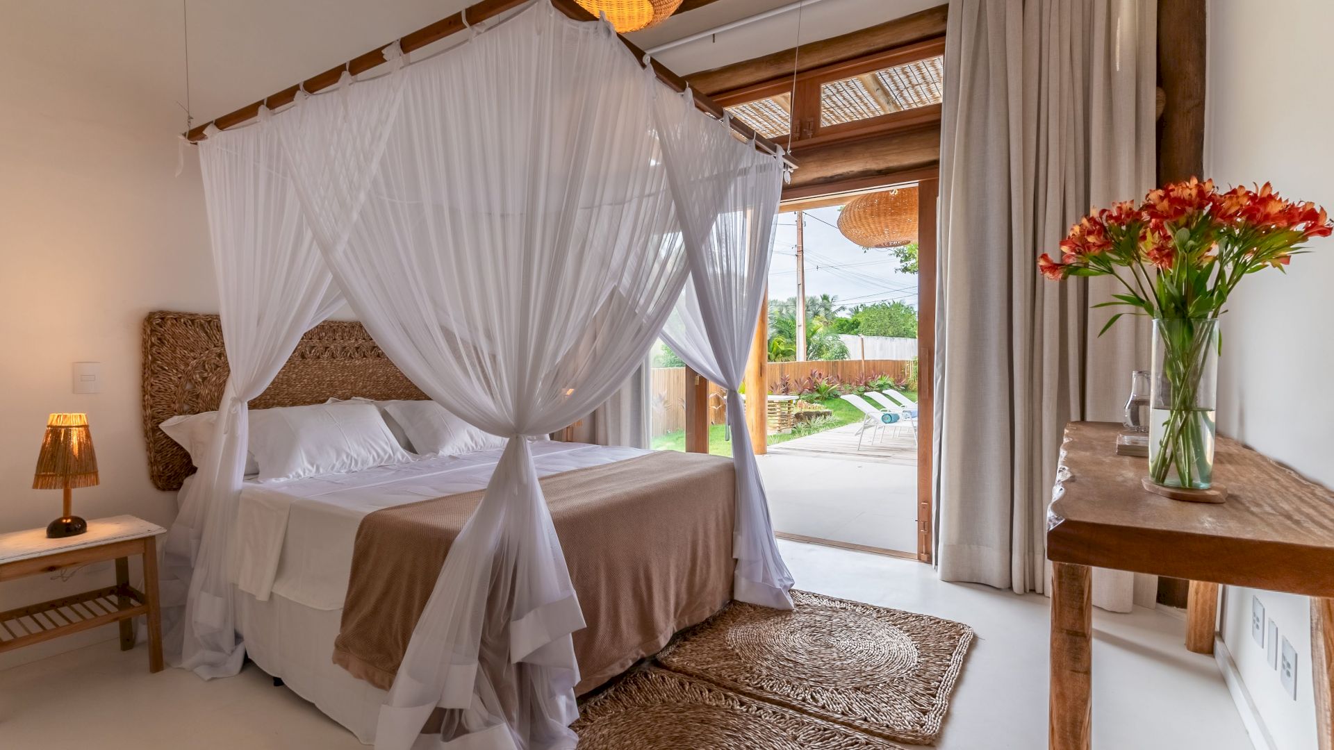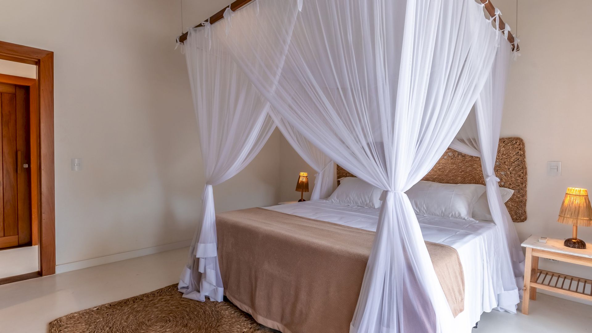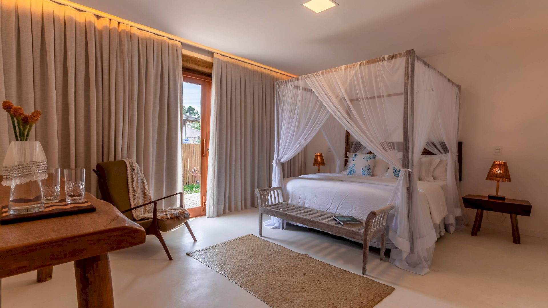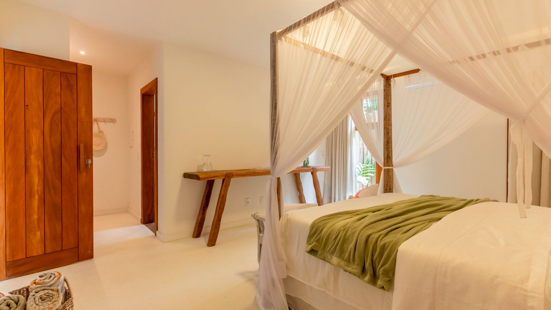 As suÃtes sao equipadas com cama king-size, ar condicionado, closet, mosquiteiro,