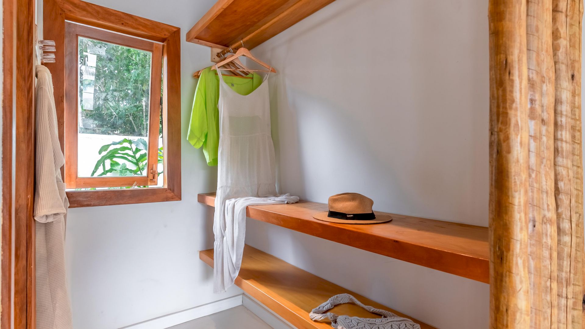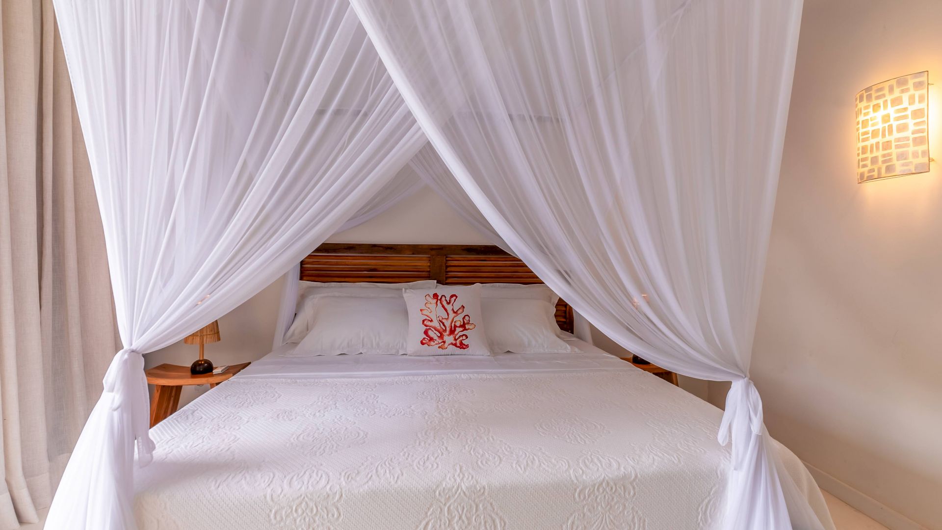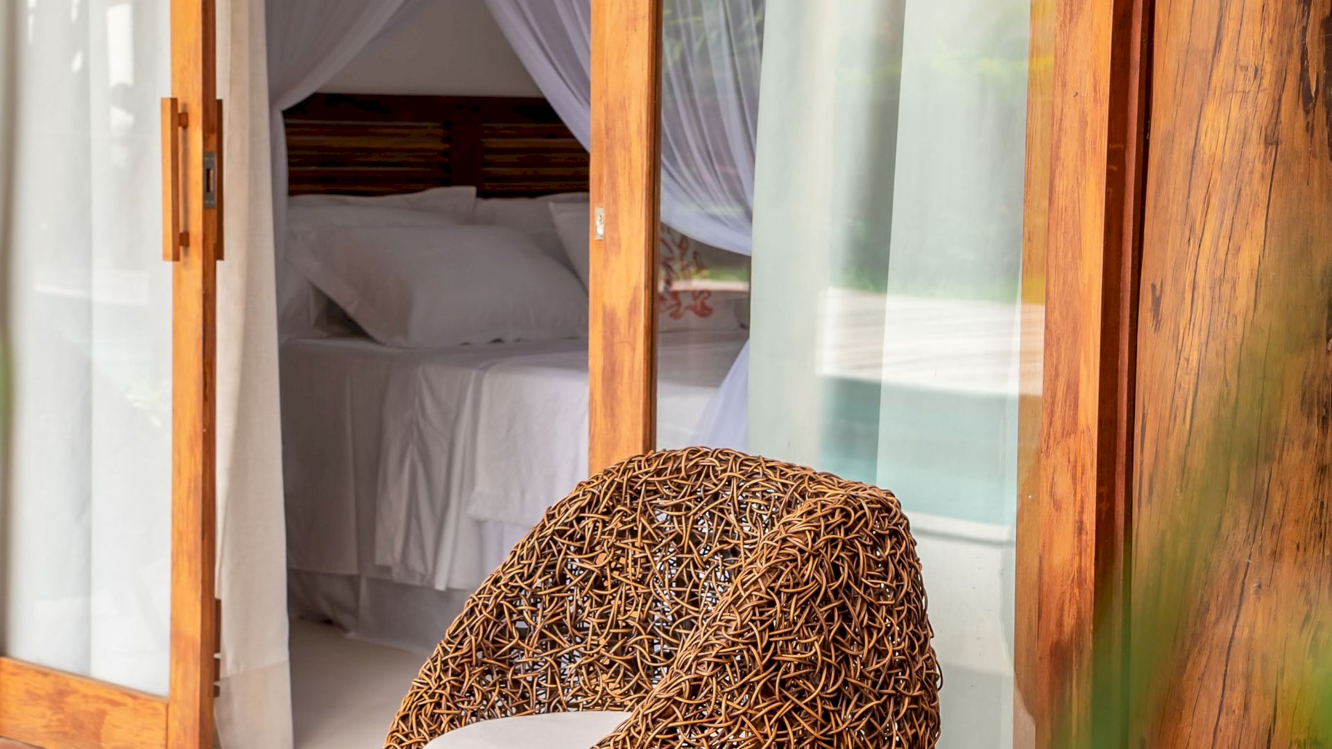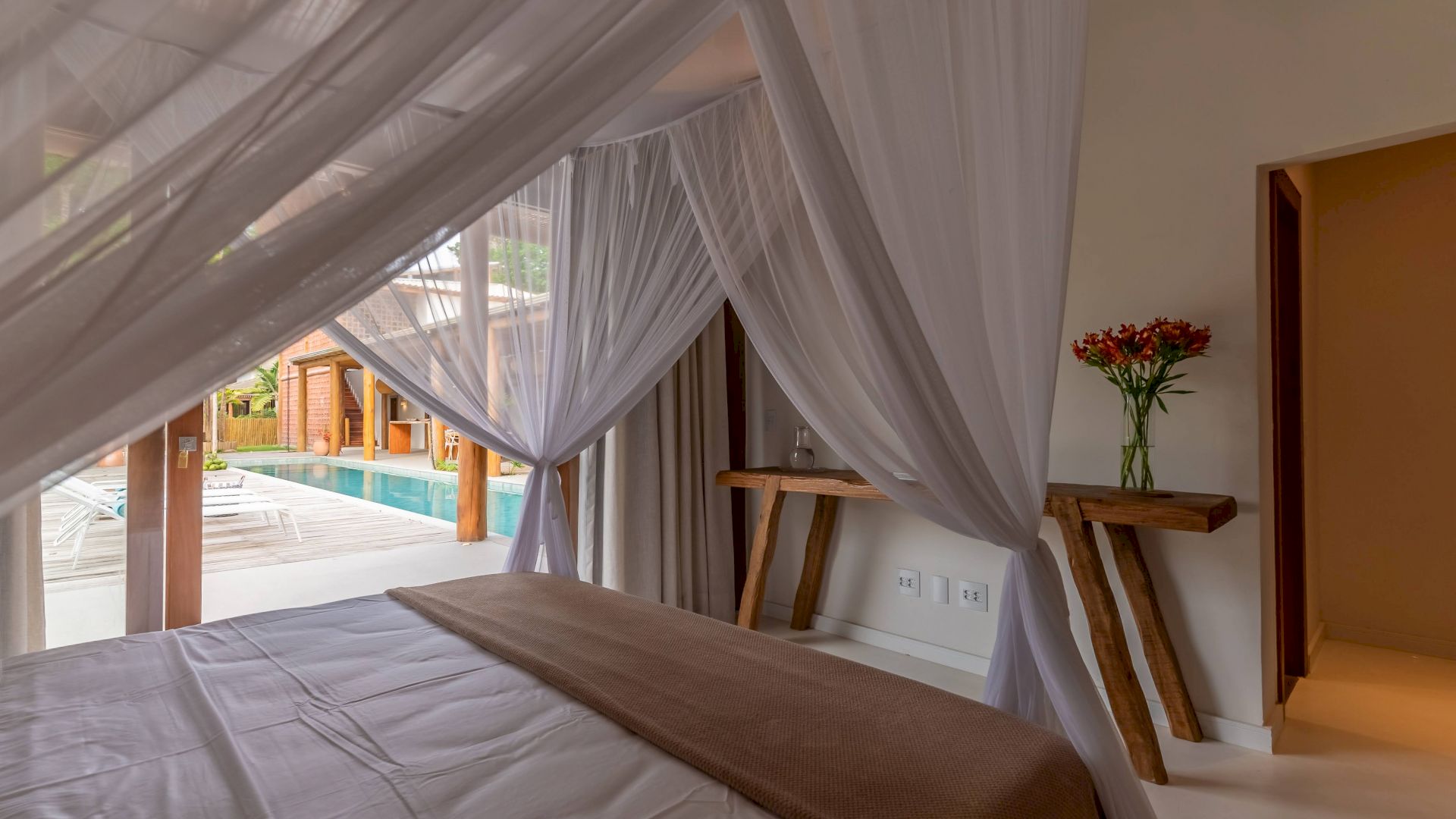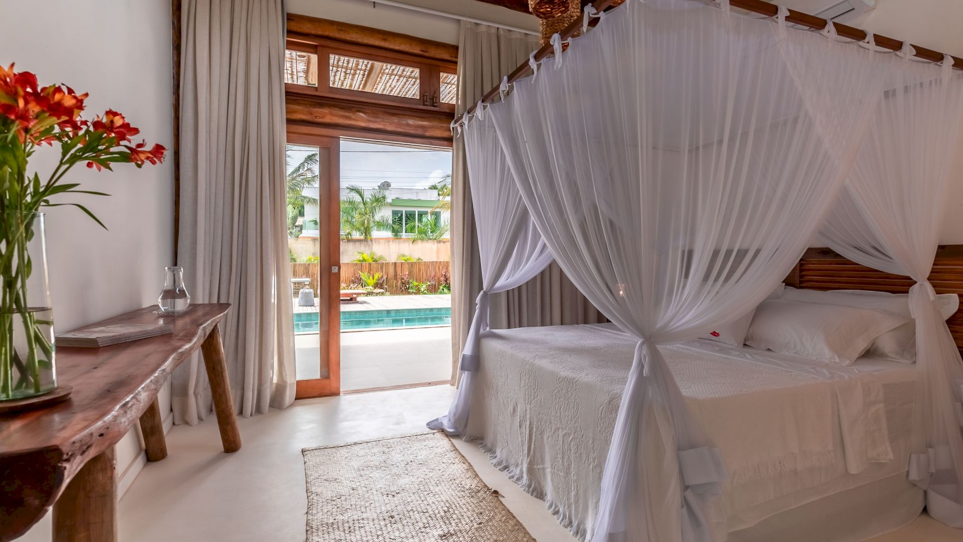 As suÃtes sao equipadas com cama king-size, ar condicionado, closet, mosquiteiro,