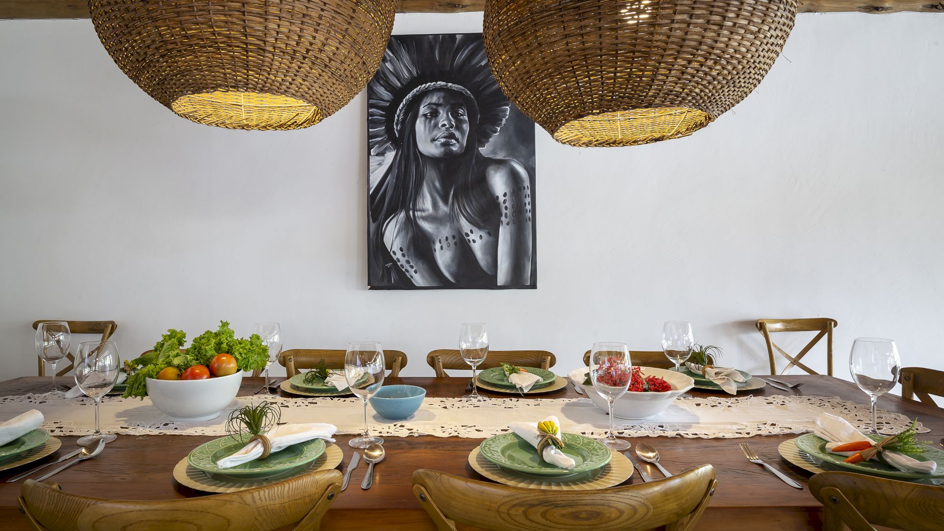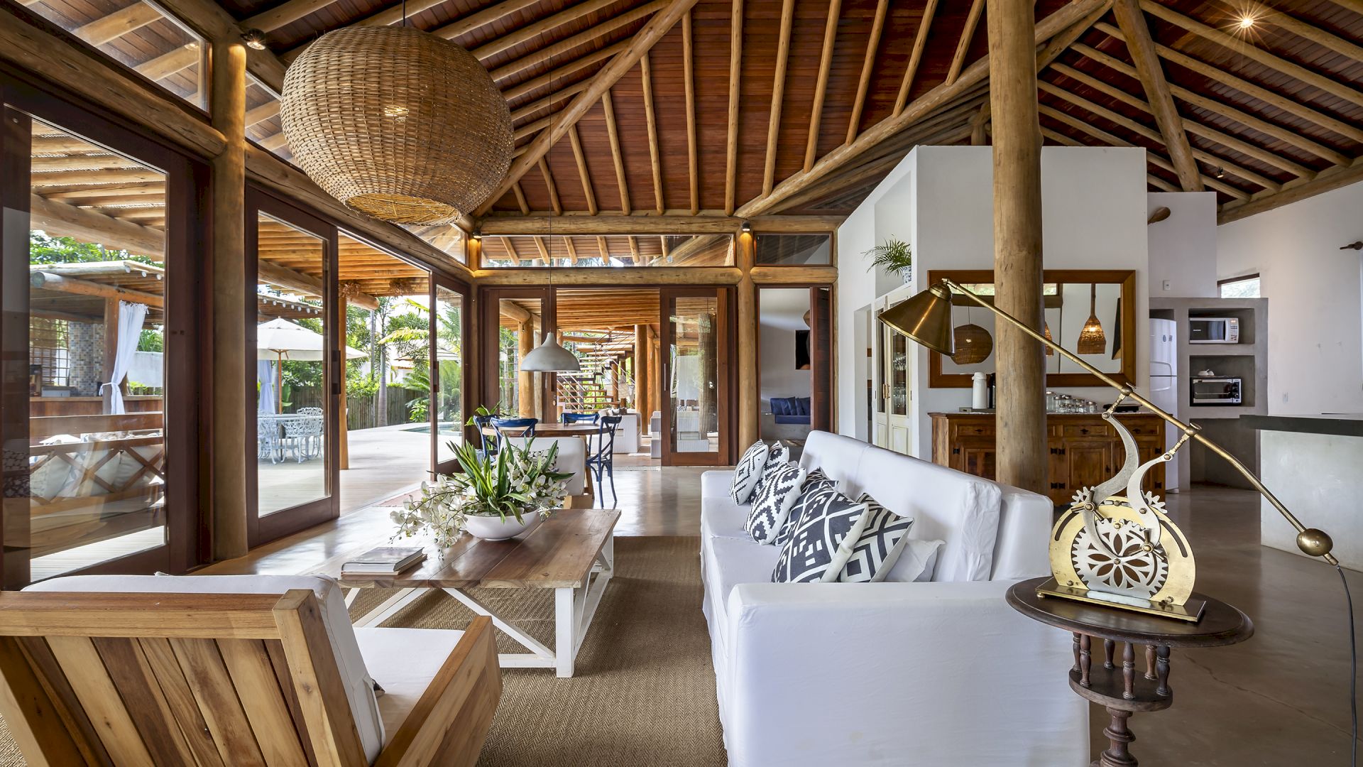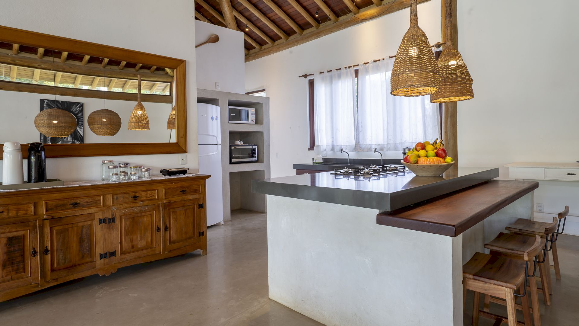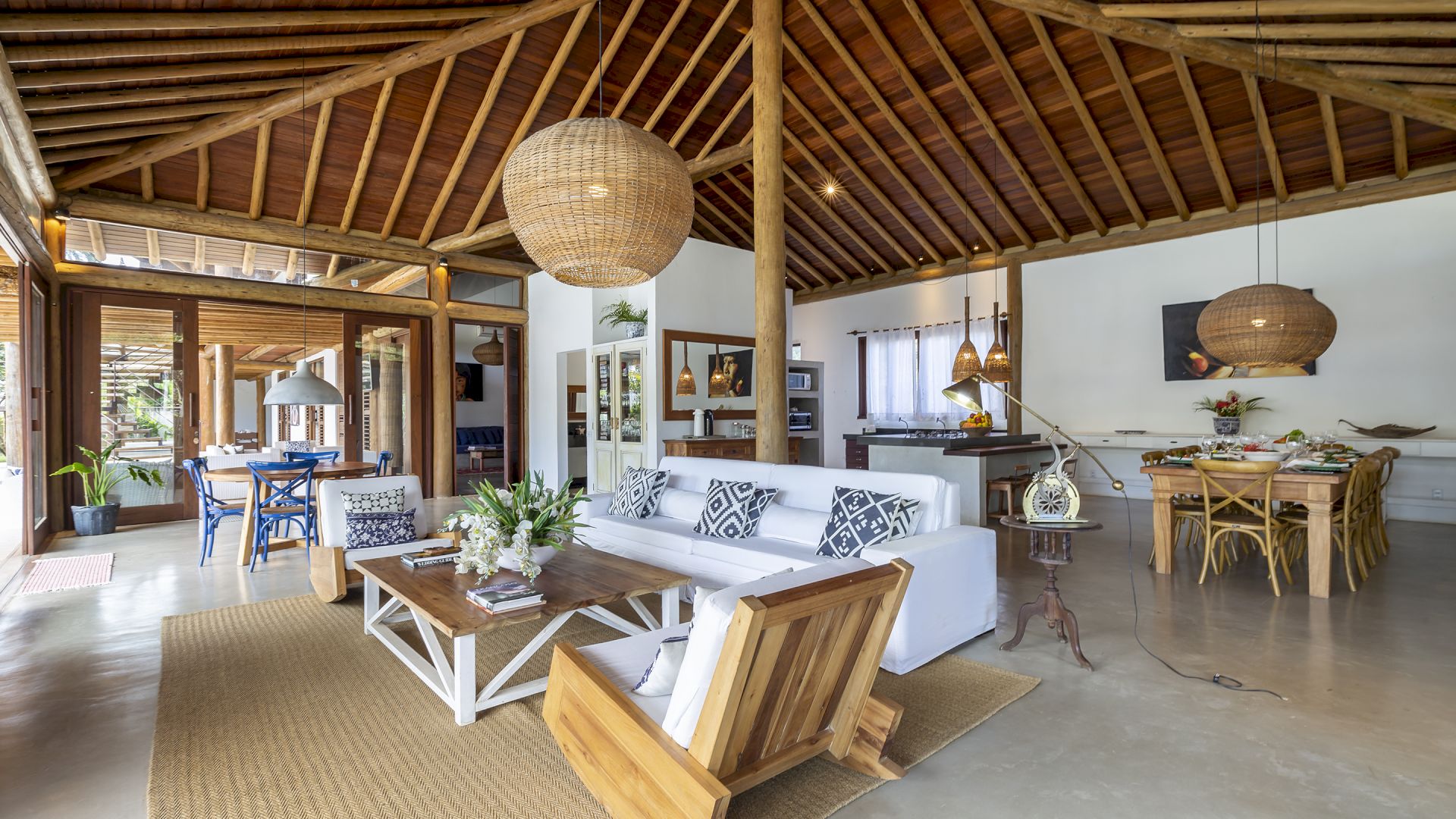 A casa foi desenhada e humanizada seguindo a essência baiana com uma lindÃssima curadoria de decoração de objetos locais. Todos os cômodos são amplos e com pé de direito alto que deixa a casa bem ventilada e iluminada. O enxoval de cama e cozinha é completÃssimo.