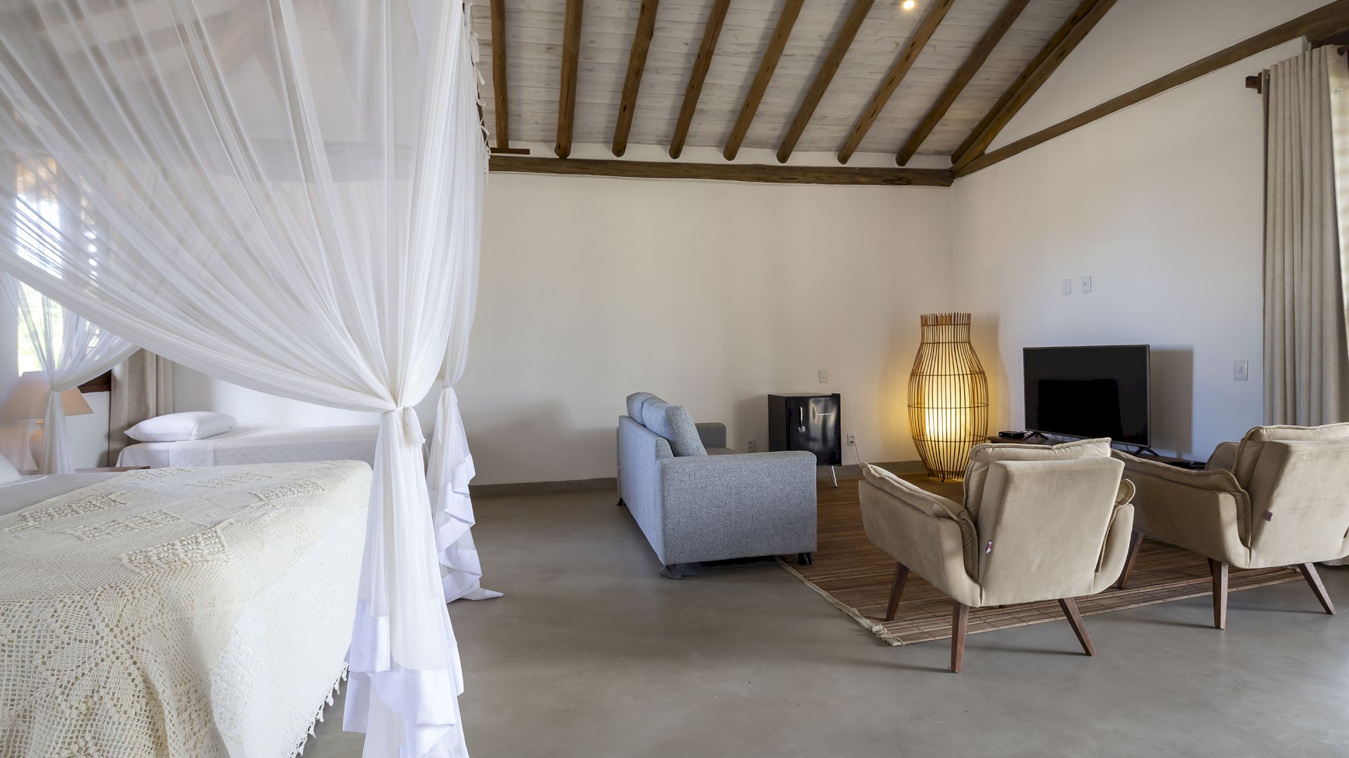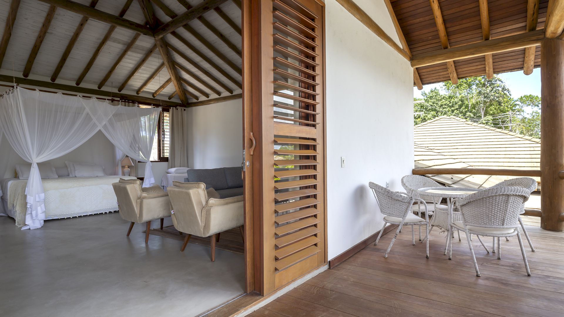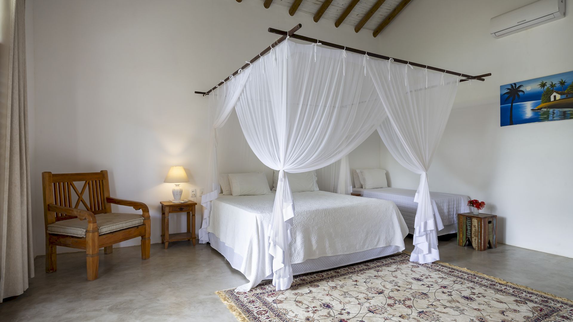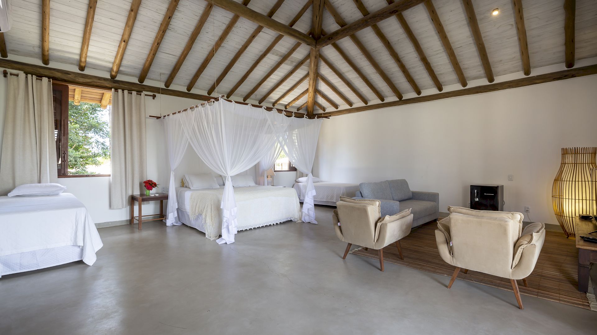 Todas as suÃtes são equipadas com cama king-size, ar condicionado, mosquiteiro e cofre.