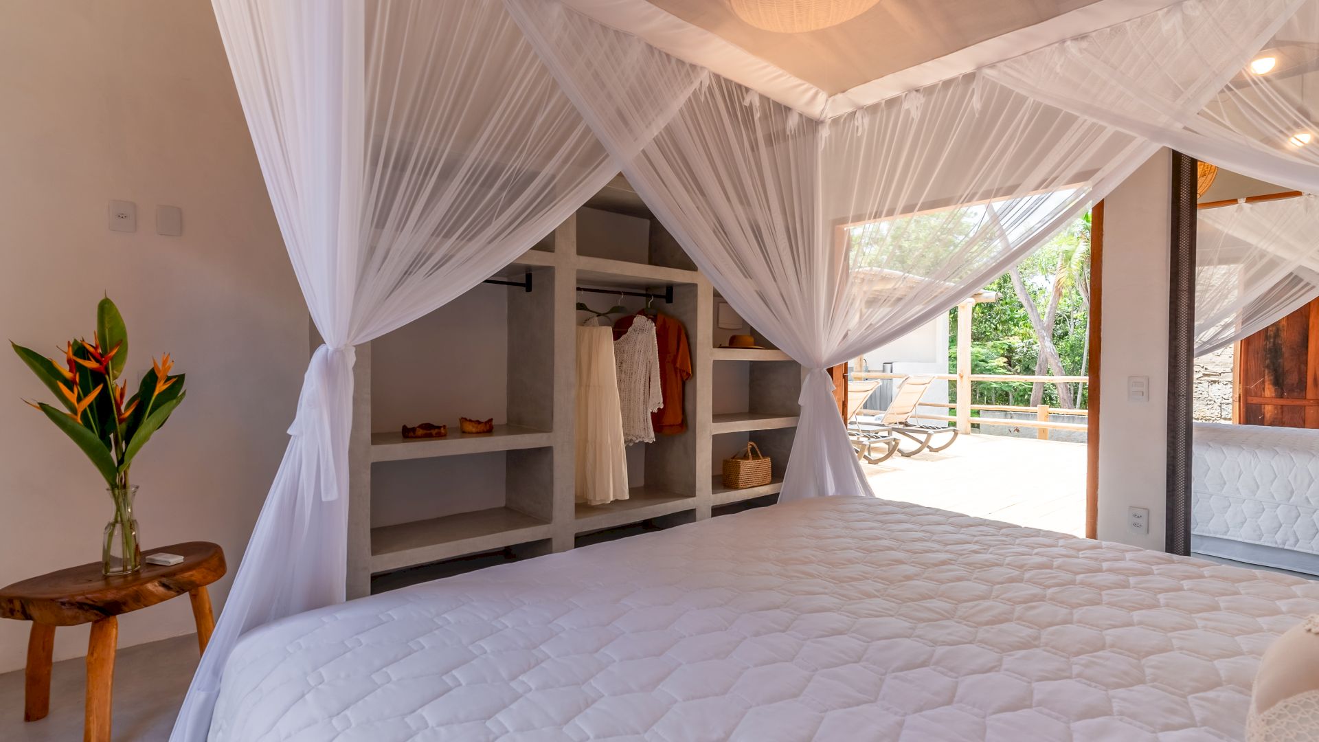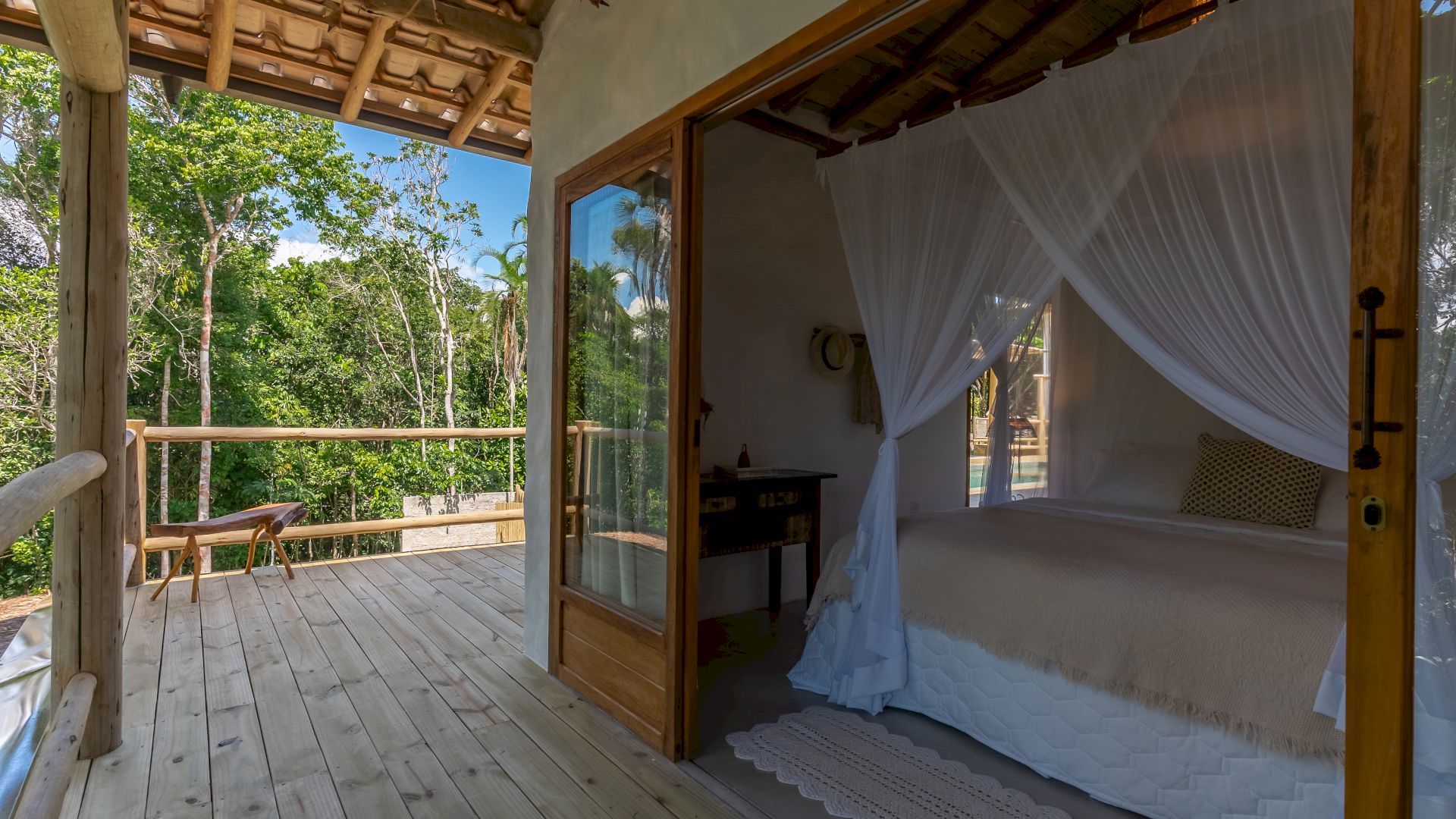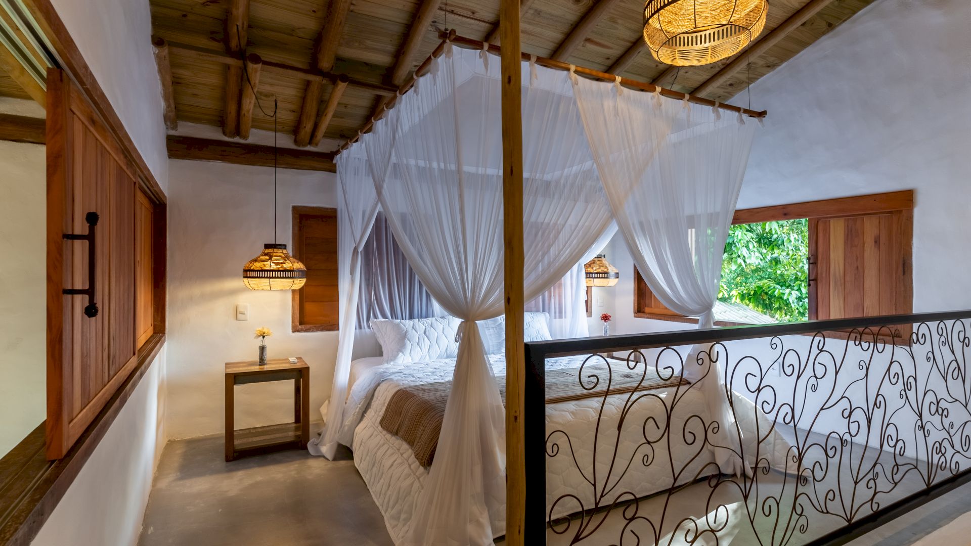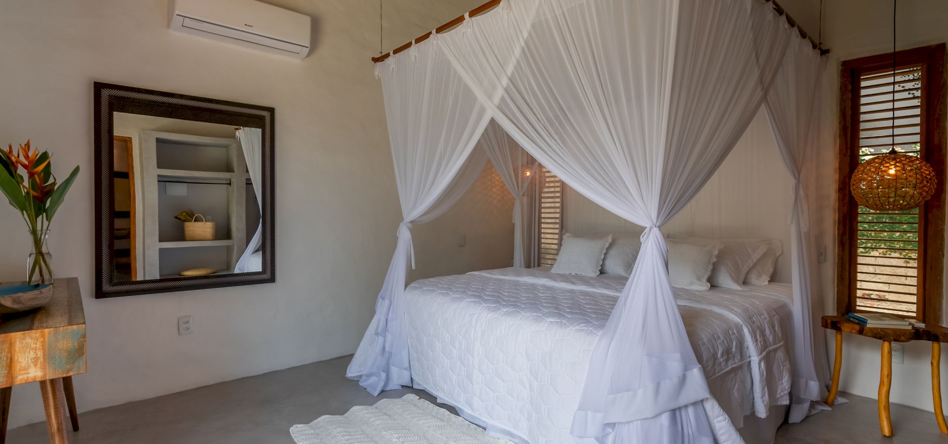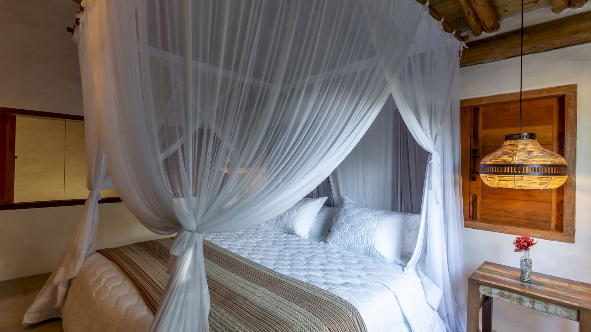 Todas as 4 suítes e o quarto no andar superior são equipadas com cama de King-Size que podem se transformar em duas camas de solteiro, ar condicionado e mosquiteiro. O quarto no andar superior utiliza no banheiro do piso térreo.