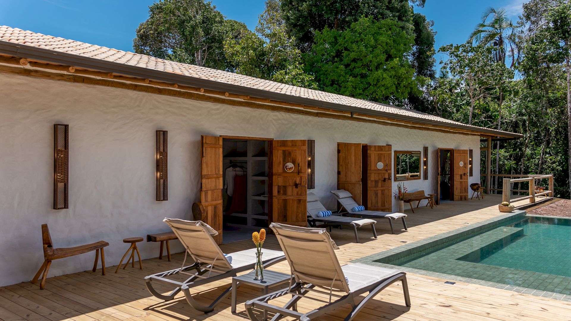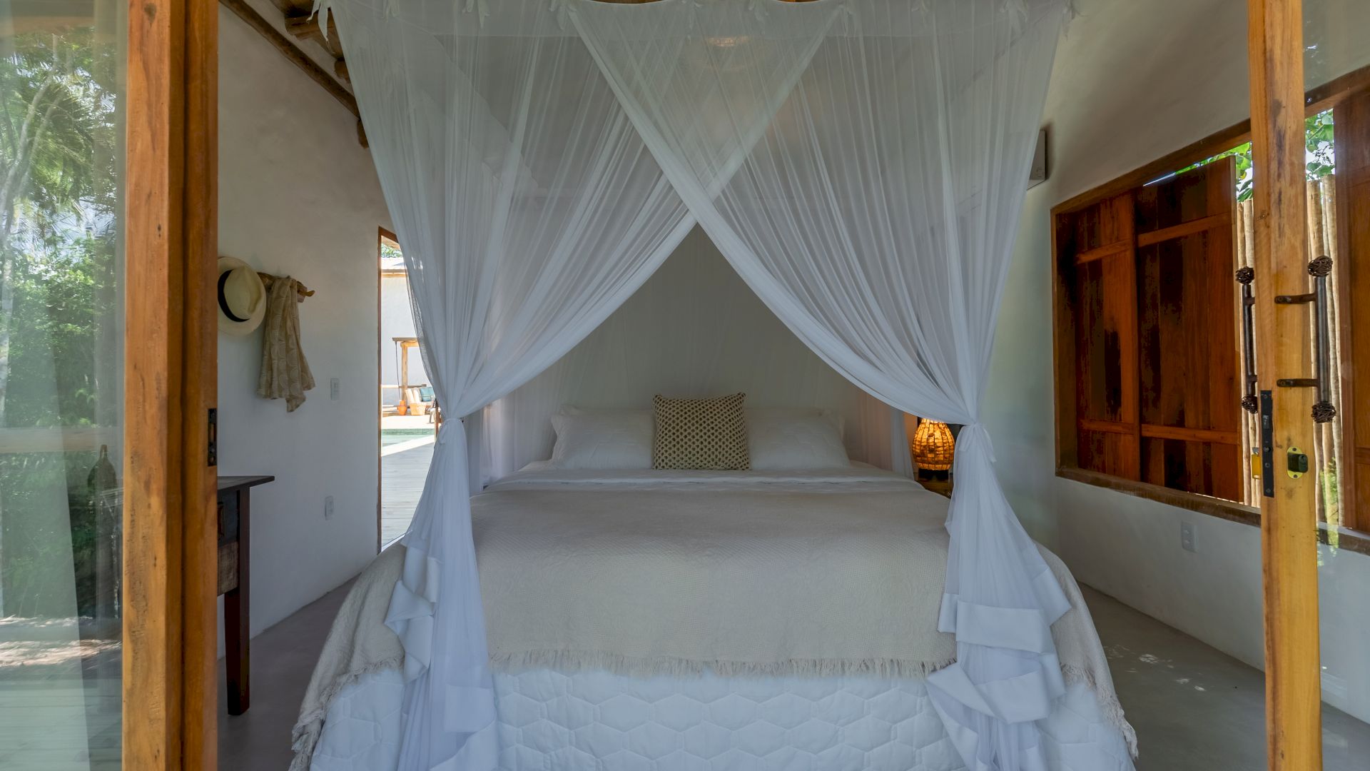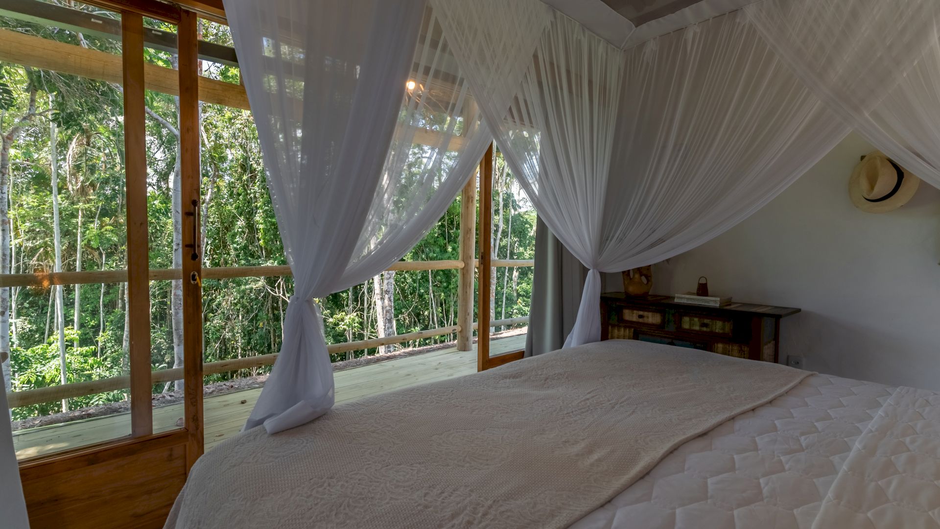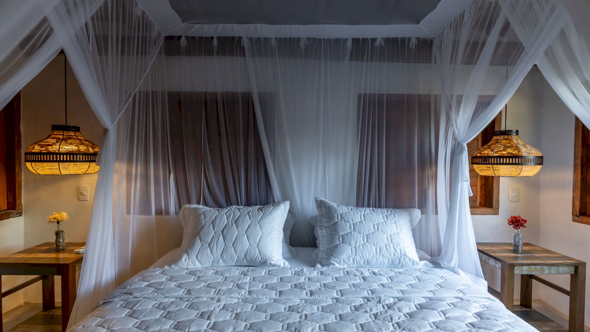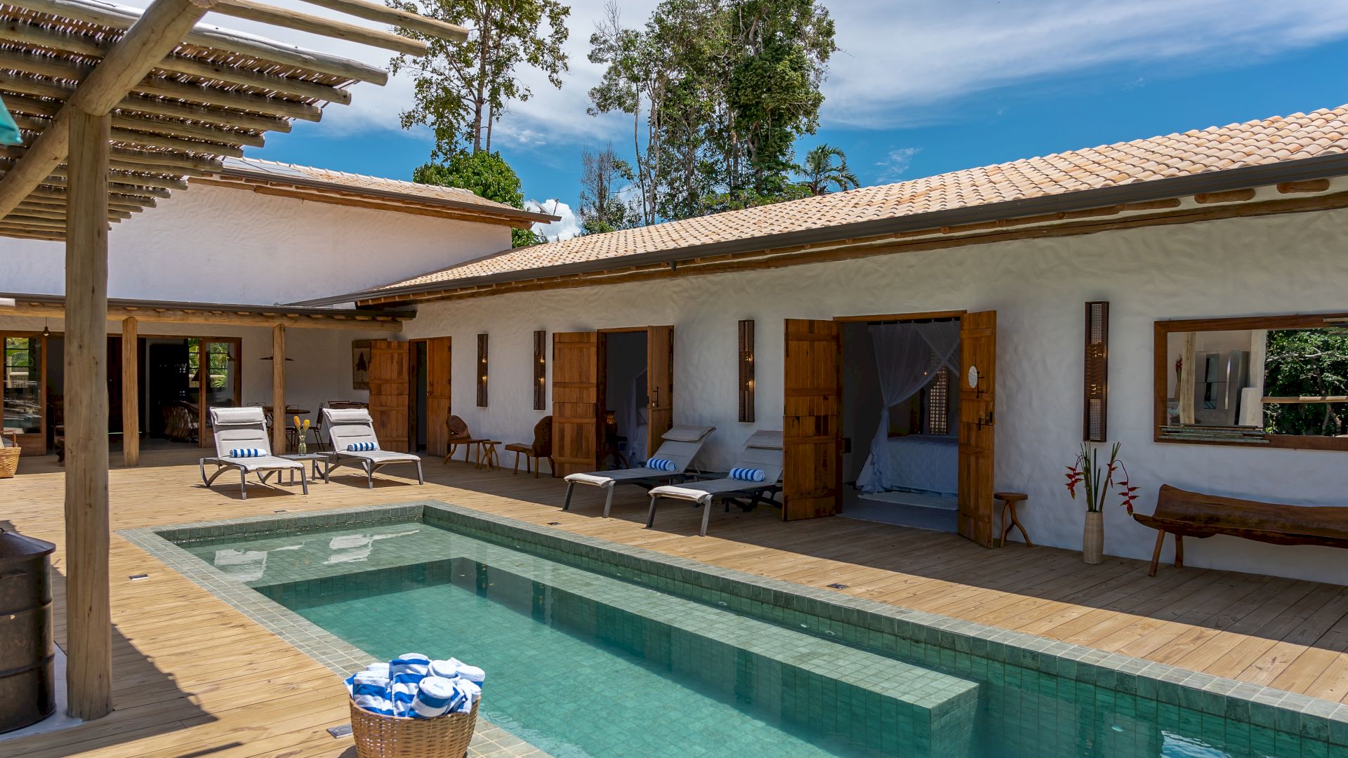 Todas as 4 suítes e o quarto no andar superior são equipadas com cama de King-Size que podem se transformar em duas camas de solteiro, ar condicionado e mosquiteiro. O quarto no andar superior utiliza no banheiro do piso térreo.