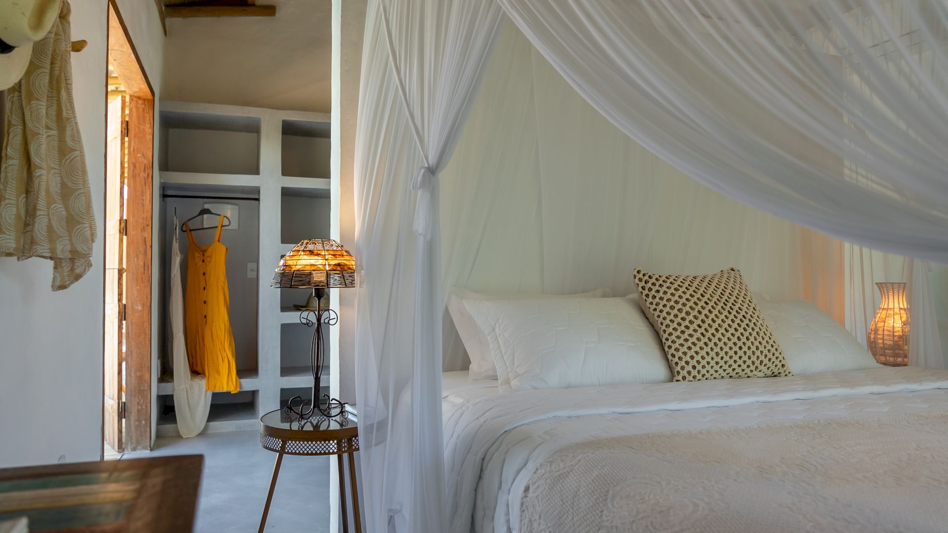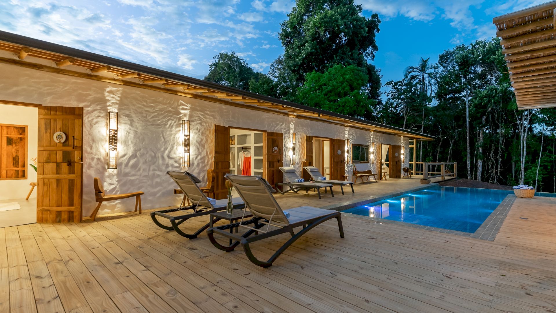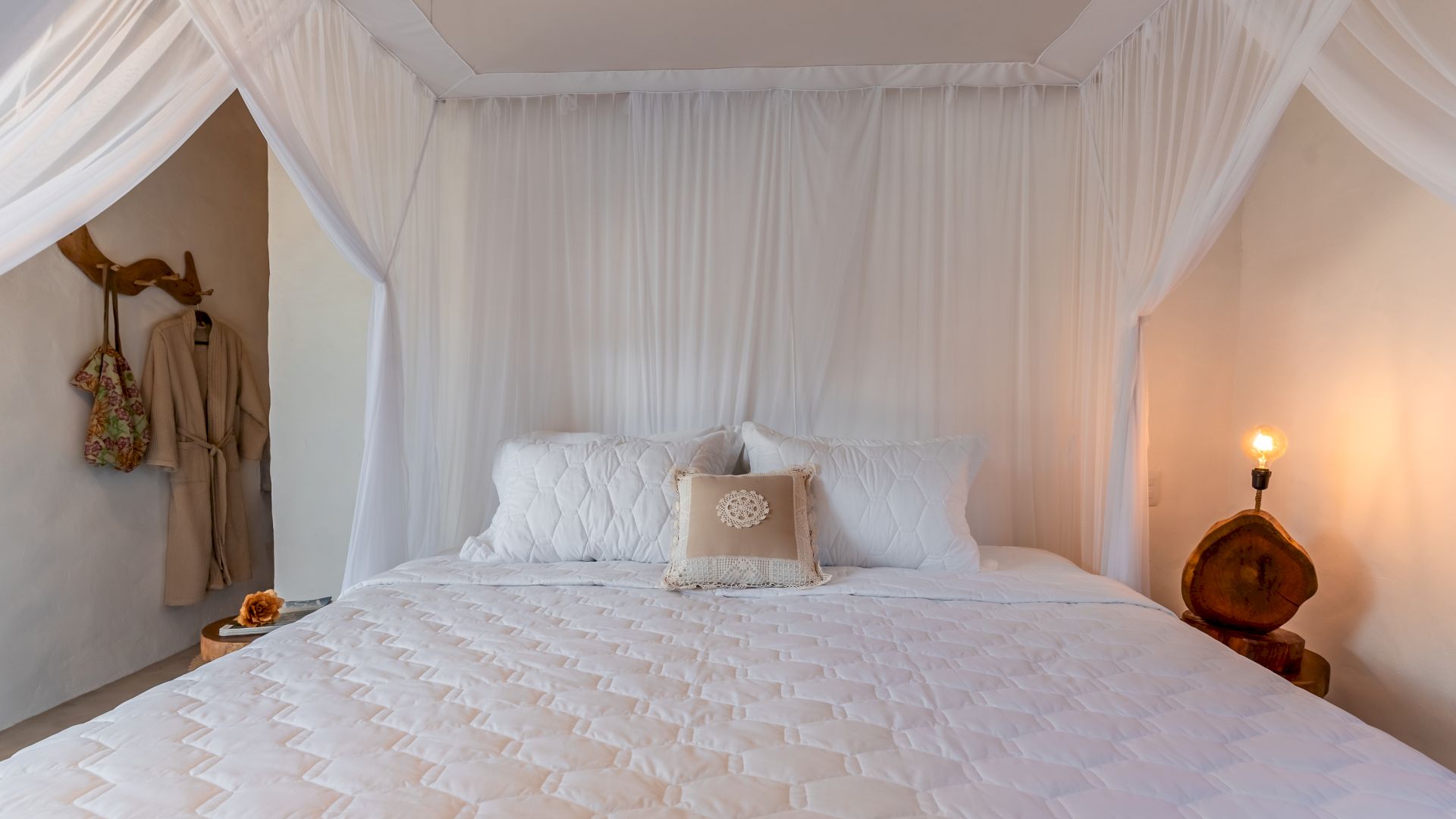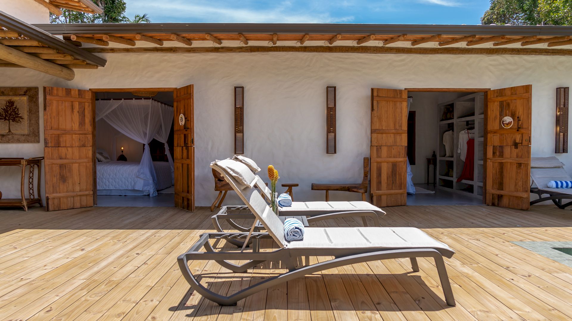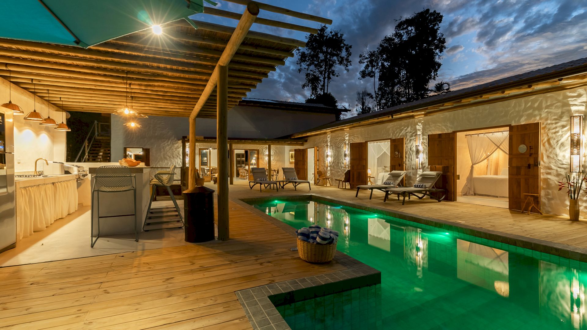 Todas as 4 suítes e o quarto no andar superior são equipadas com cama de King-Size que podem se transformar em duas camas de solteiro, ar condicionado e mosquiteiro. O quarto no andar superior utiliza no banheiro do piso térreo.