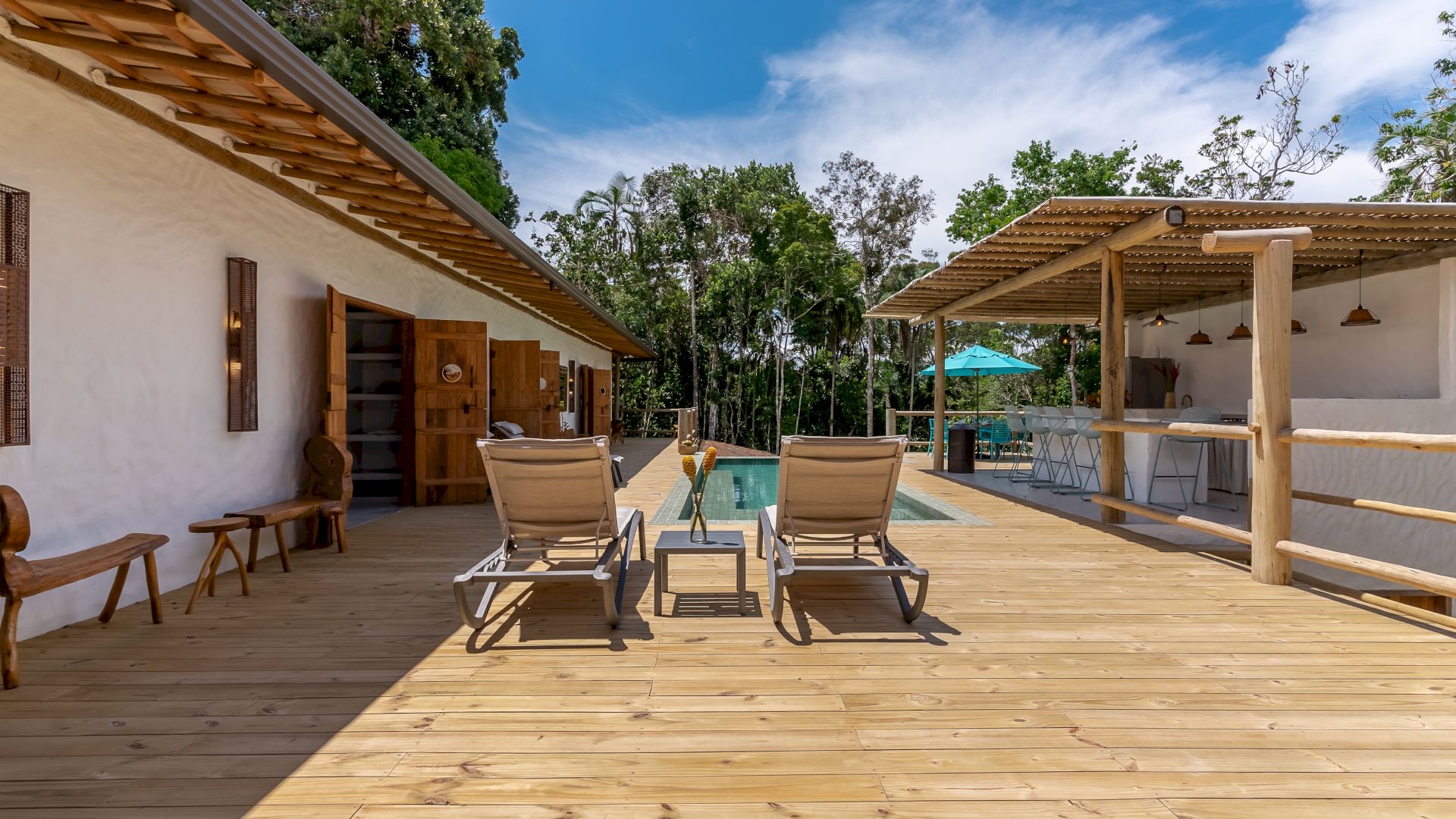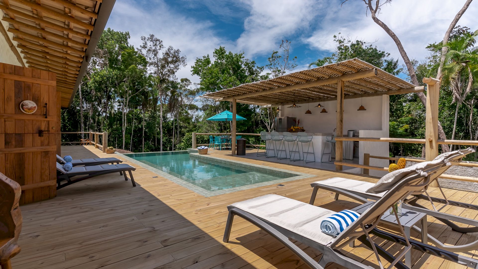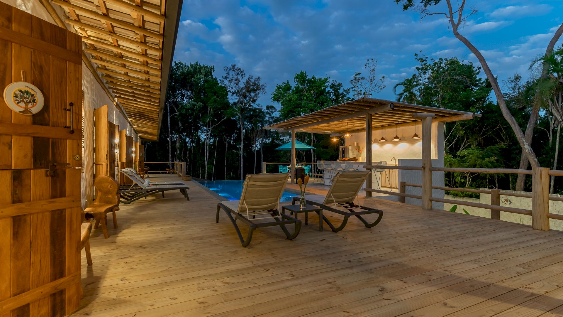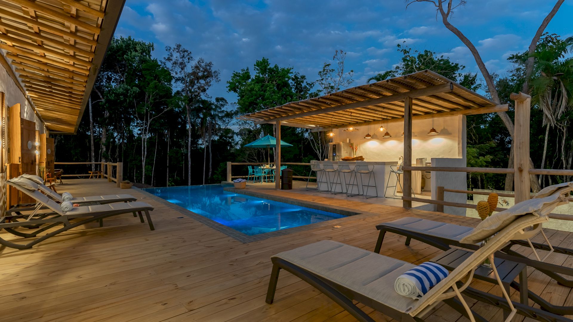 Área de lazer completa com piscina, Espaço Gourmet com Churrasqueira, Sala de TV, Sala de Jantar e um deck de madeira com espreguiçadeiras de sol.