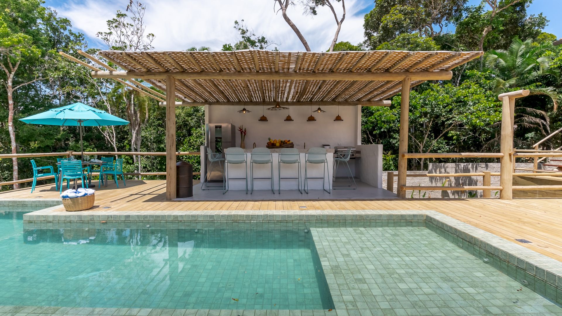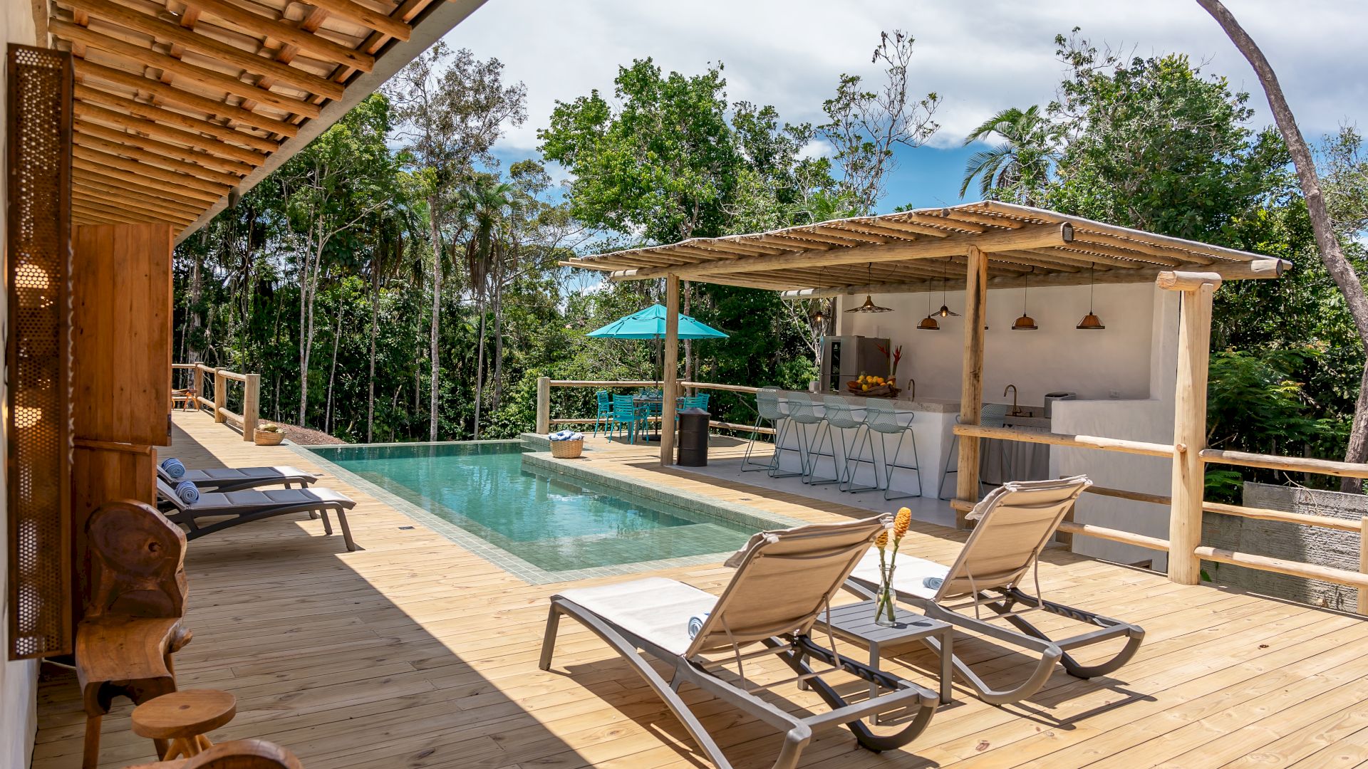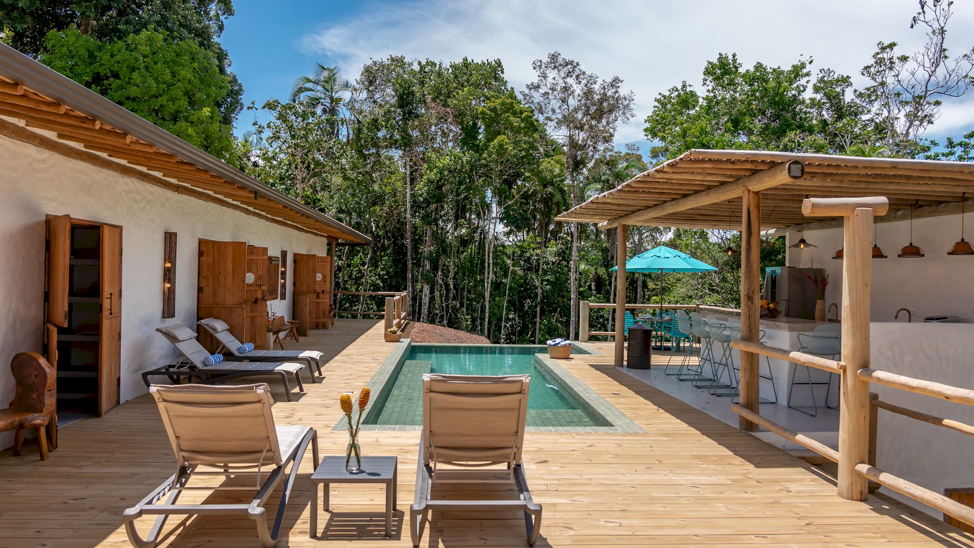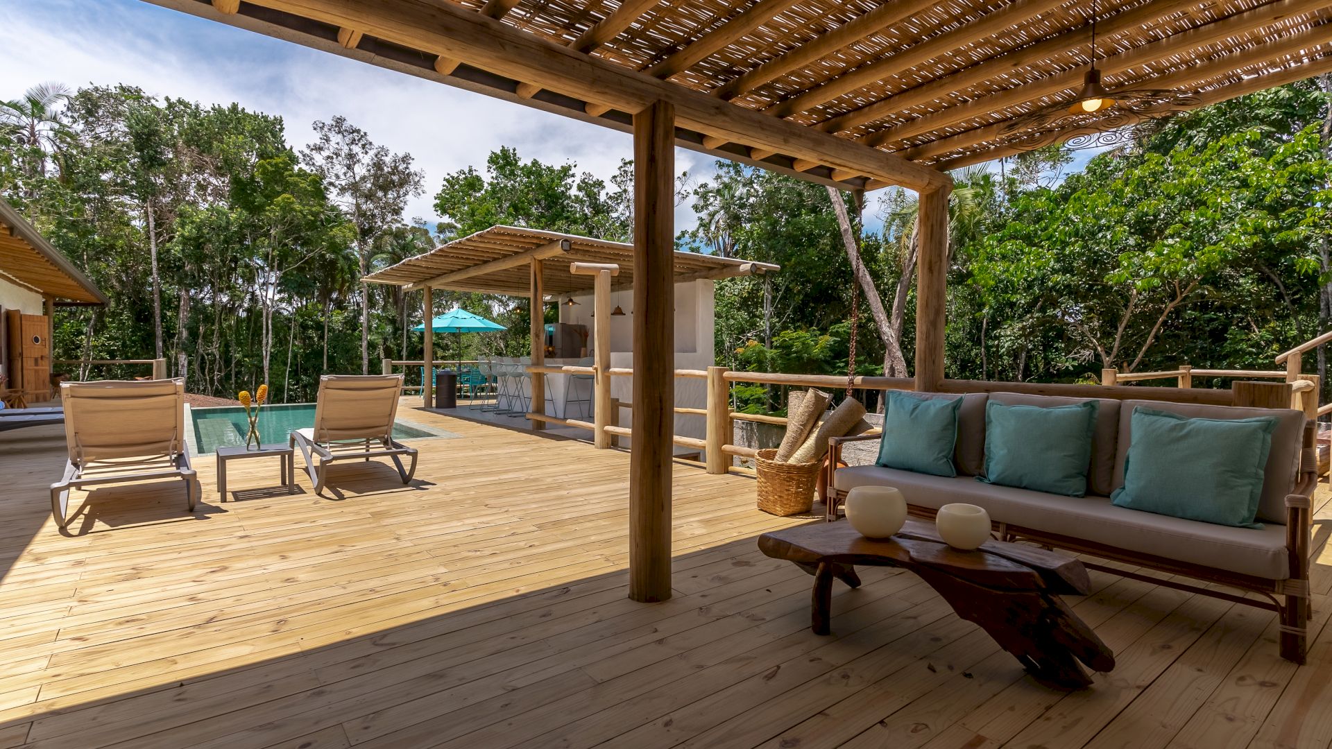 Área de lazer completa com piscina, Espaço Gourmet com Churrasqueira, Sala de TV, Sala de Jantar e um deck de madeira com espreguiçadeiras de sol.