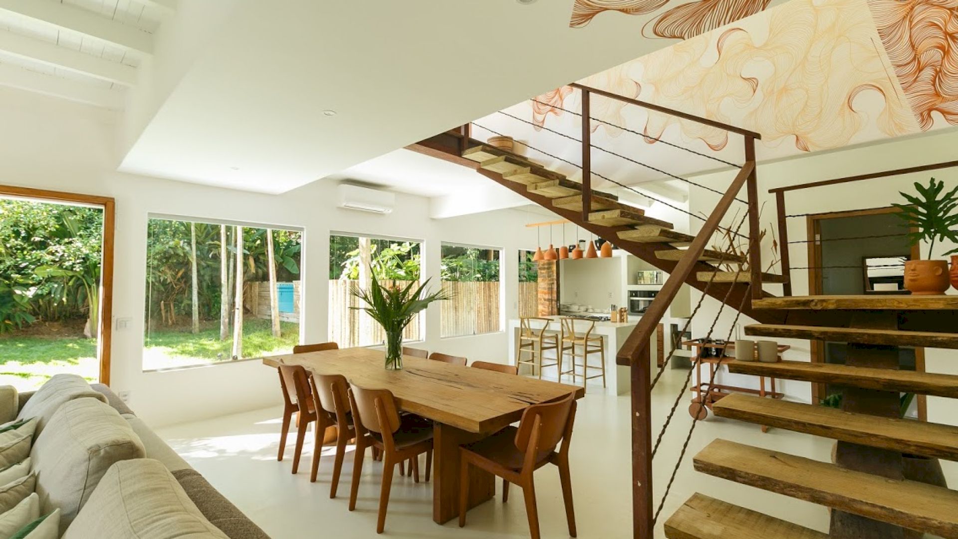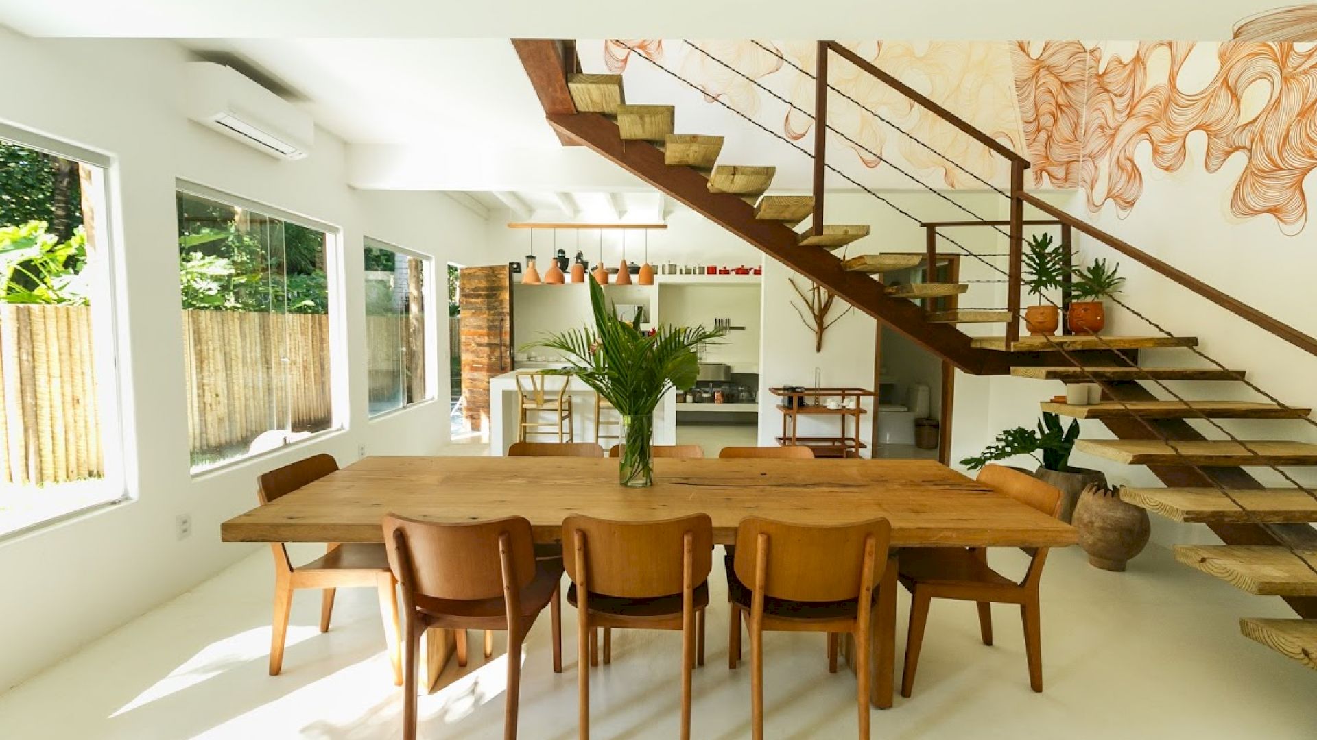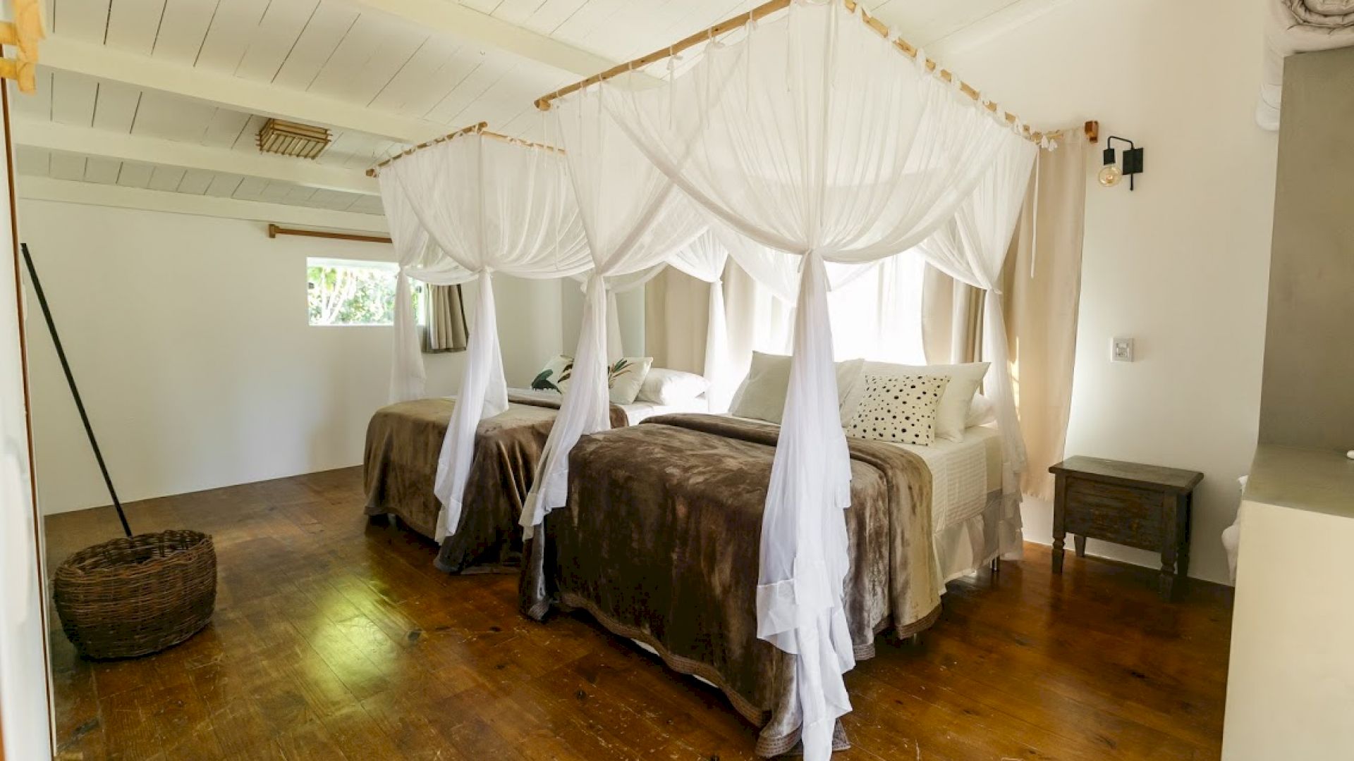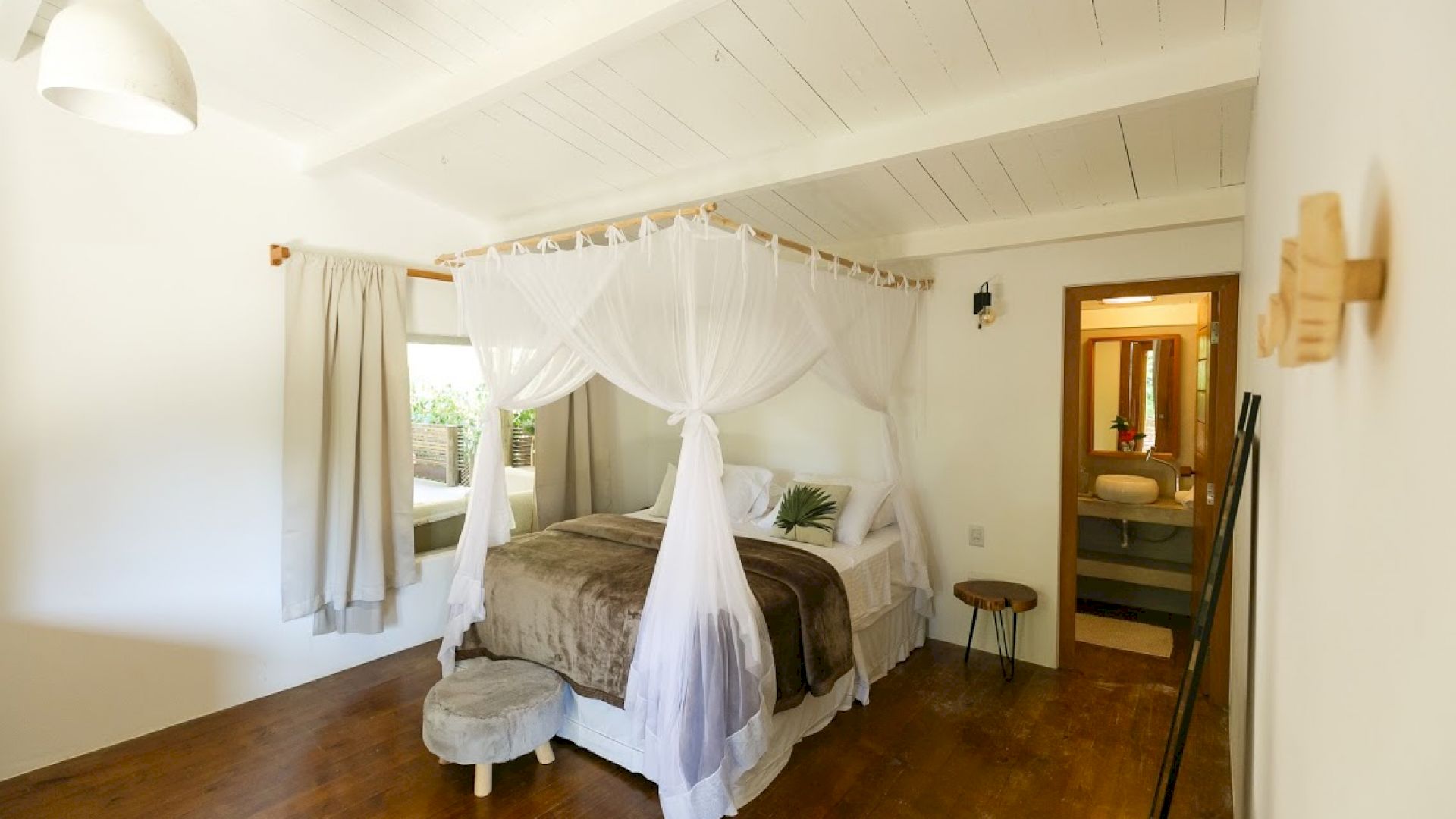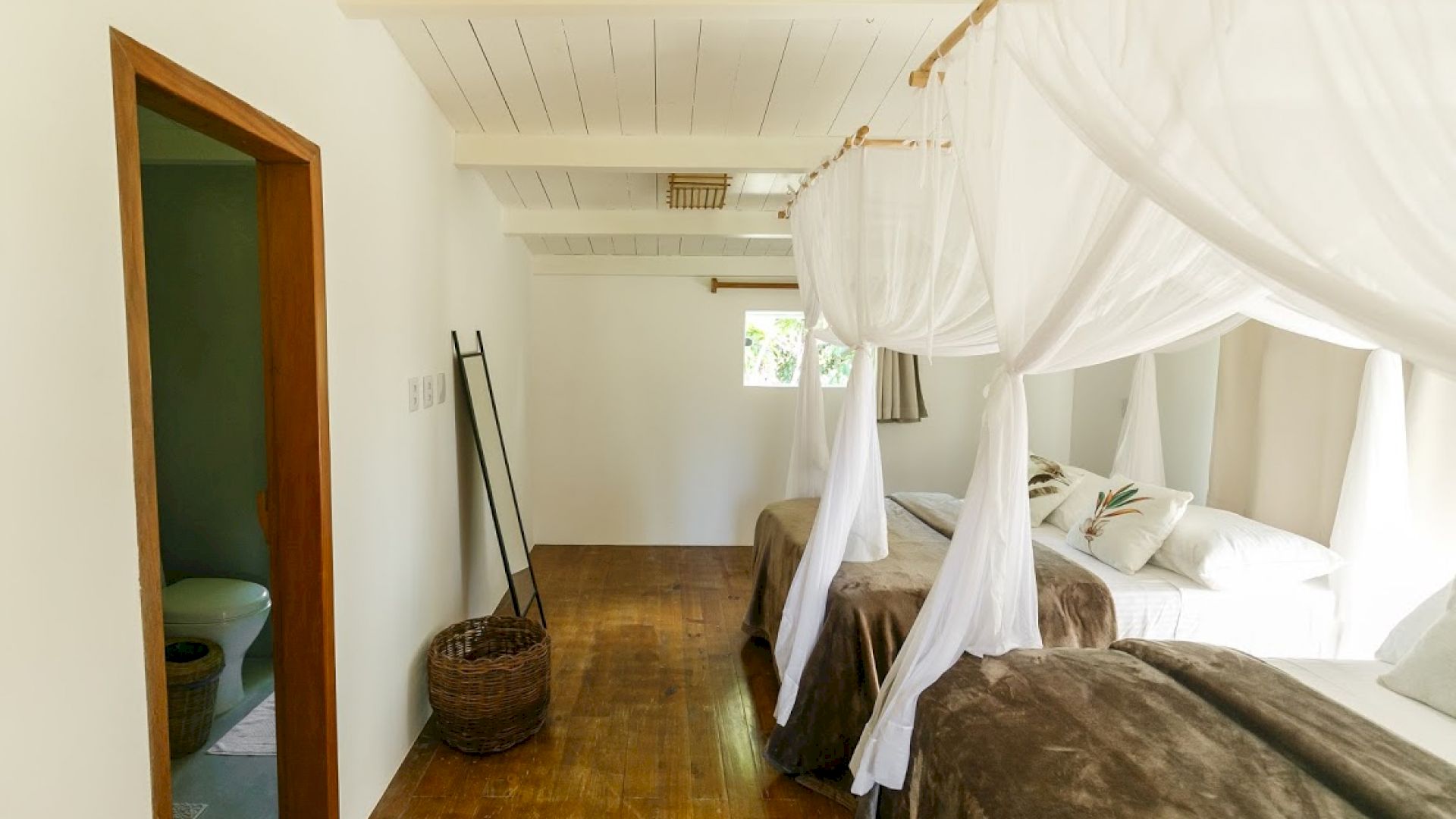 A casa é composta por 4 suítes que acomodam 8 hóspedes confortavelmente.